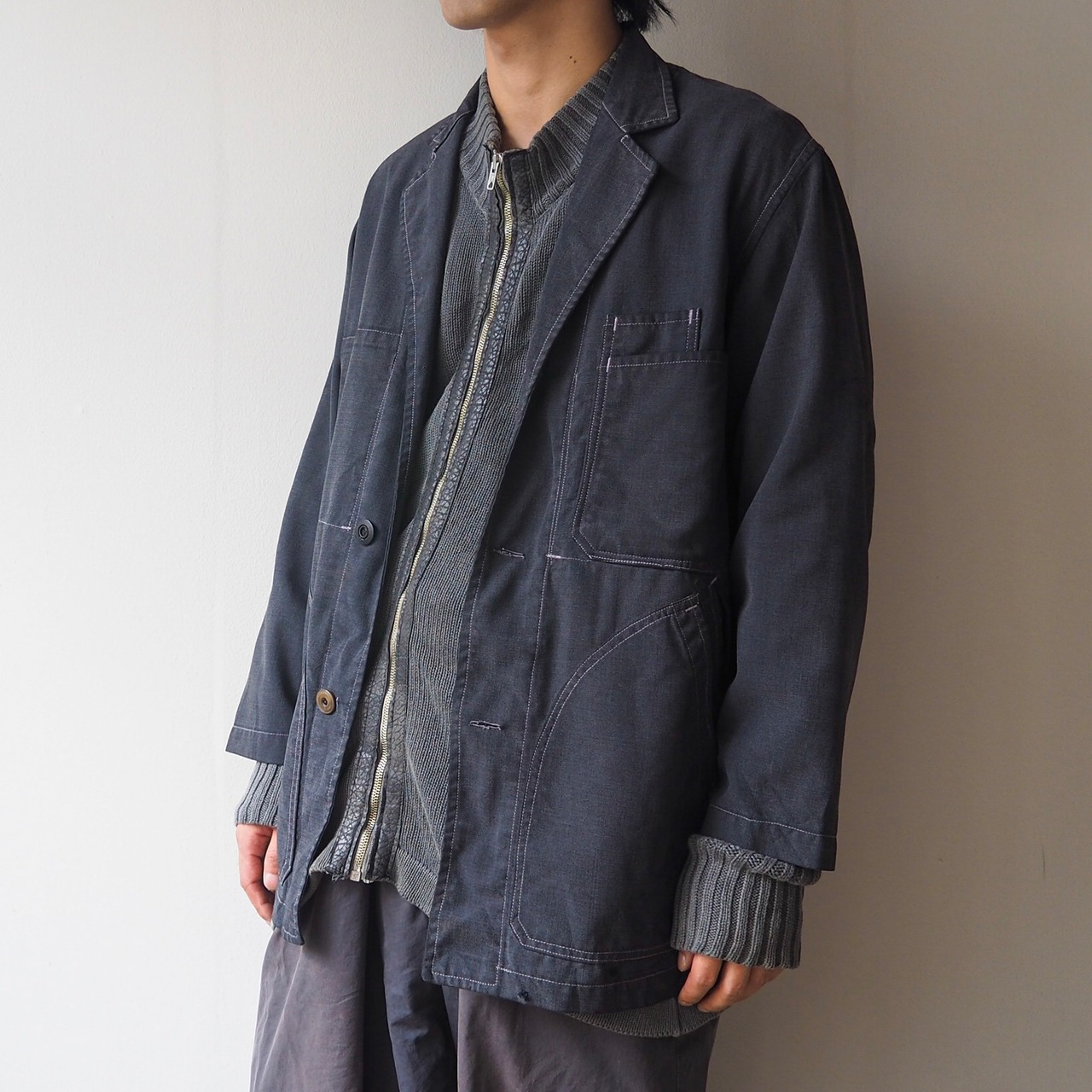フロント三つボタンによる緩いテーラード。