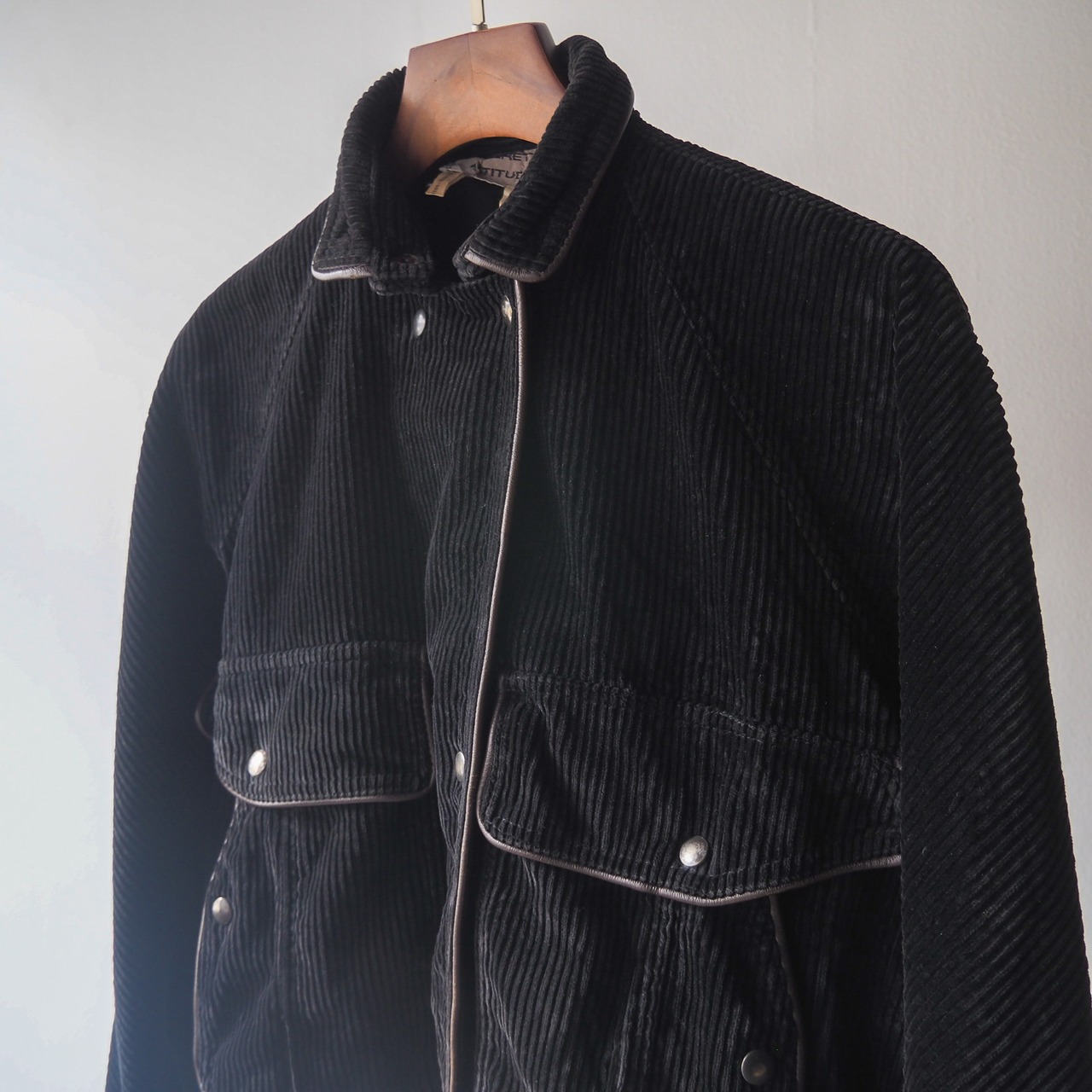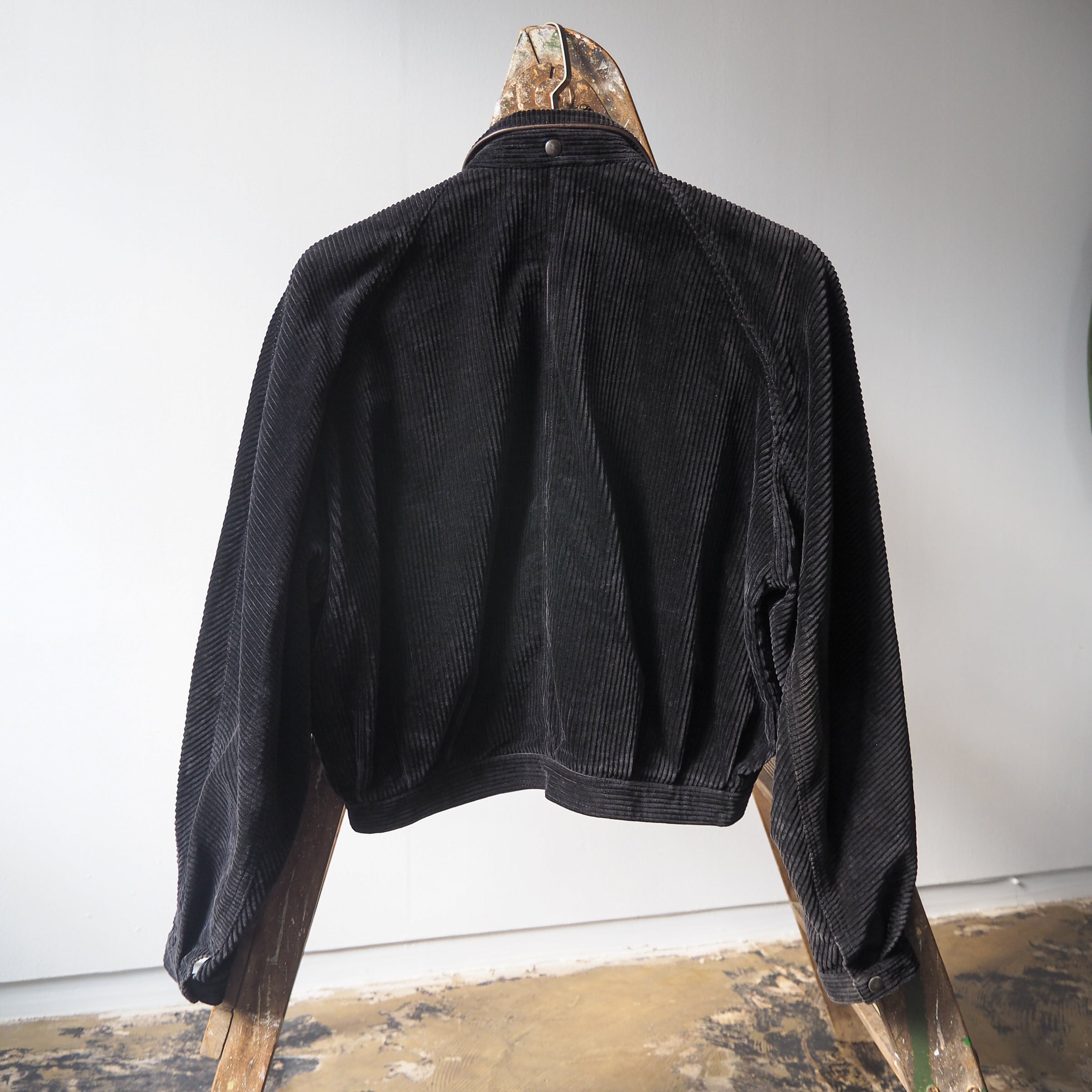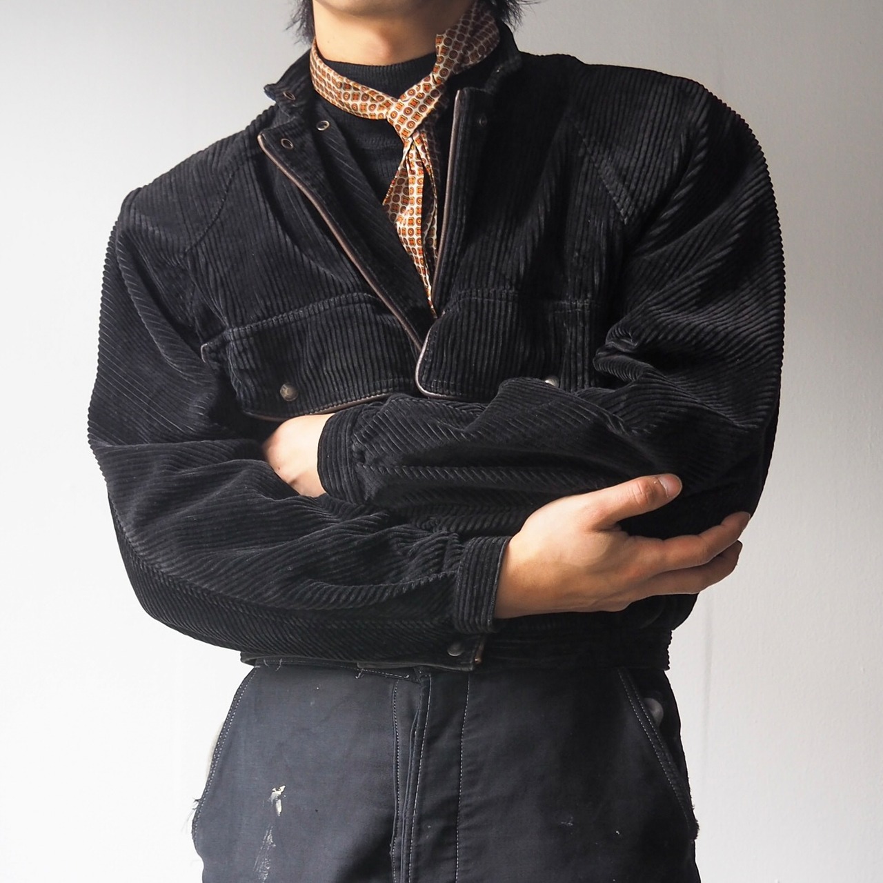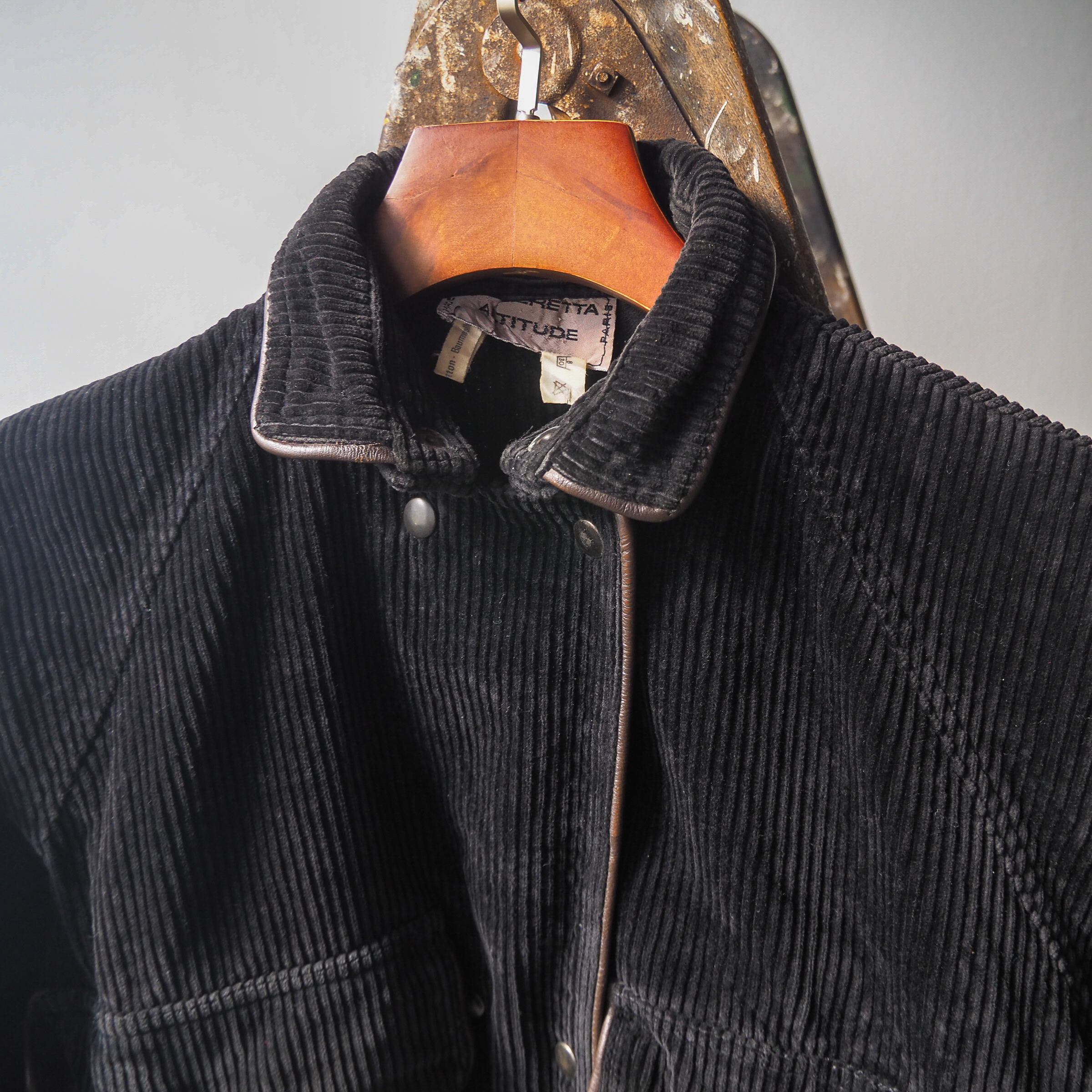 シャープな着丈に艶めくブラックコーデュロイ生地。