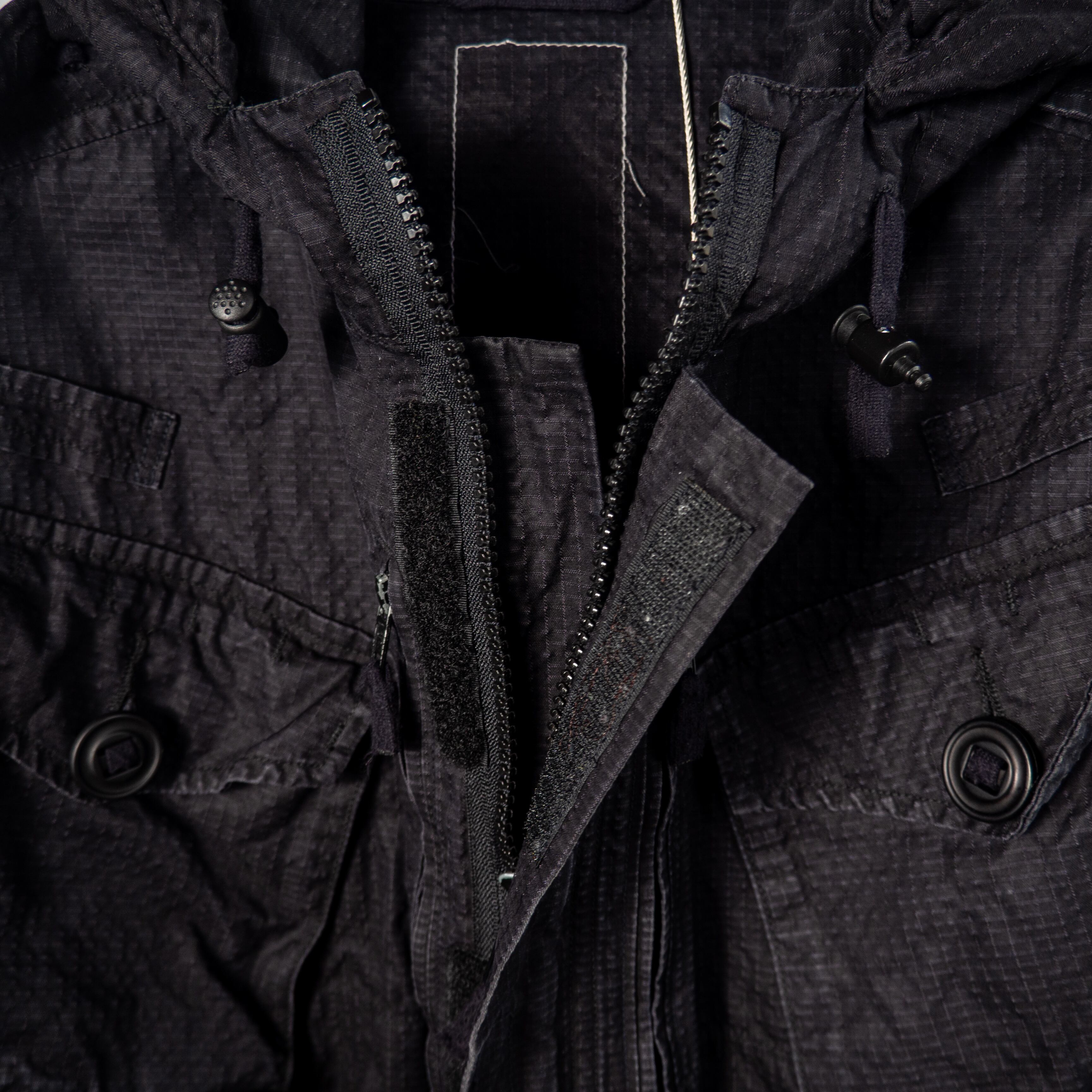 第二次世界大戦中に軍服やパラシュートの強化の為に開発されたRip(避ける)Stop(防止)生地。ナイロン繊維の太番手糸を格子状に編み込むことで生まれる軽さと丈夫さが特徴の生地です。