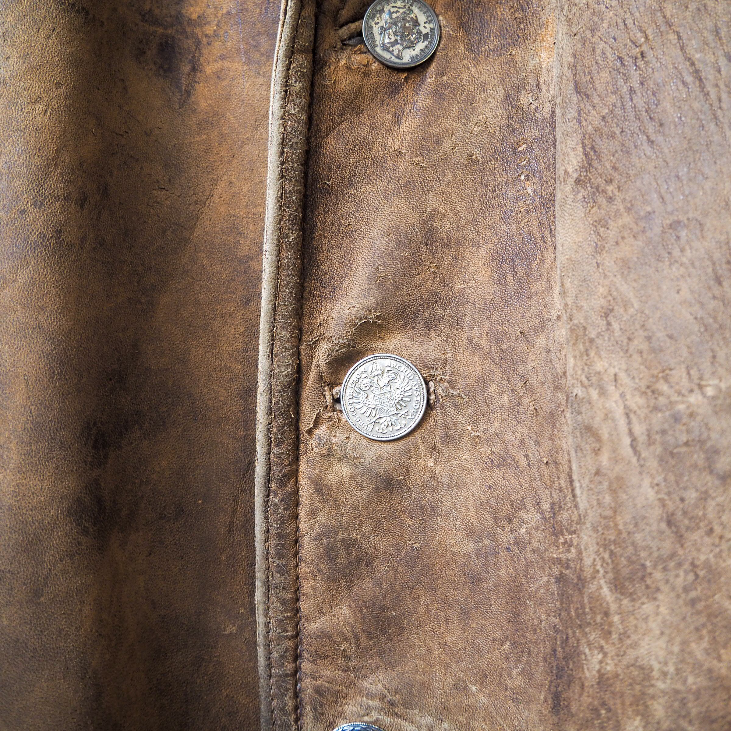 フロントボタンは柿の木ボタンがオリジナルですが、こちらはアンティークコインを加工したものに付け替えられております。また、所々に銀面の剥がれ、スレ、傷当がございます。あくまでヴィンテージ品として捉え、ご理解いただける方にご検討をお勧め致します。とは言えおよそ80年前に使用されていた軍服装品、ましてやレザー。使用されていた状況、時代背景を鑑みるとコンディションとしてはかなり良い方なのではないでしょうか。