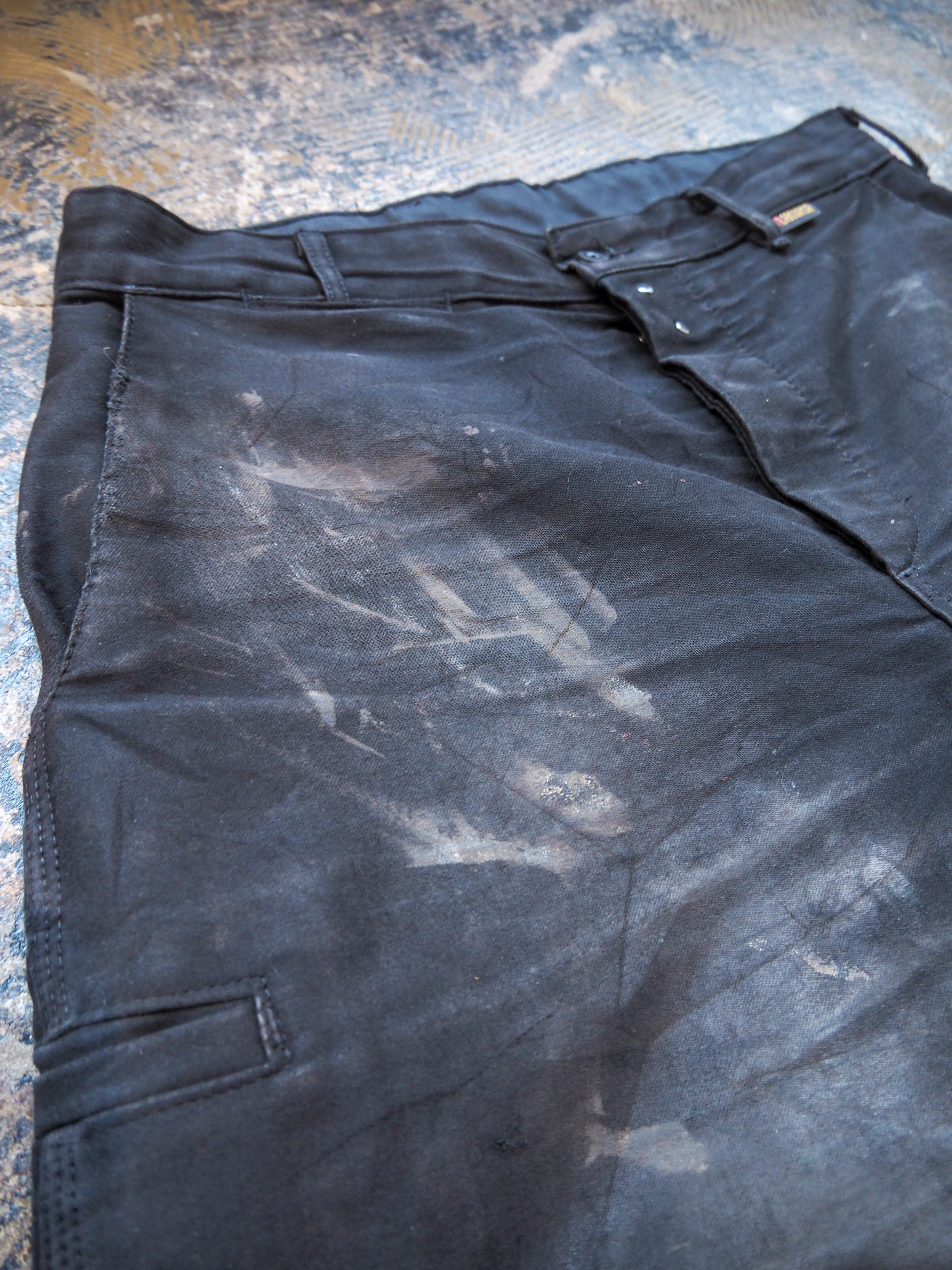 墨黒のような、全体的に程よく褪色した上品な色味は日々の装いに取り入れやすく、着こなしにも良い雰囲気を持たせてくれます。フロントに飛散したリアルなペンキ痕がまたアクセントになって良いですね。