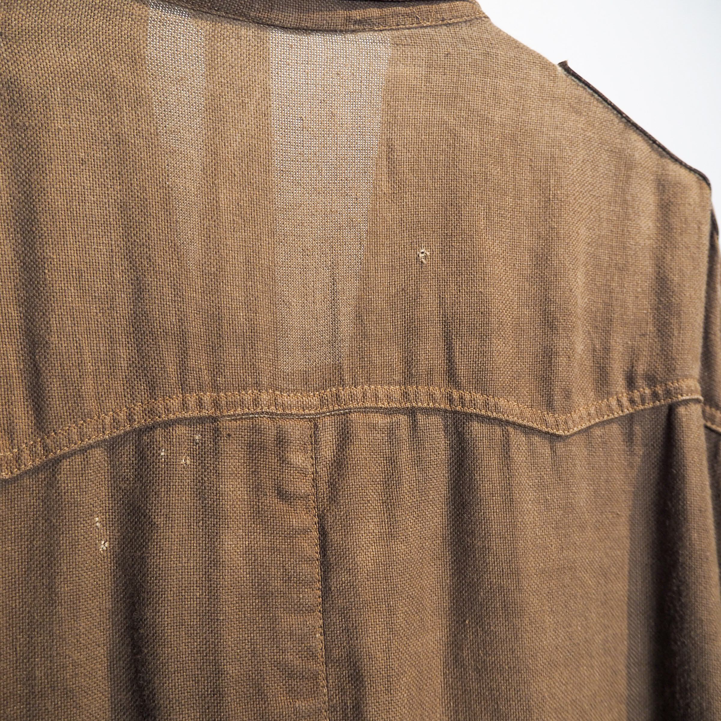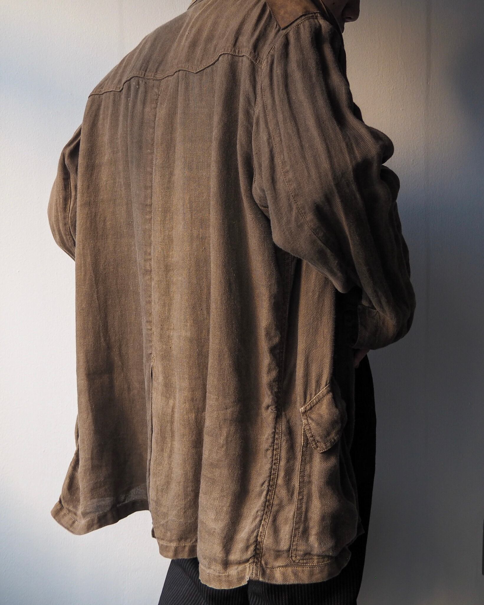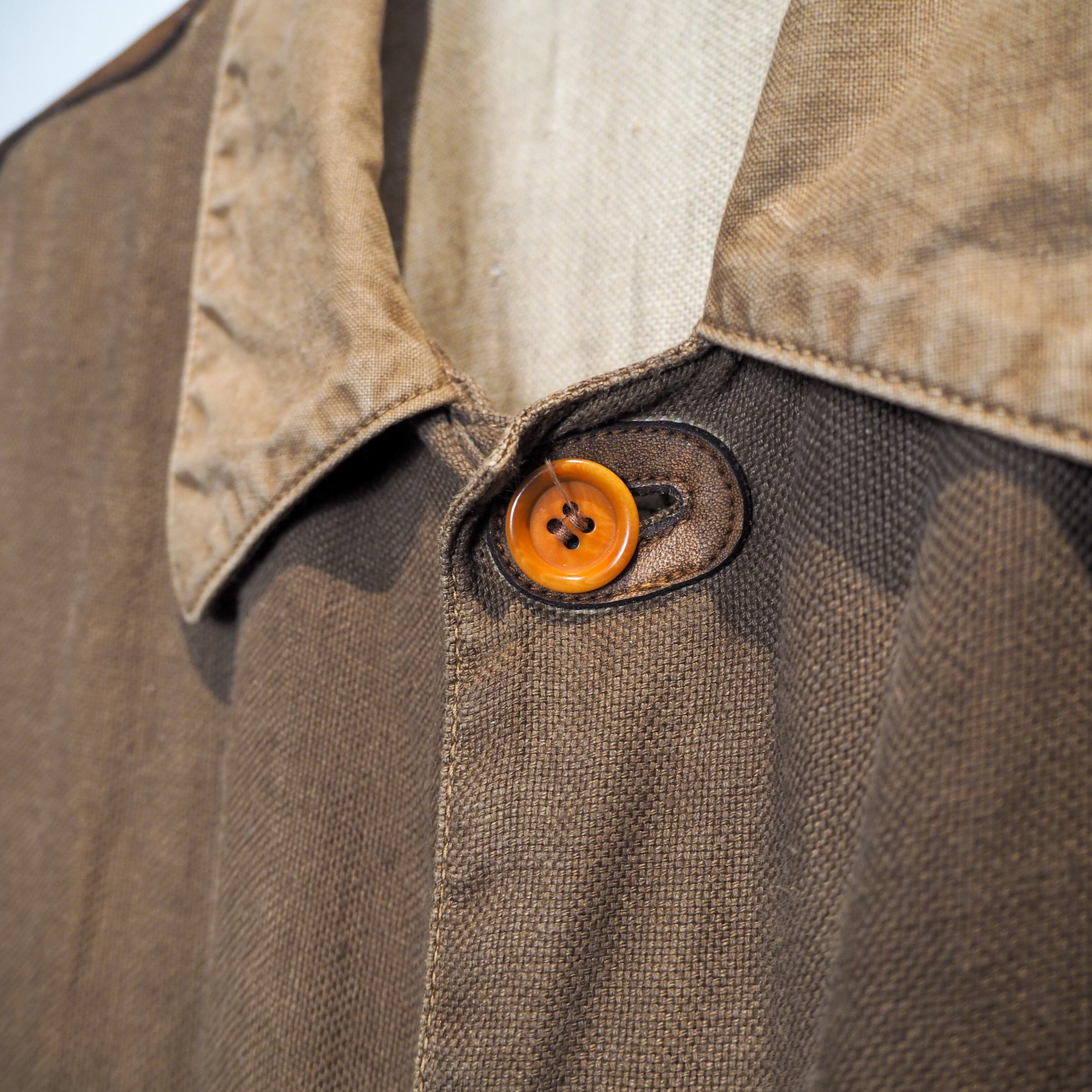 リネン80ポリ20のボディにエポレットを模したレザーの切り替え、ボディに比べより繊細に織り込まれた襟。そこにガーメントダイを施すことで生まれる素材感のコントラスト。体の動きに合わせて陰影を伴うリネン生地。痺れます。