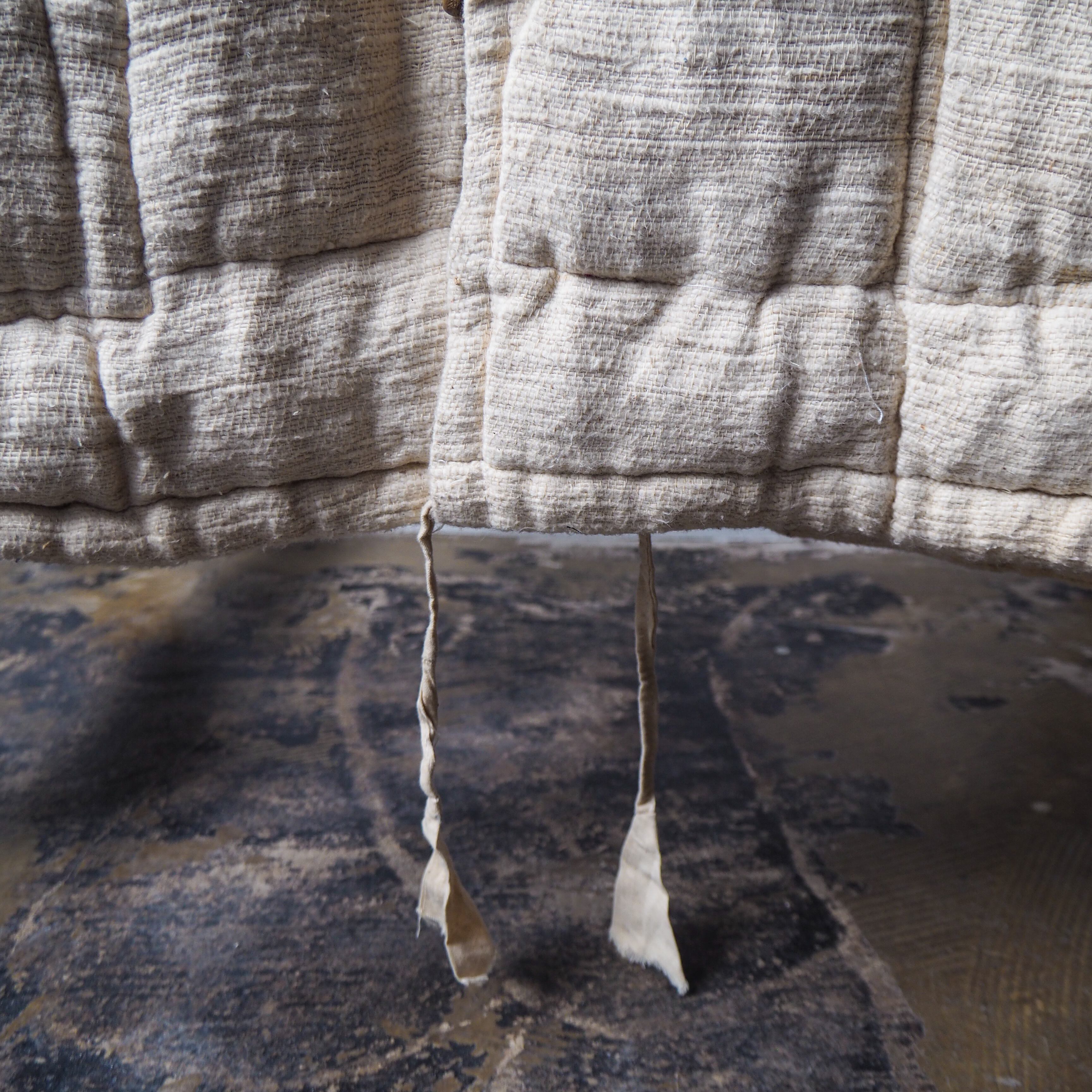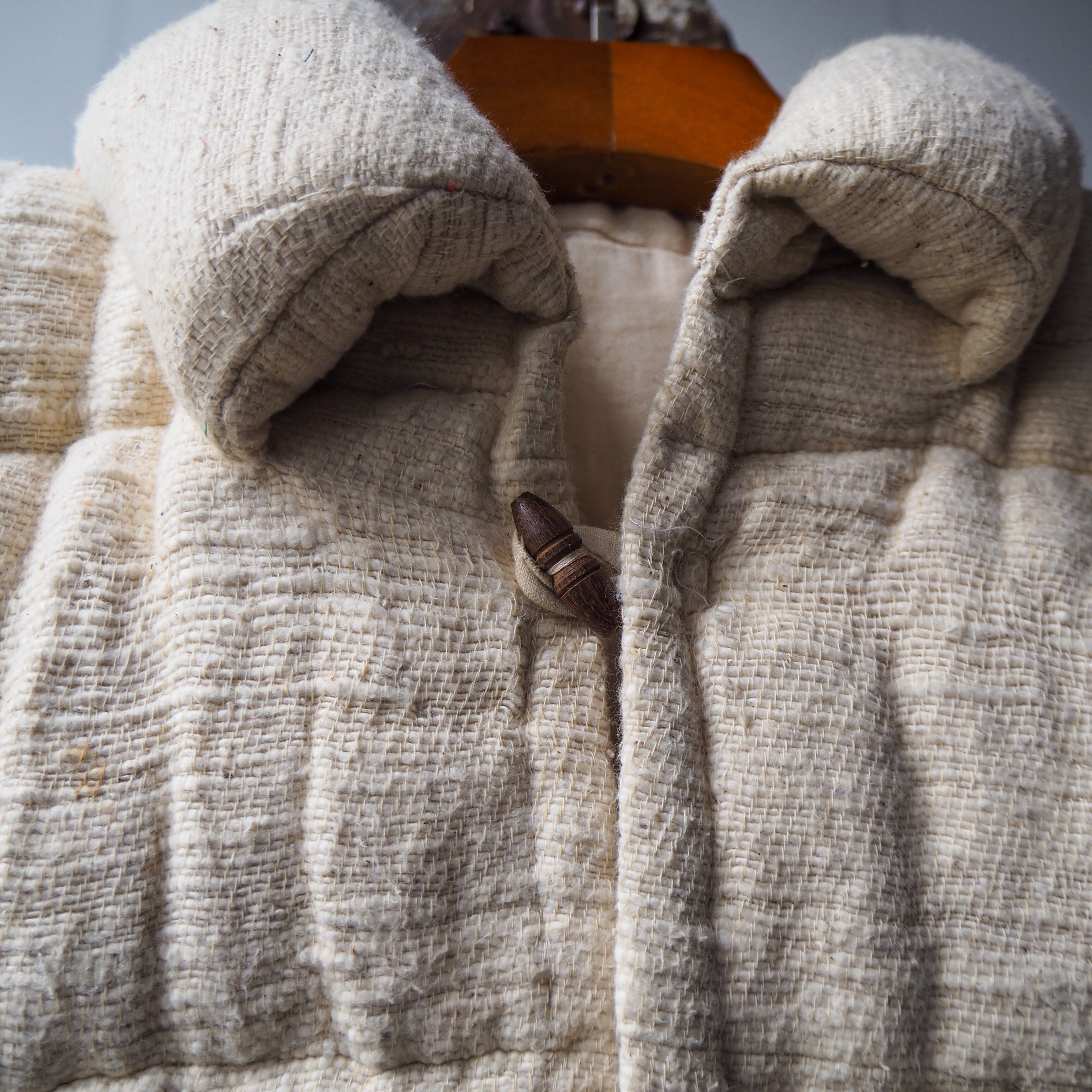 詳細不明、原綿に近いコットン素材で構成されるキルティングベストのご紹介です。