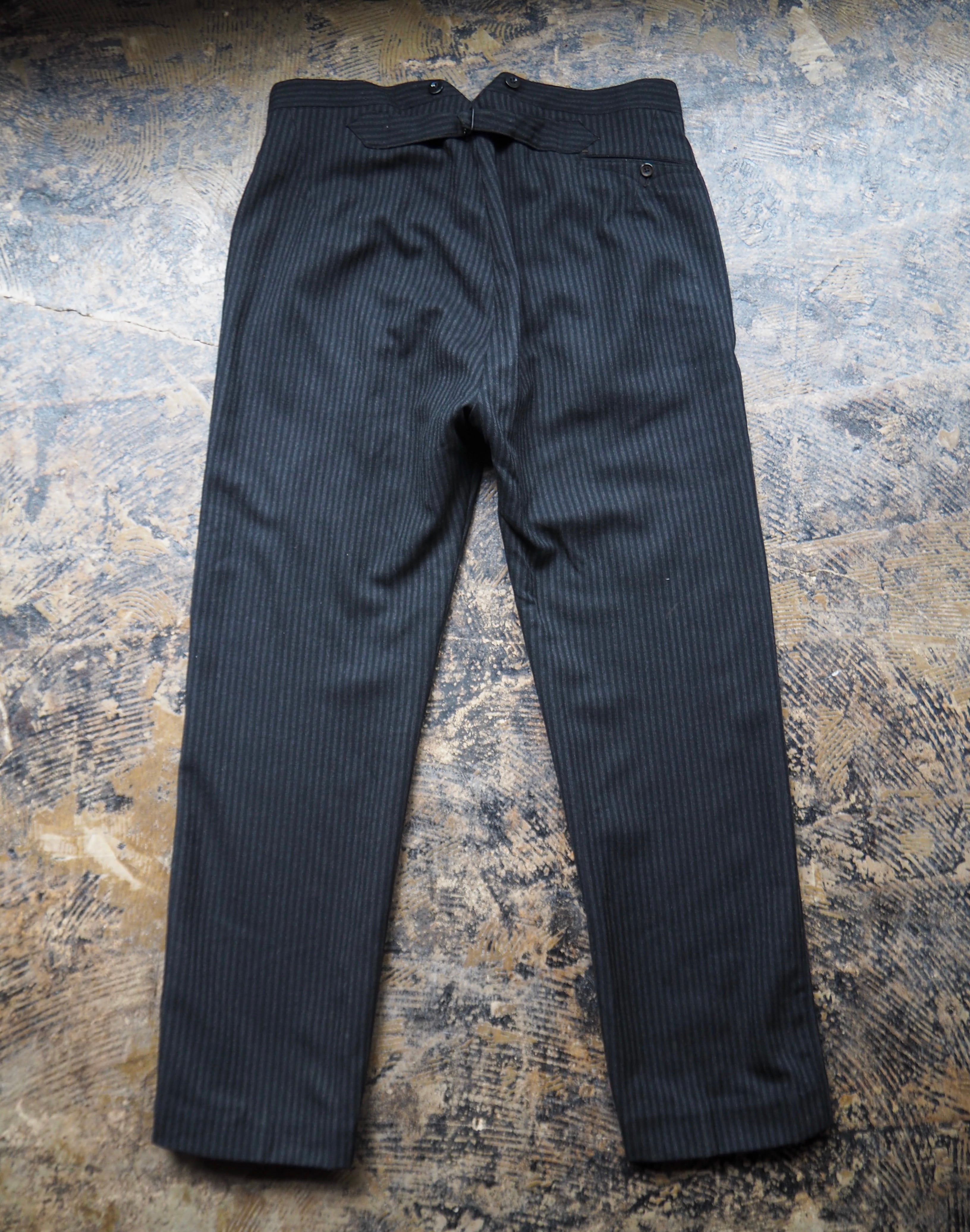 ウエストから裾先に一直線に落ちるストレートシルエット。裾部分はイングランドに伝統的な前裾が後裾よりも1.5センチ短いモーニングカット仕様。綺麗目な印象を与えるストライプ模様も相まり非常にスッキリとした、美しいシルエットラインです。