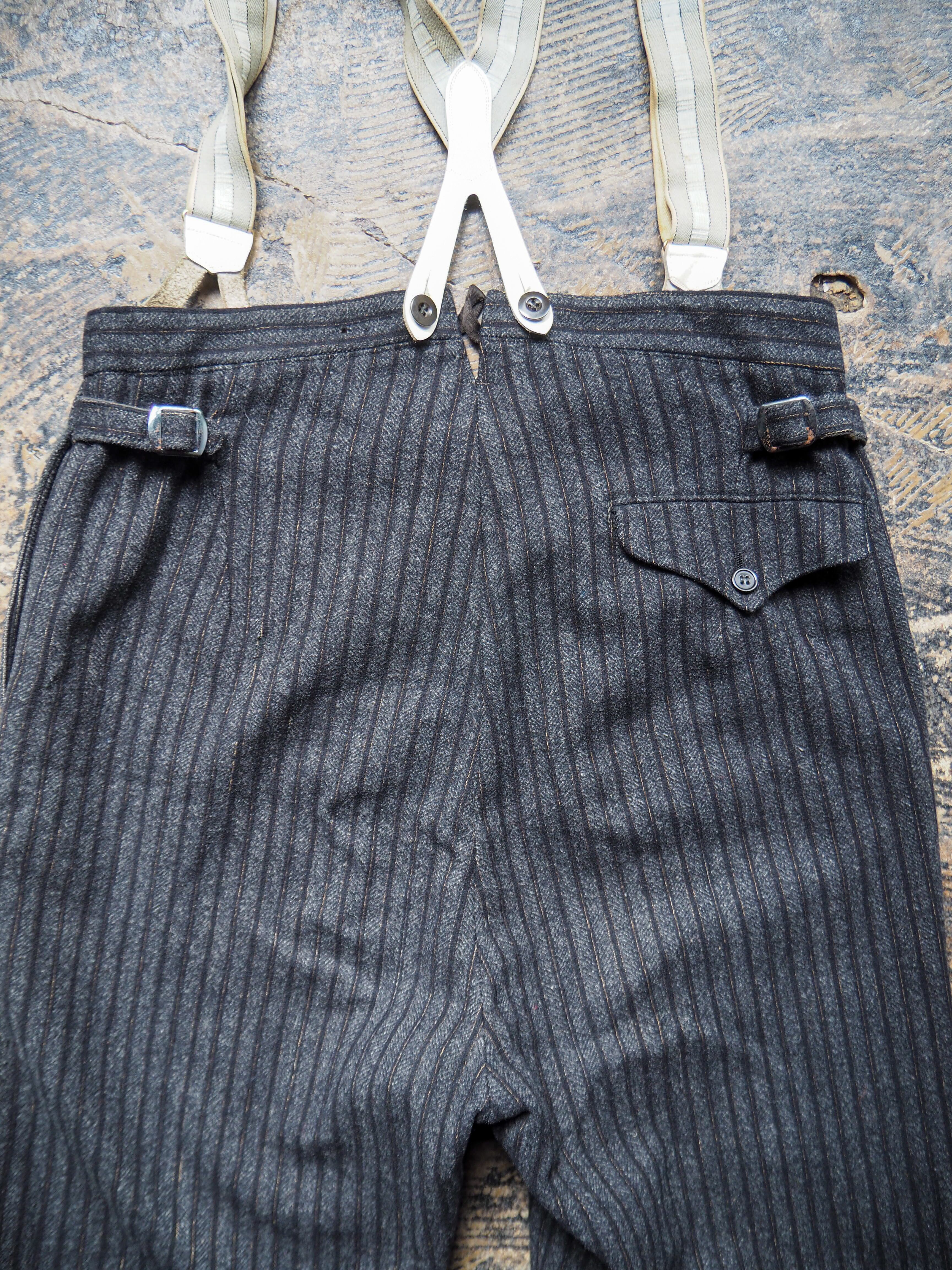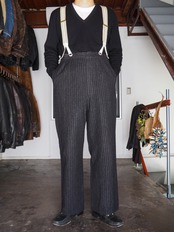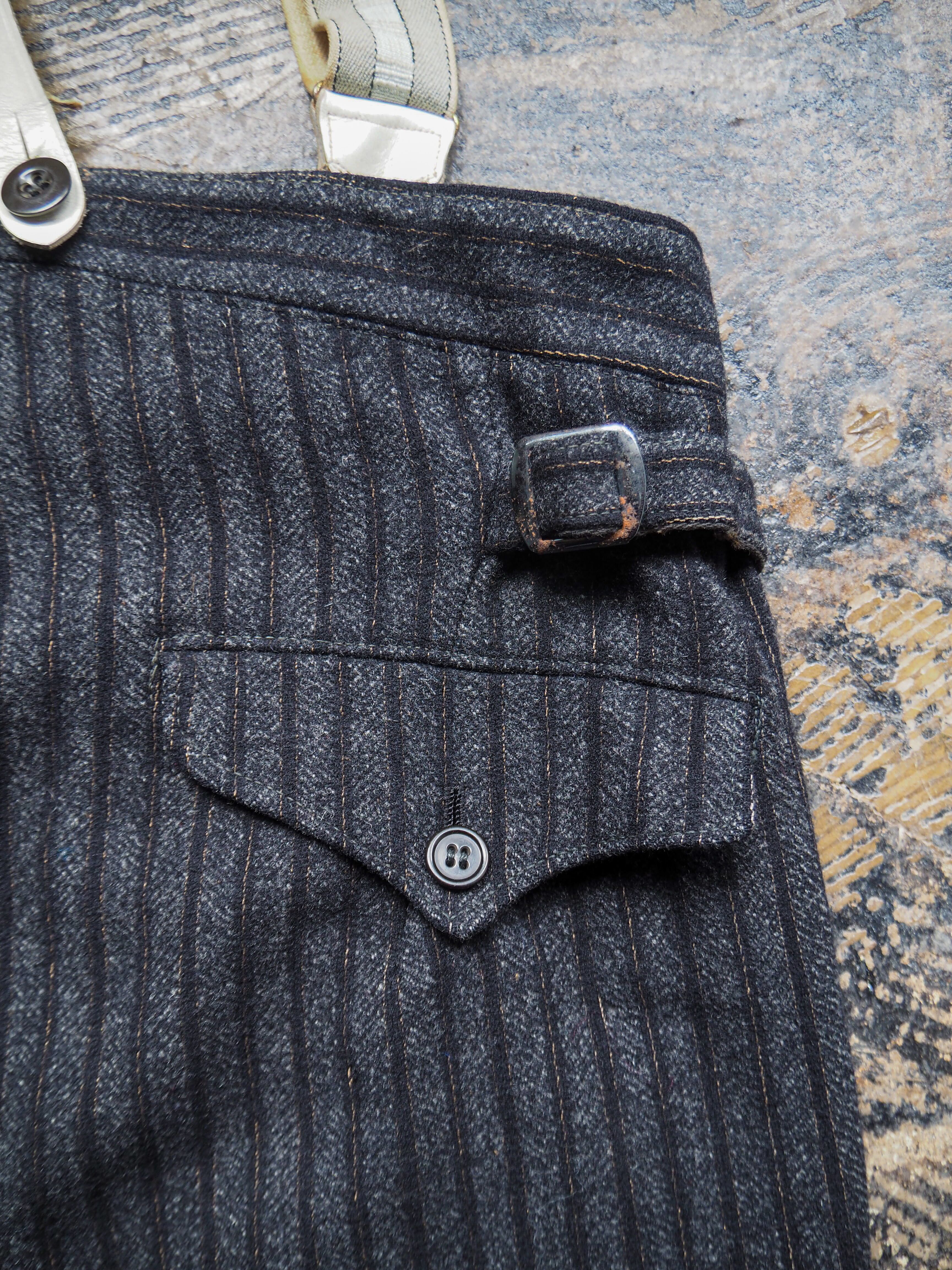 ウエストのコインポケットやフックが付属する前立て、サスペンダー仕様の腰回りなど古い年代のトラウザーに特有のクラシカルなディティールの数々。