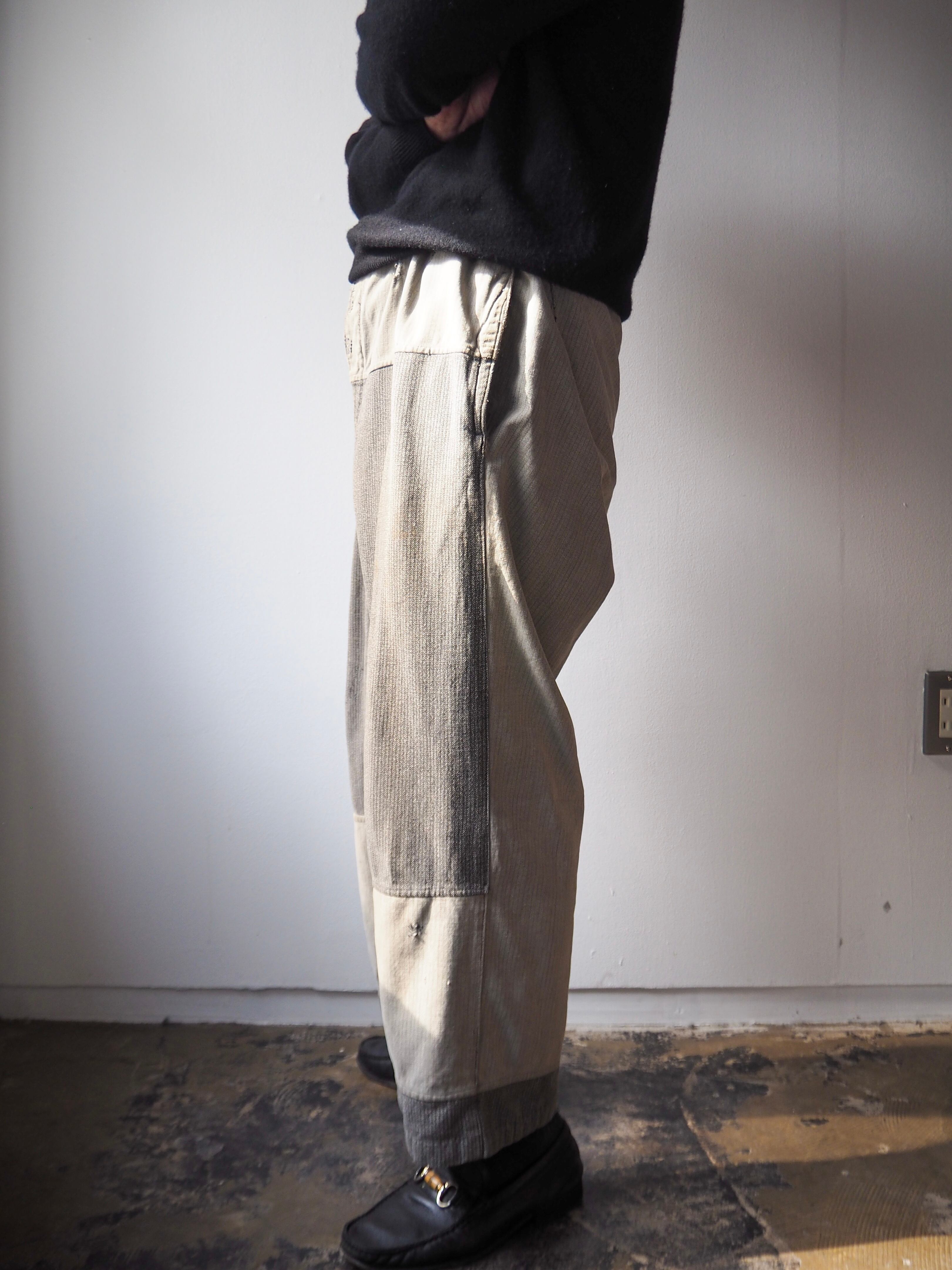当パンツを大切に着用し受け継いできた人々の温もりが感じる腿、裾部分のパッチワーク、各所に施された手刺繍によるリペア。もちろんファッション的観点から見ても十二分に素敵です。