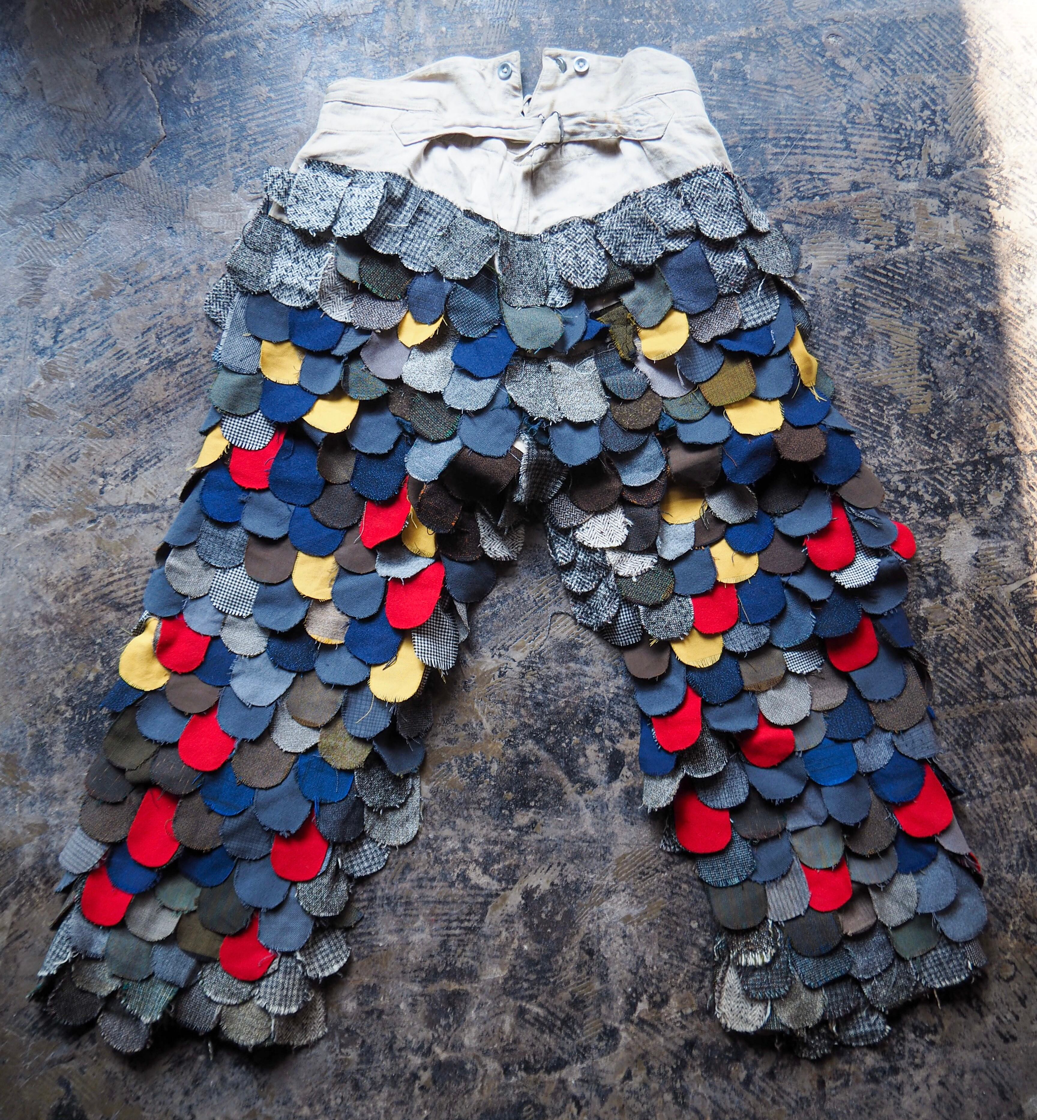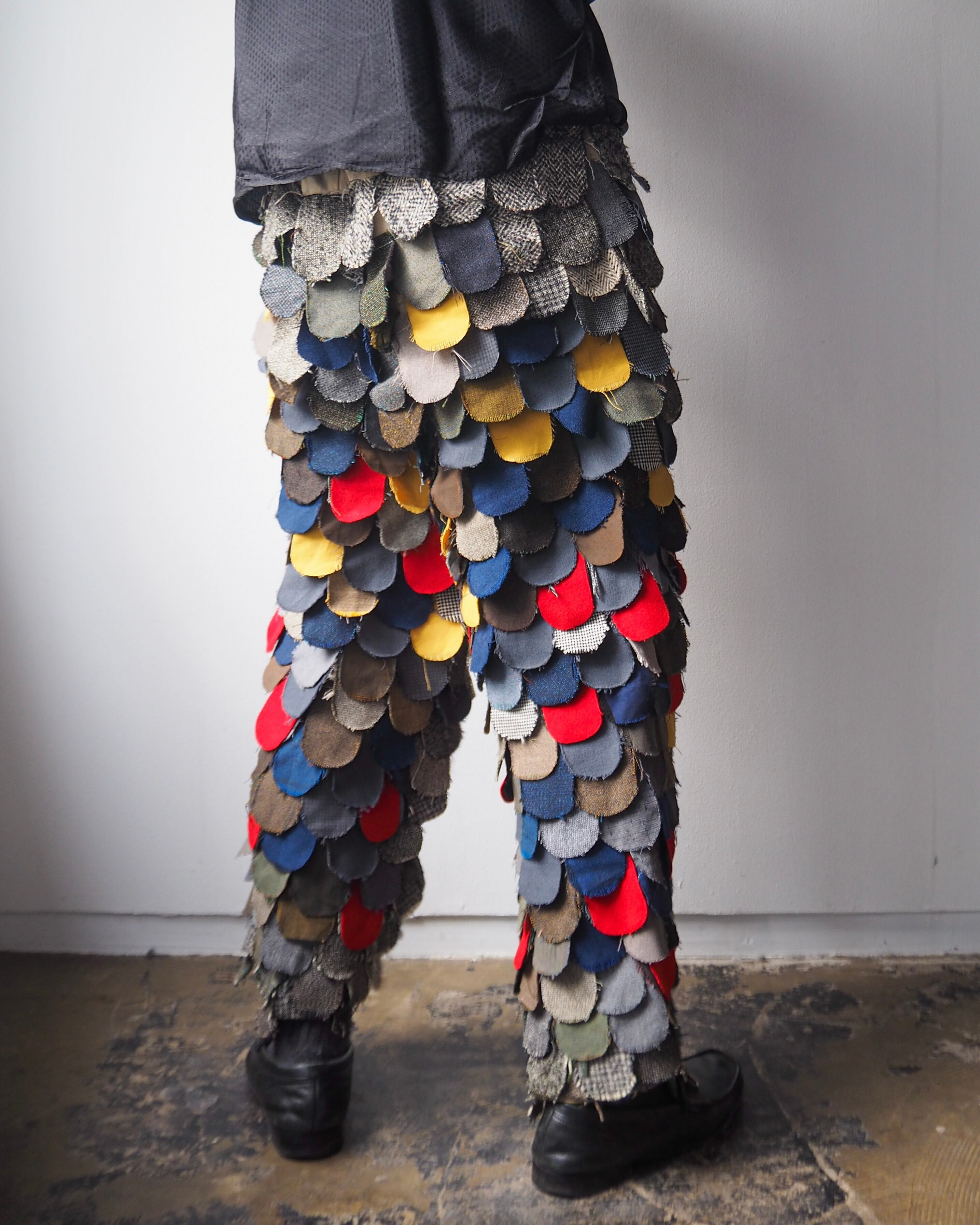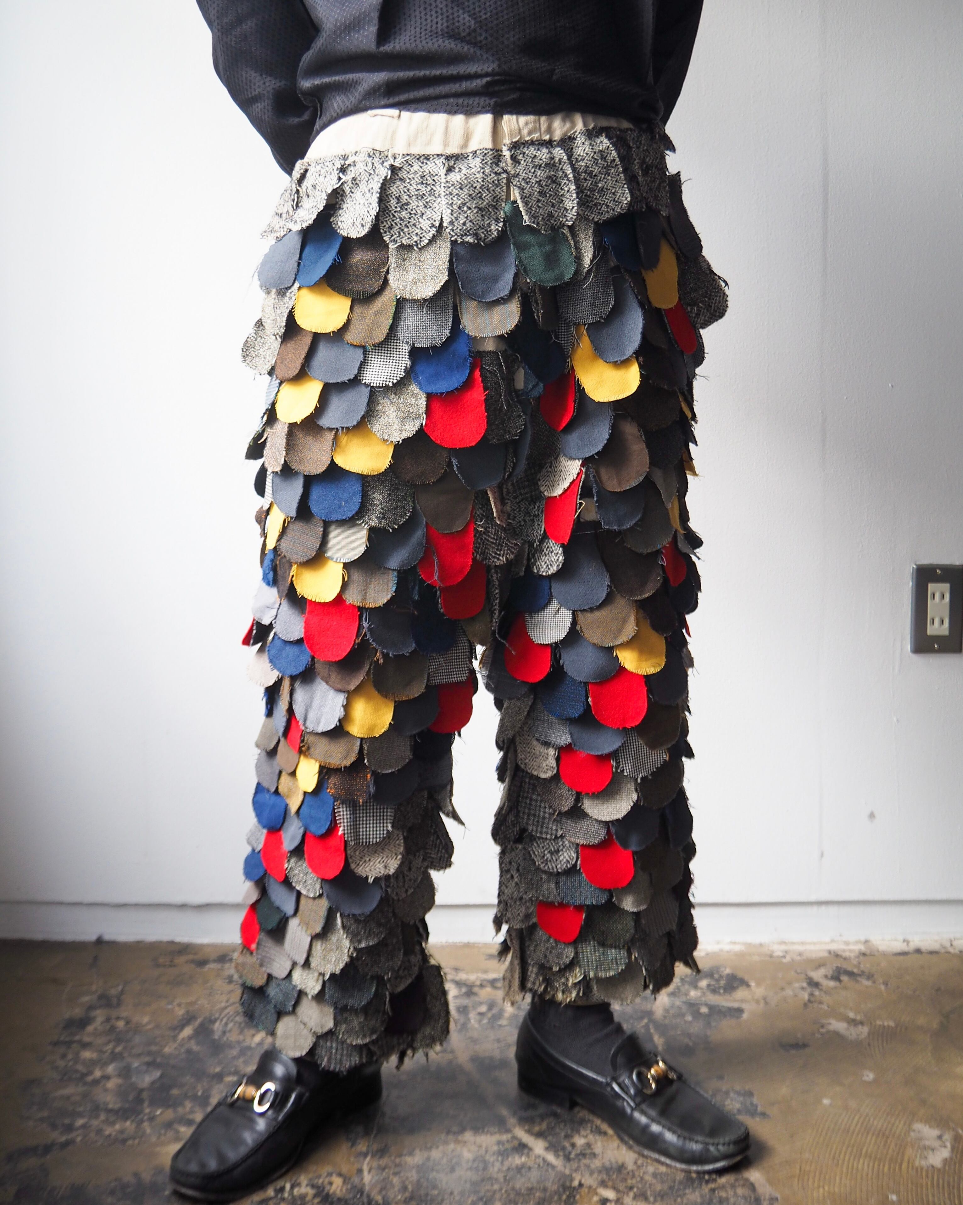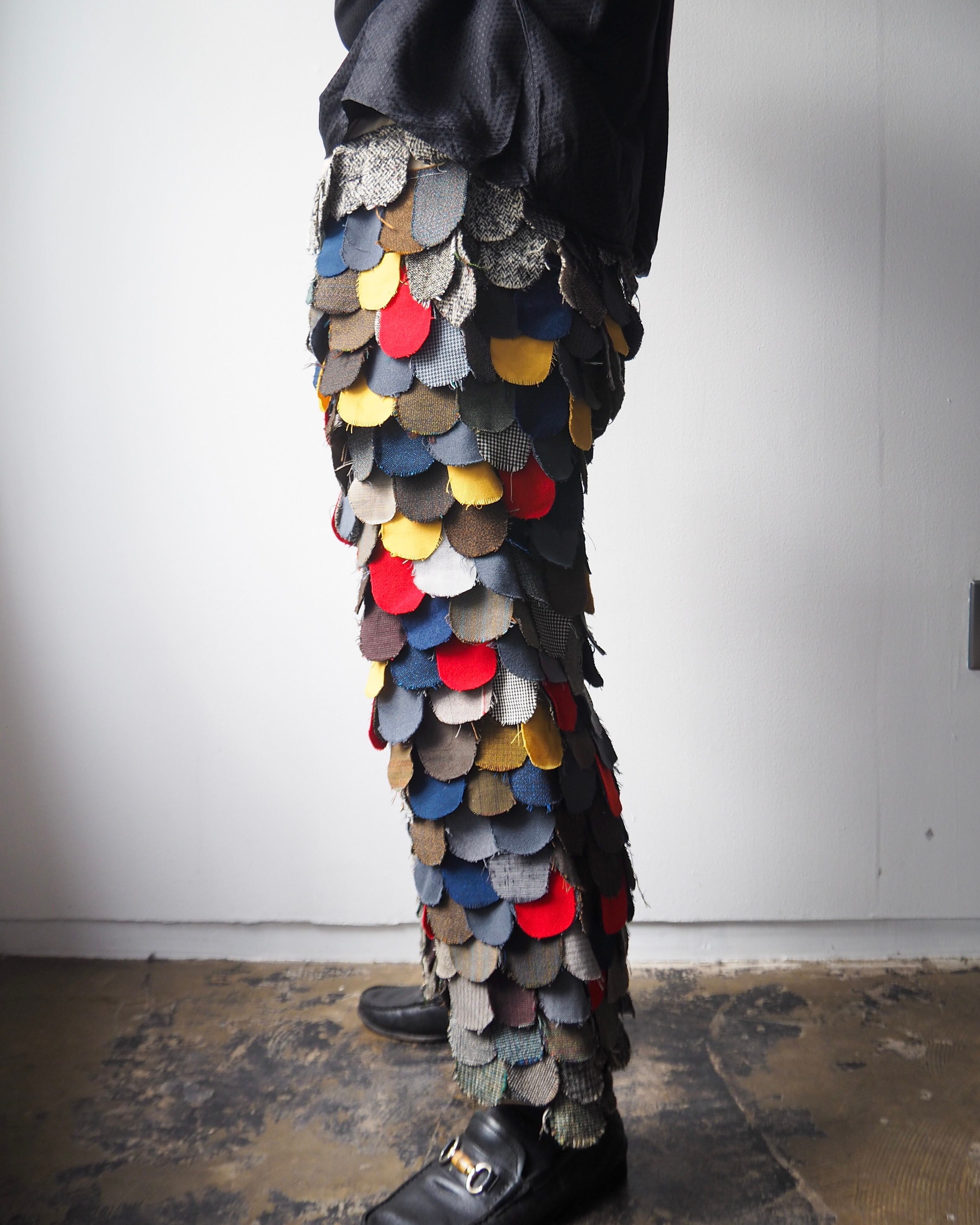 赤、青、黄、ベージュ、ツイード、チェック、千鳥格子、多種多様な織りにカラフルな楕円形のウール生地が縫い付けられた様はまるで"うろこ"のよう。
