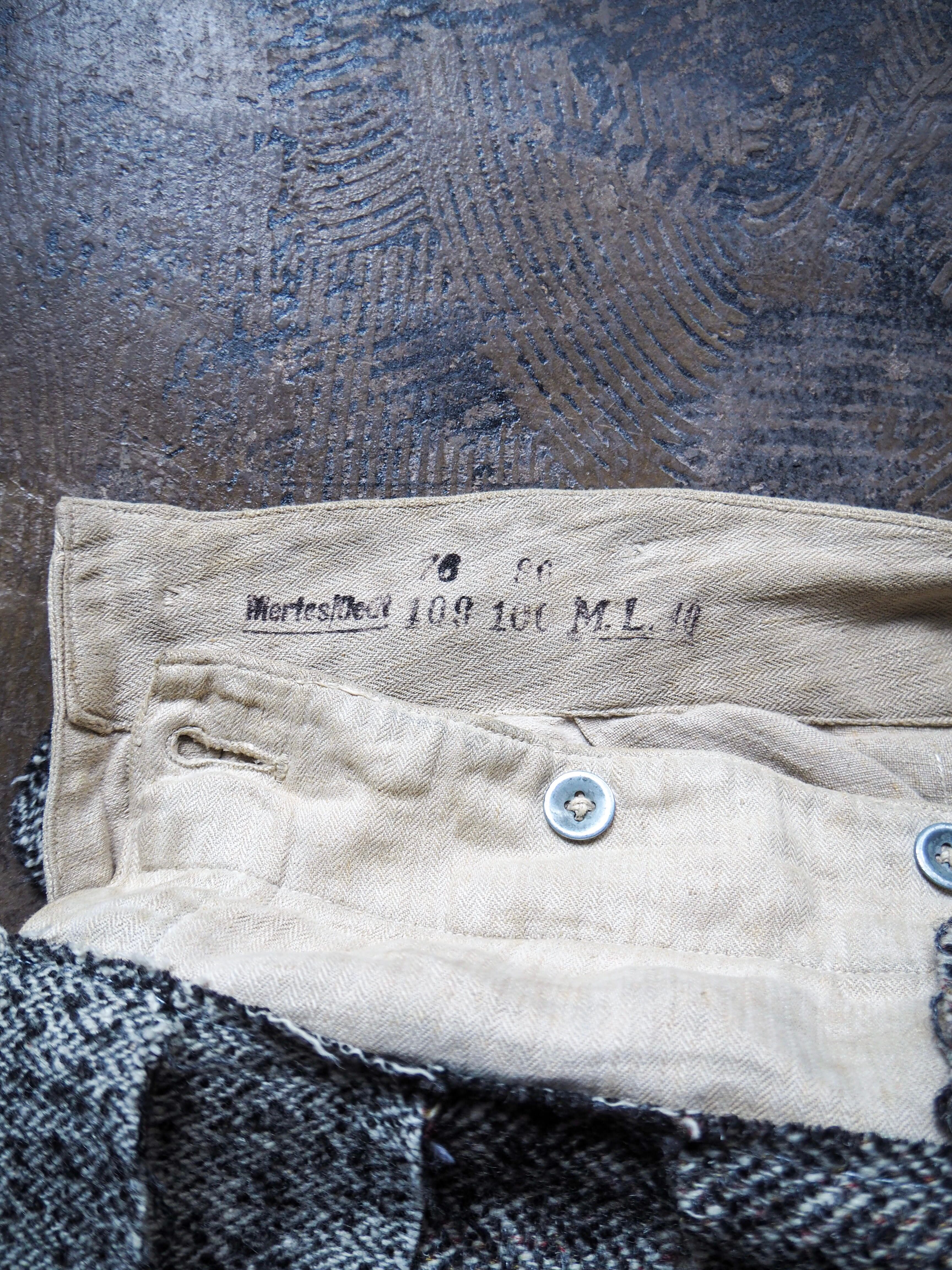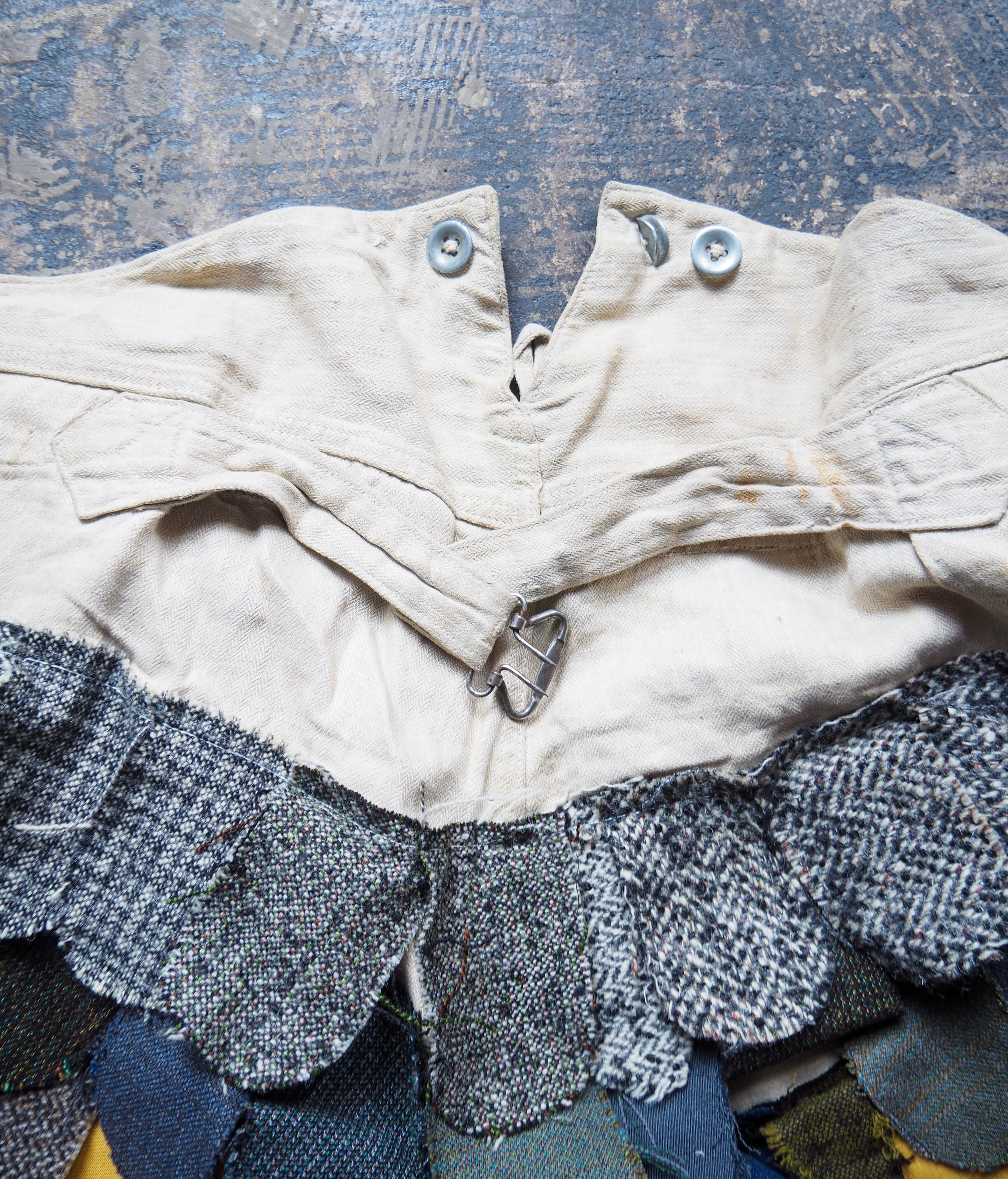 ナチス政権下ドイツ海軍"Kriegsmarine"で着用されていたHBTリネン生地のセーラーパンツ。こちらはドイツ語で”Drillich”と呼称されるヘリンボーンツイル織の肉厚リネン生地に様々なウール生地が縫い付けられた一本。