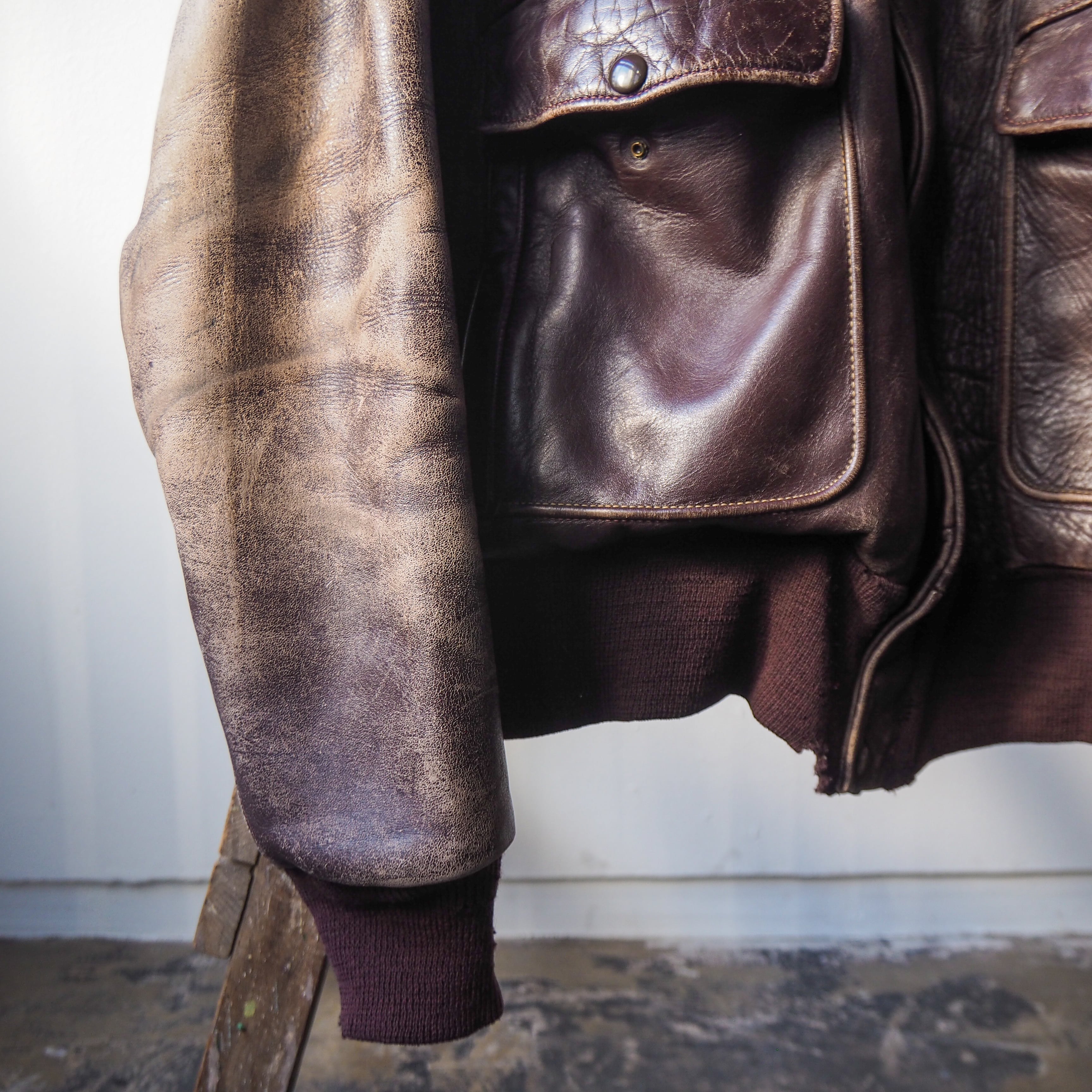 分厚く堅牢なカウハイドに"USAF A-2 Flight Jacket"の流れを汲む意匠仕様の数々。