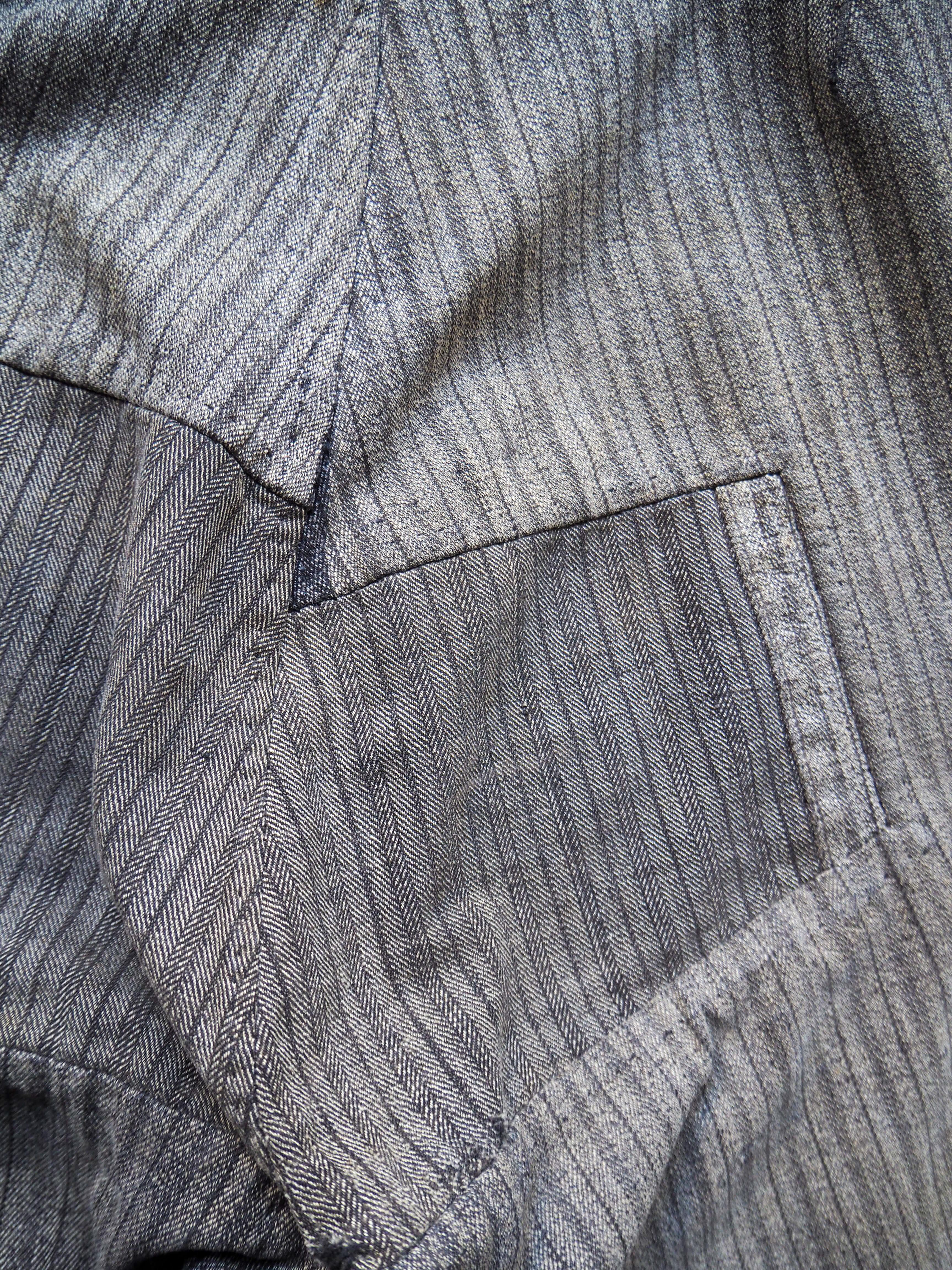 当パンツを大切に着用し受け継いできた人々の温もりが感じる腿、ヒップ部分のパッチワーク、各所に施された手刺繍によるリペア。ファッション的観点から見てもたいへん素敵なただならぬ雰囲気あふれる佇まいです。