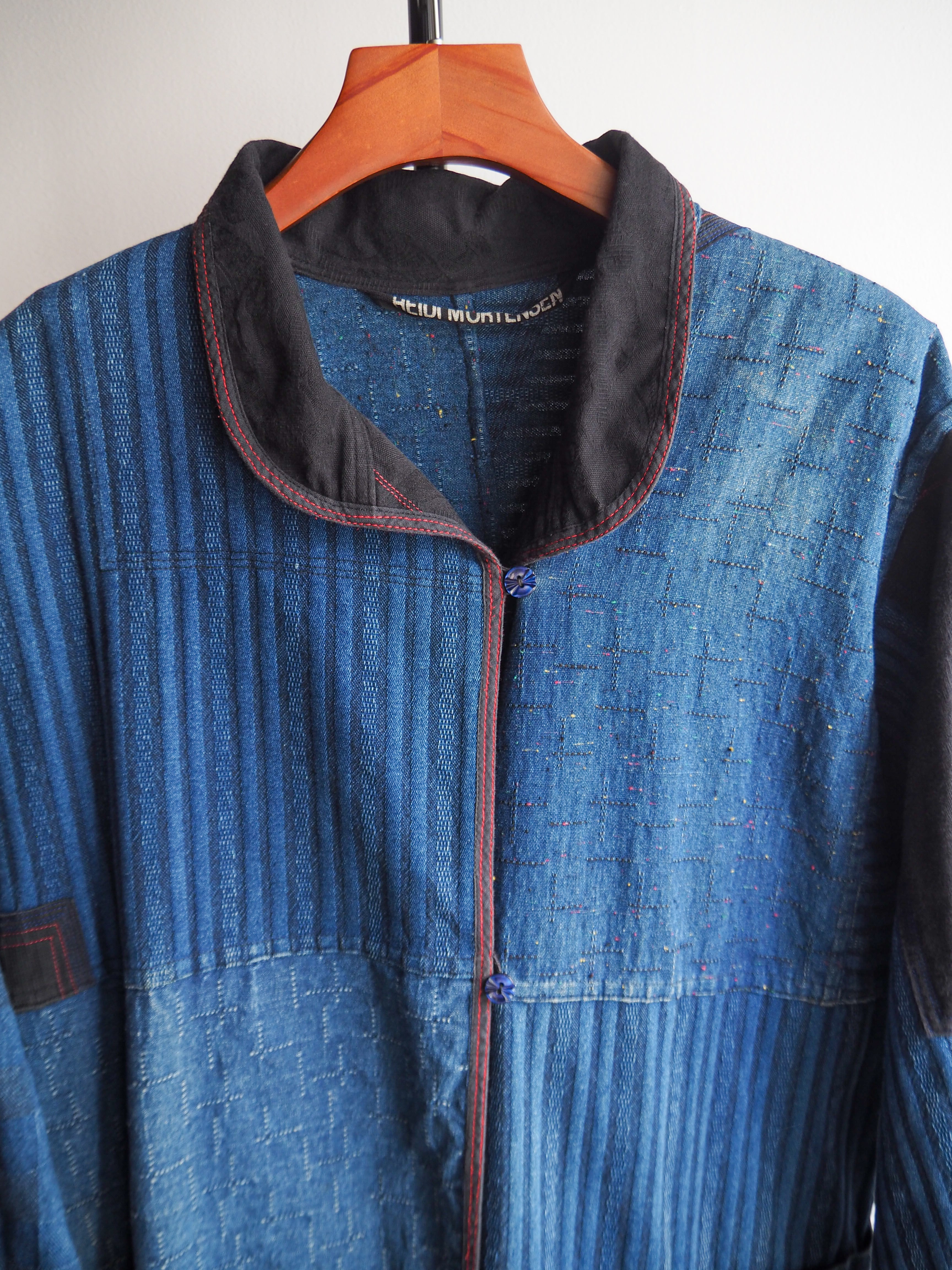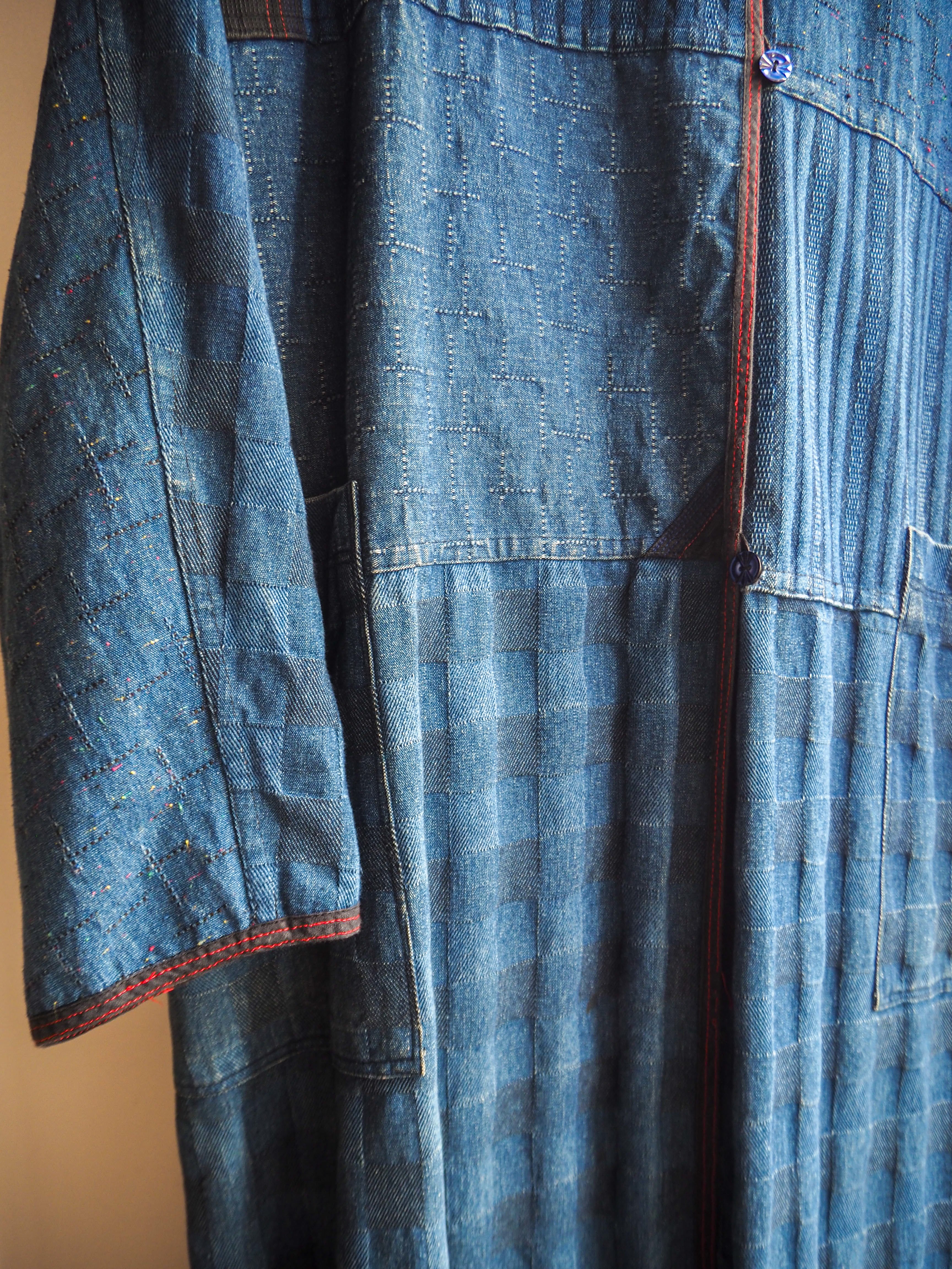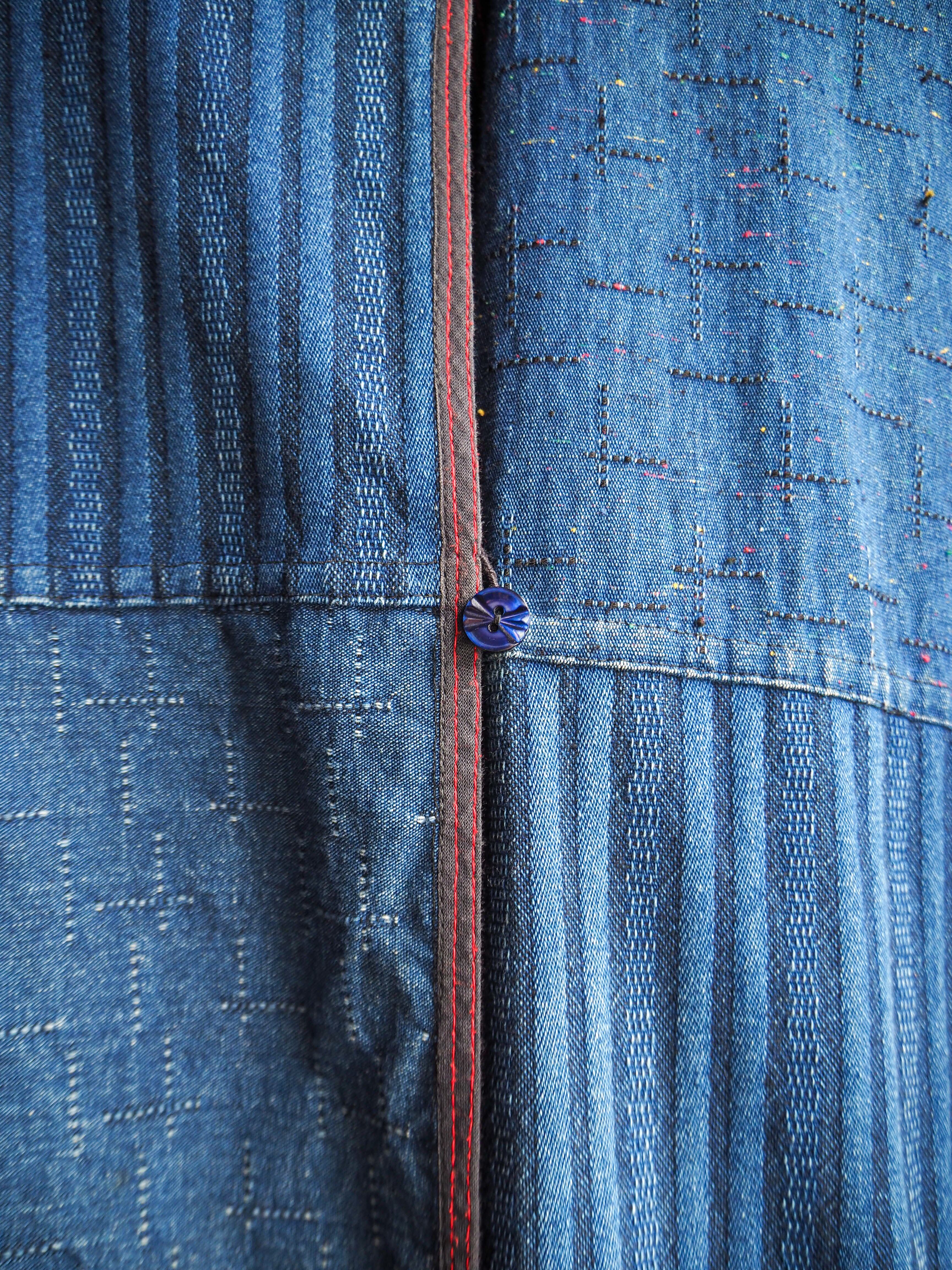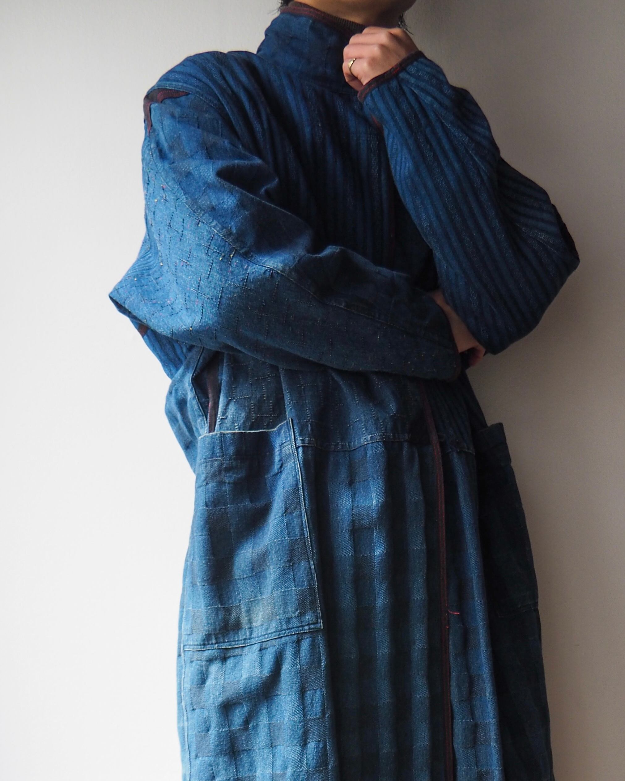 ボーダー、ストライプ、市松、メランジのカスリ等々インディゴ染めの様々な生地をつなぎ合わせて作られた1着。