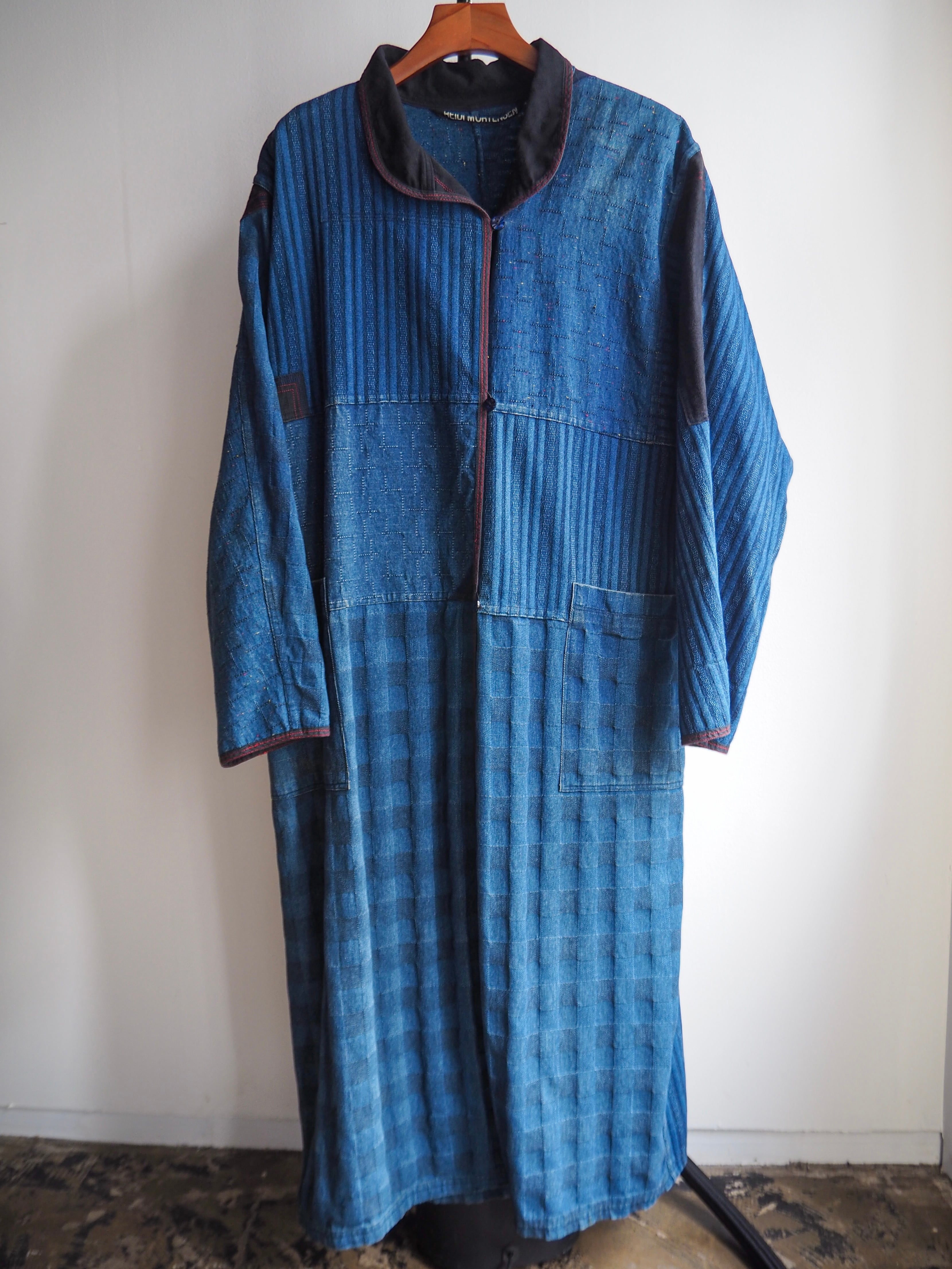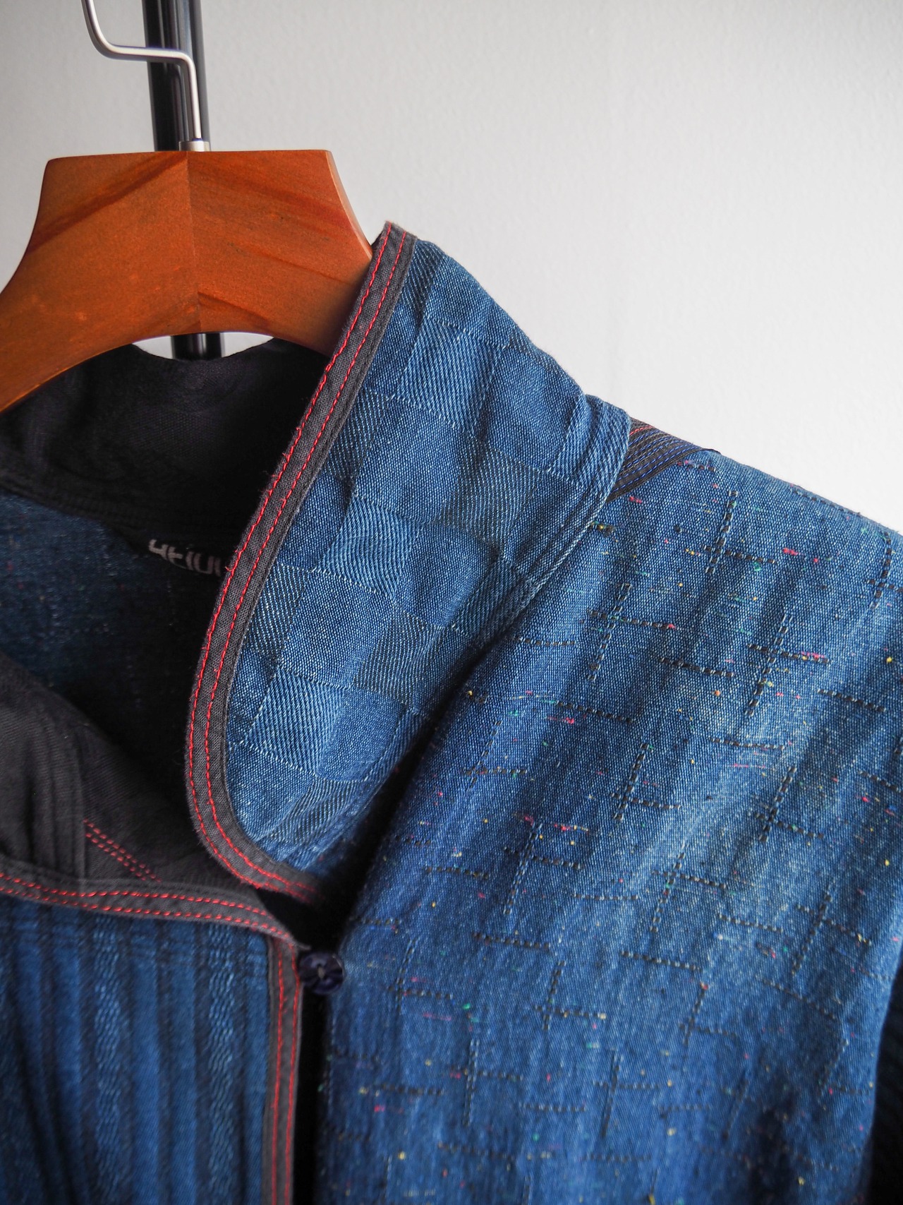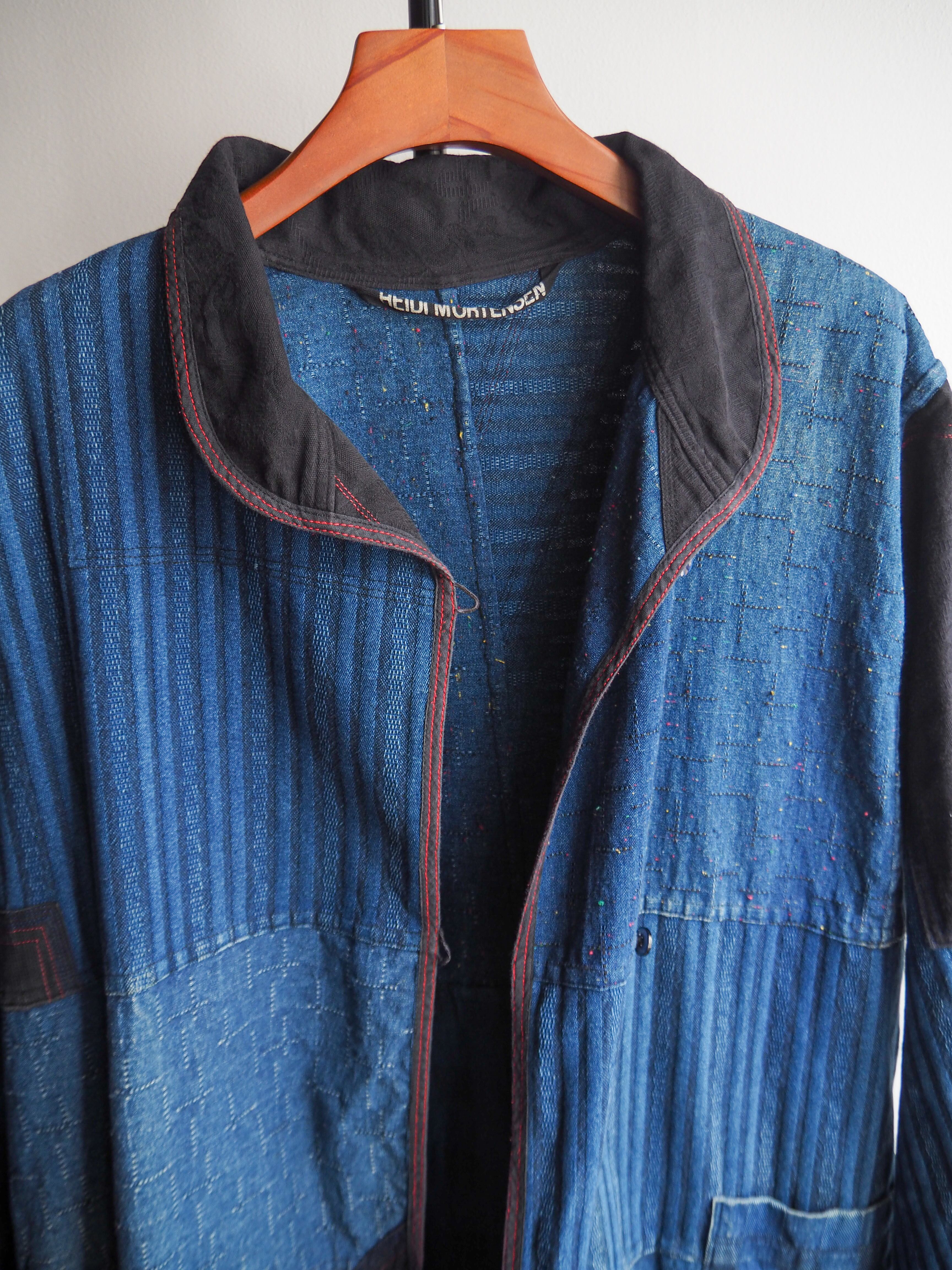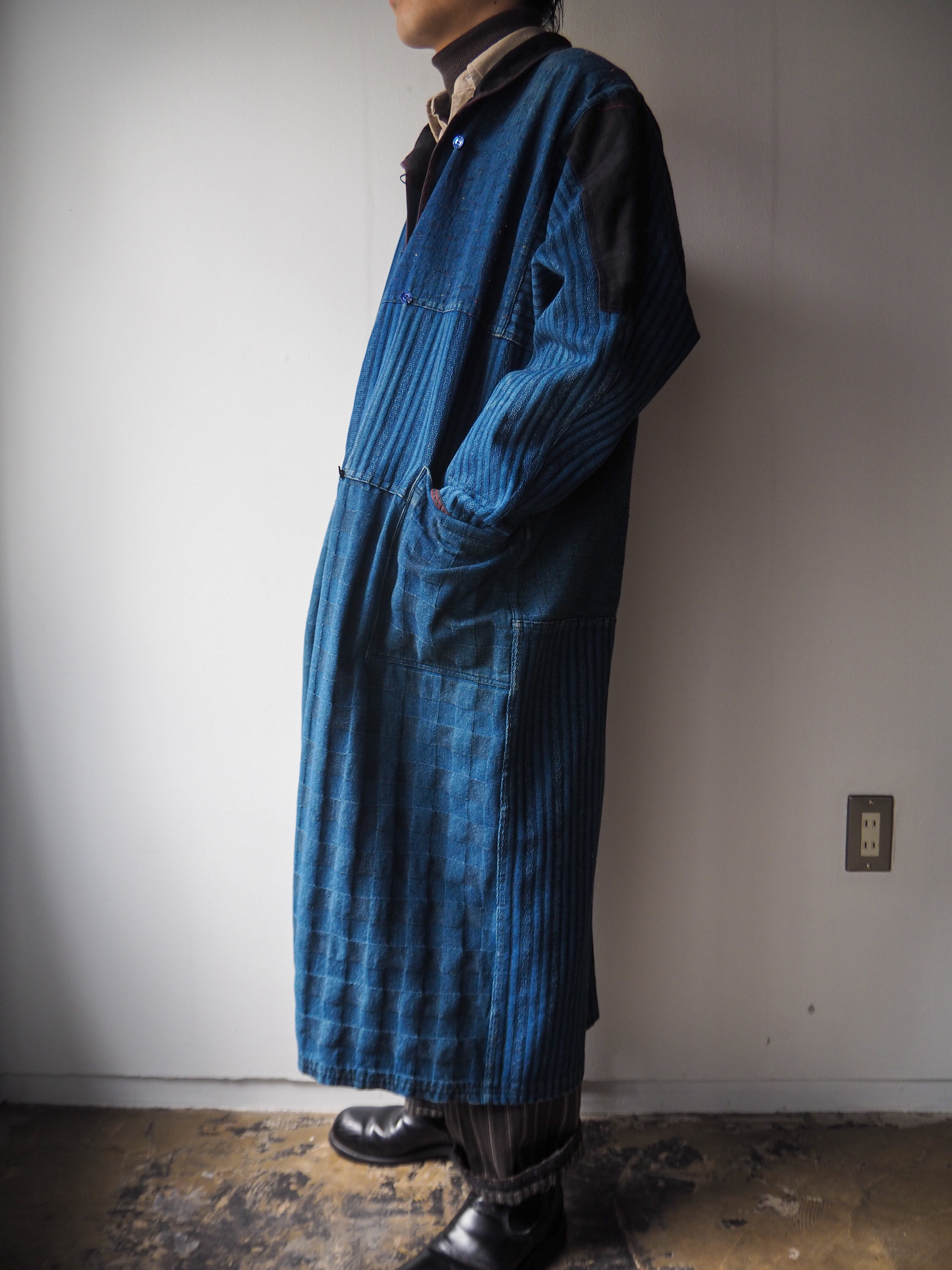 ボーダー、ストライプ、市松、メランジのカスリ等々インディゴ染めの様々な生地をつなぎ合わせて作られた1着。