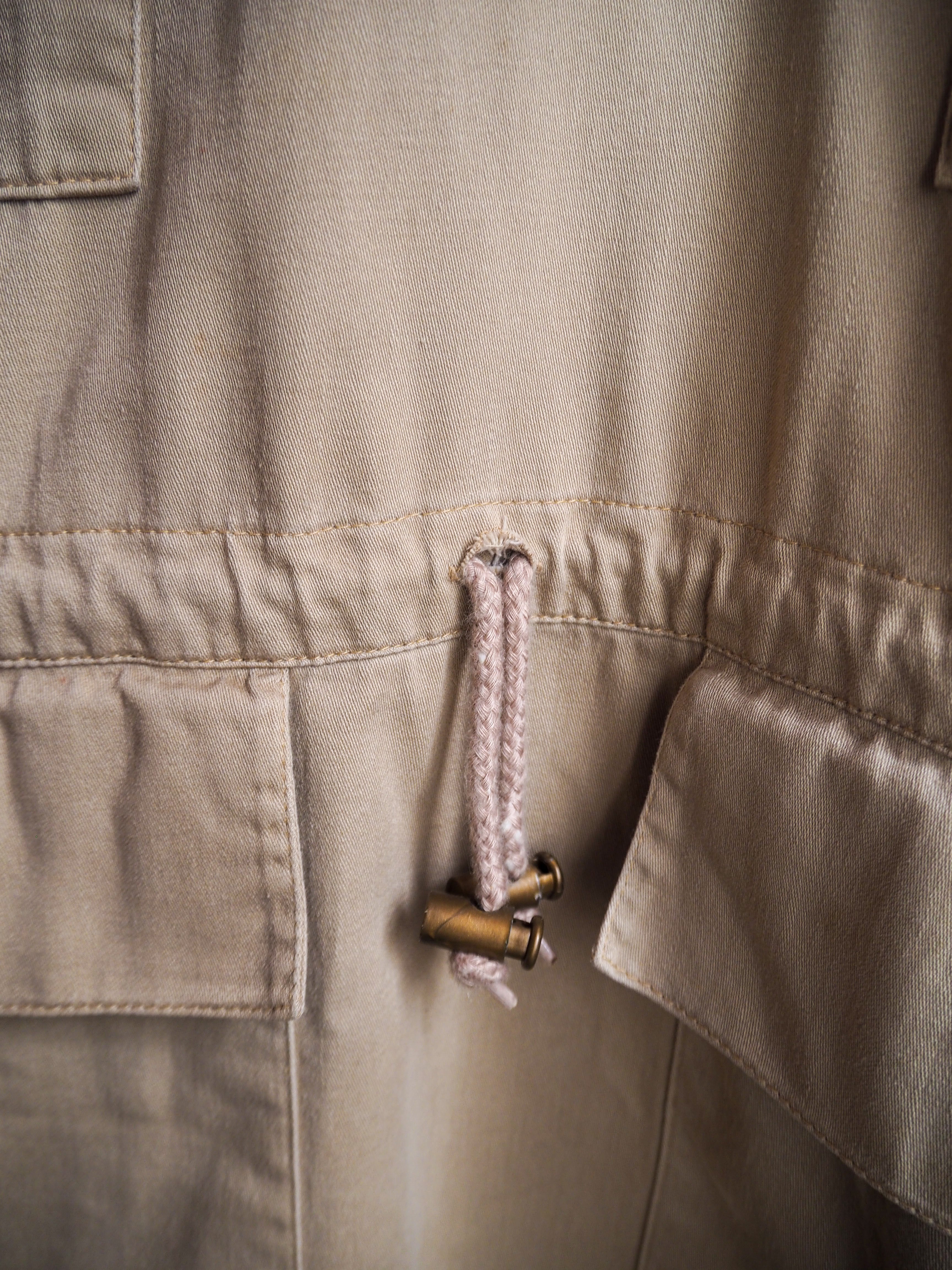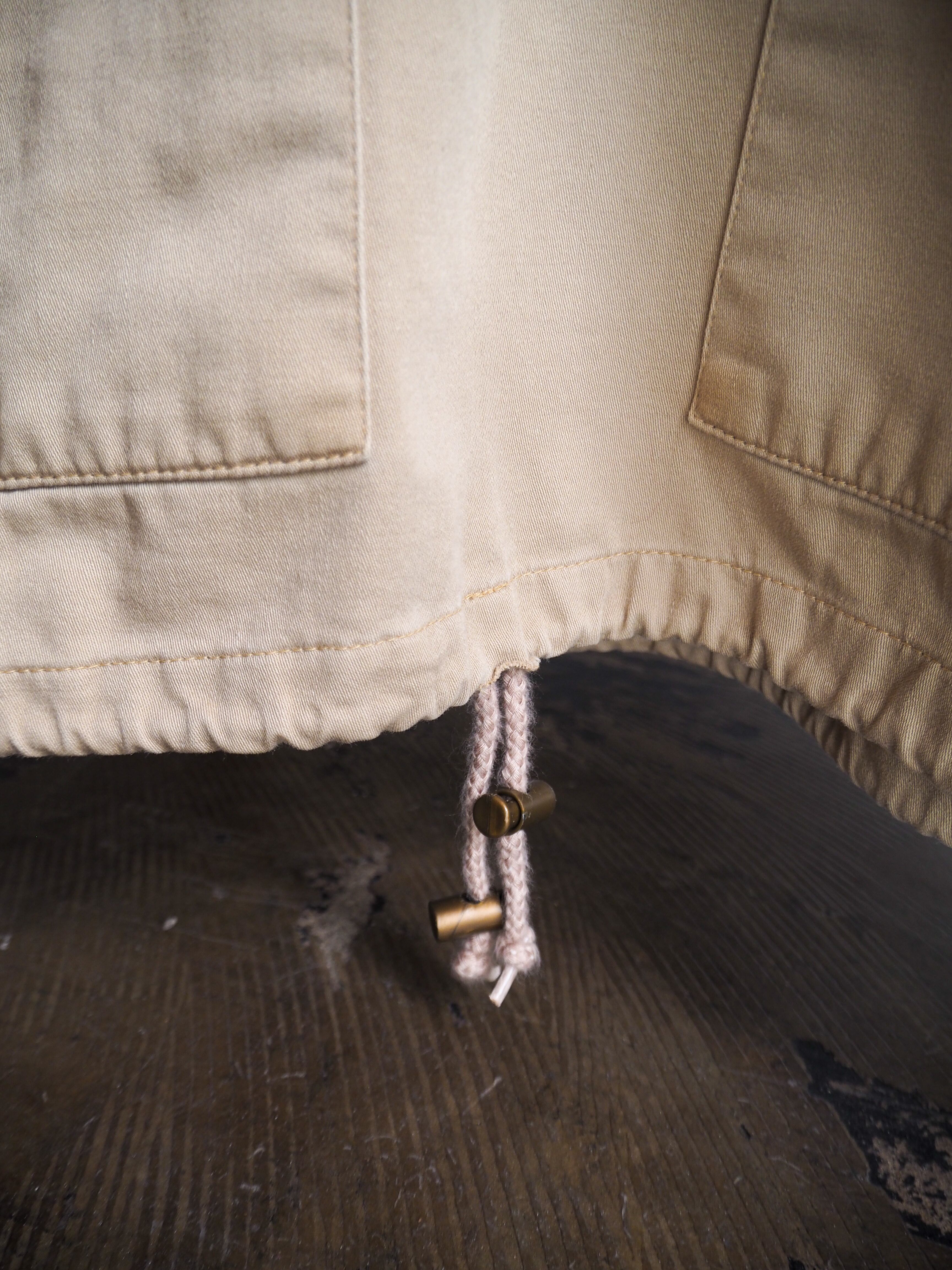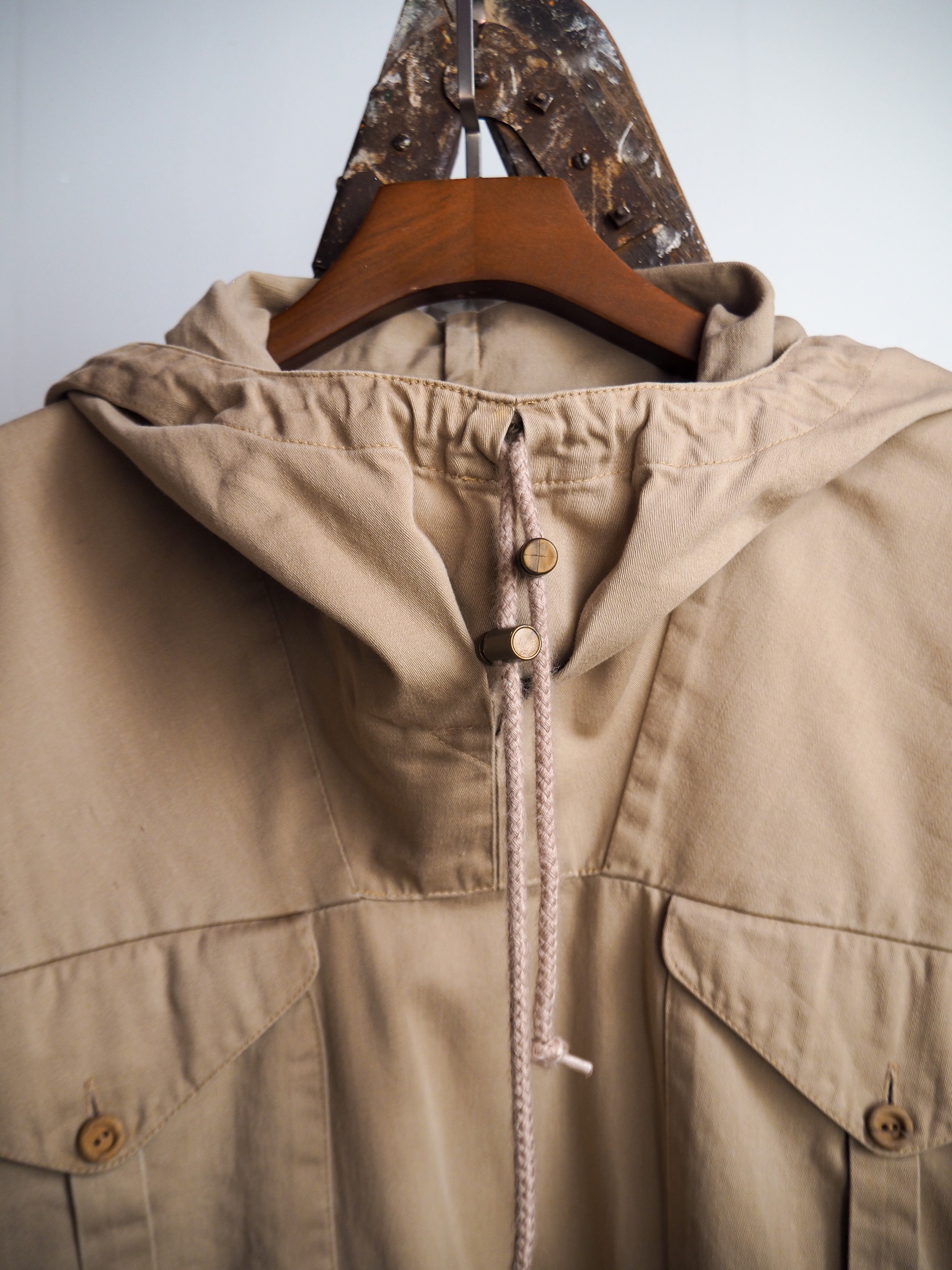 柔らかく優しい素材感の綾織のコットン100%のボディにSASのDrab Smockを彷彿とさせる四つのポケット配置。上二つはボタン式、下二つはベルクロ式のフラップポケットを採用。