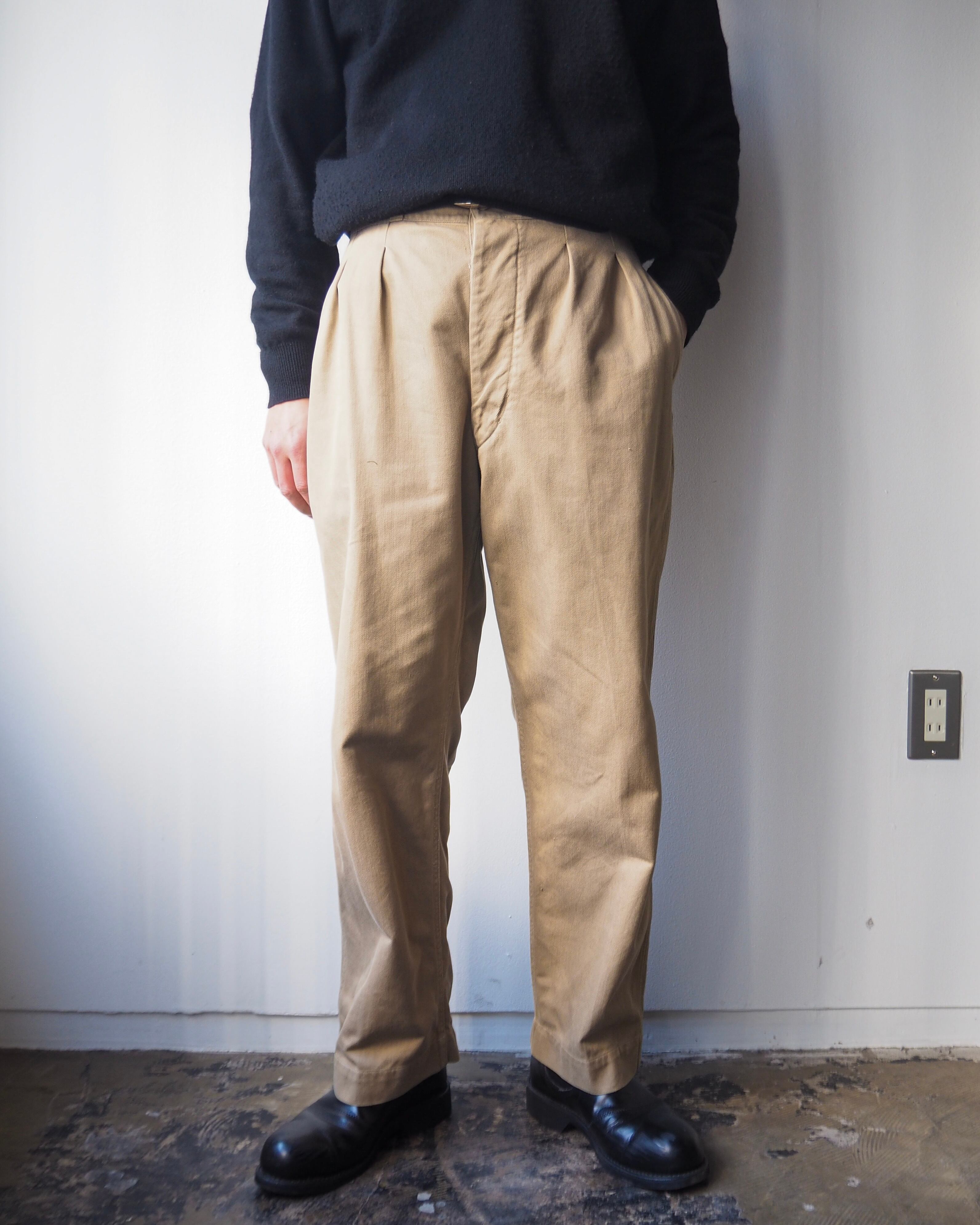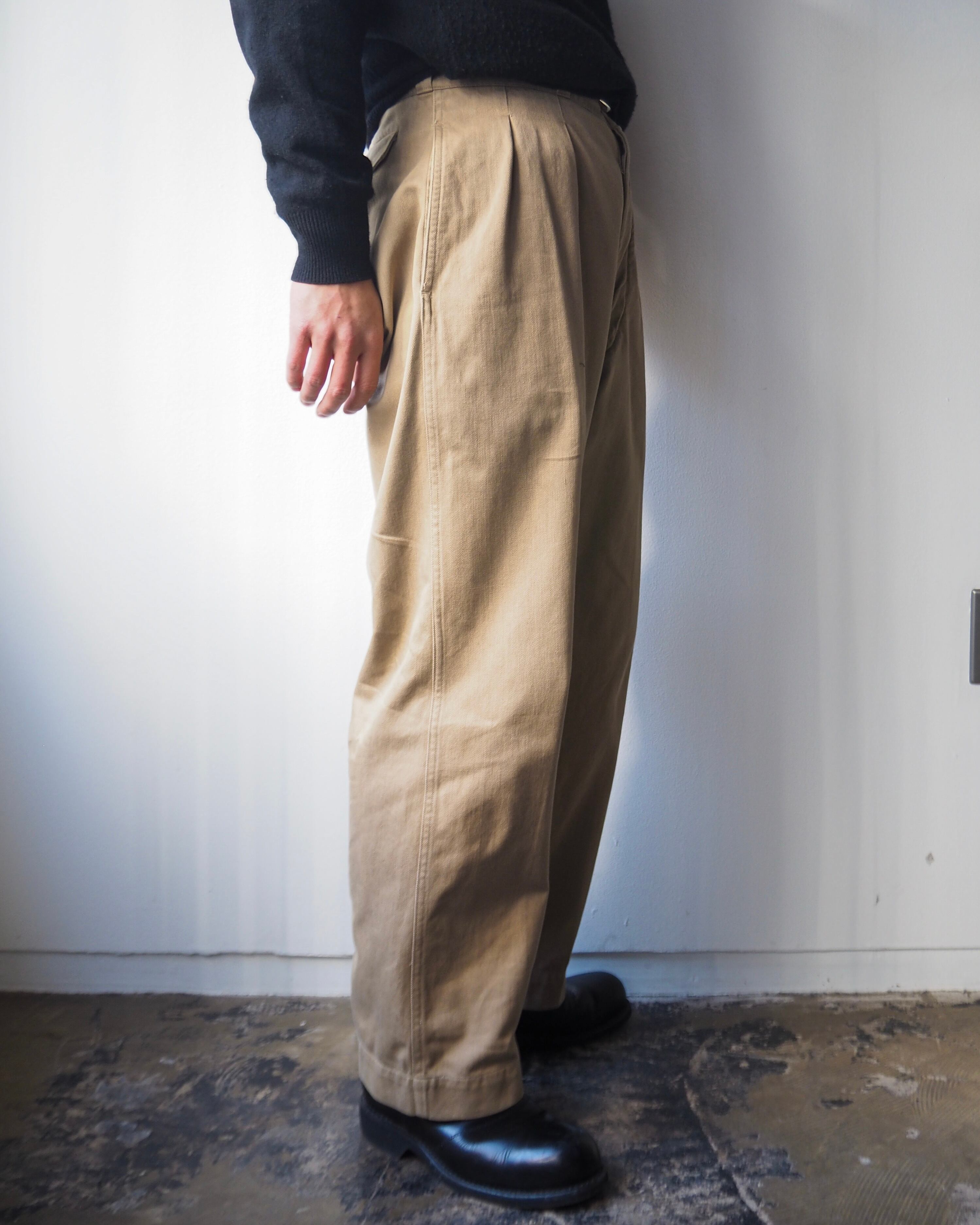 タックインを前提とした深めの股上にシルエットのバランスを取る2本のタック、テーパードの効いた美しいシルエットライン、軍モノらしからぬ丁寧に仕立てられた縫製各部などなど