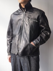 前屈みのライディングを想定したシャープな着丈とクローム加工の施されたゴートスキンの鋭い光沢感が魅力の1着。