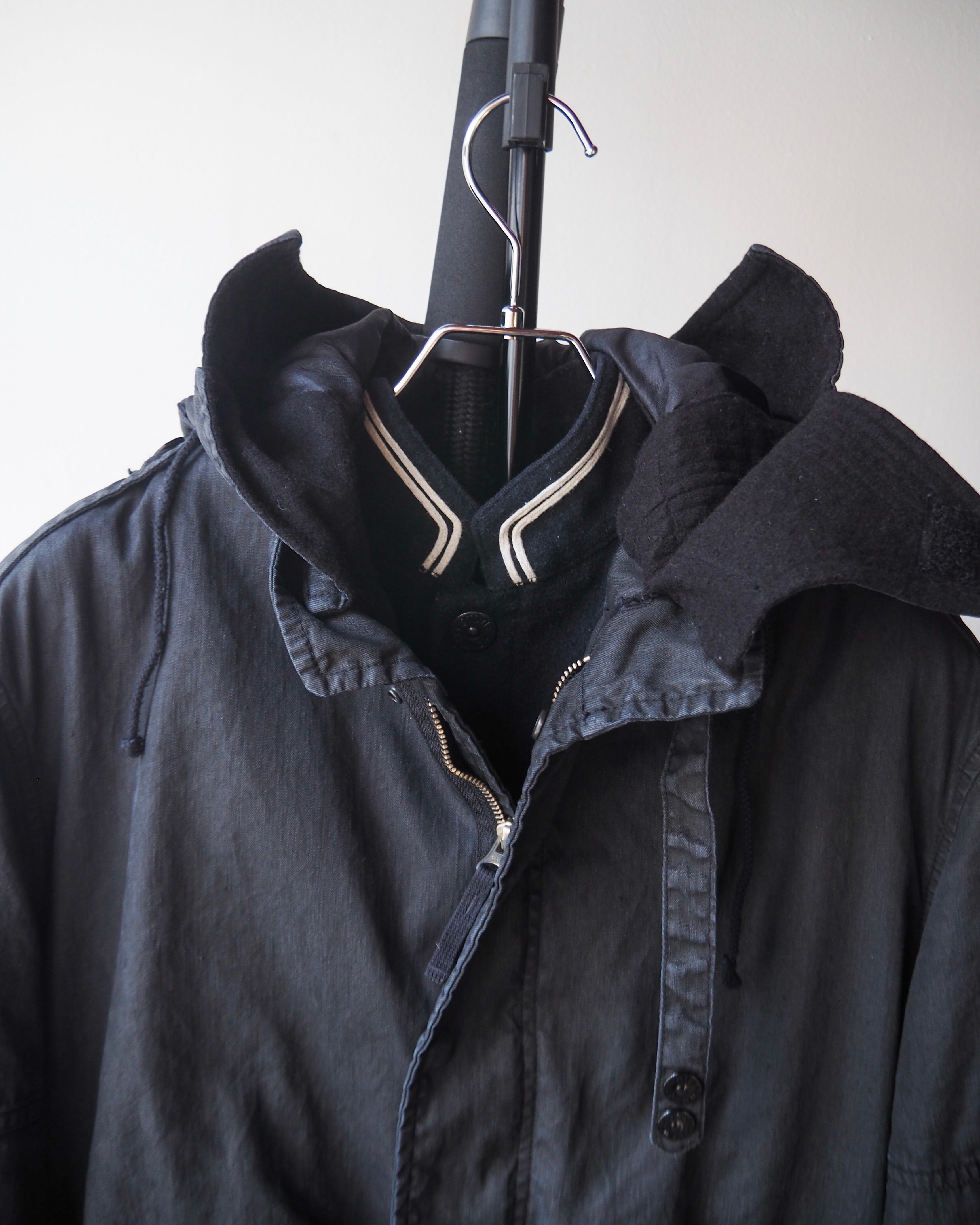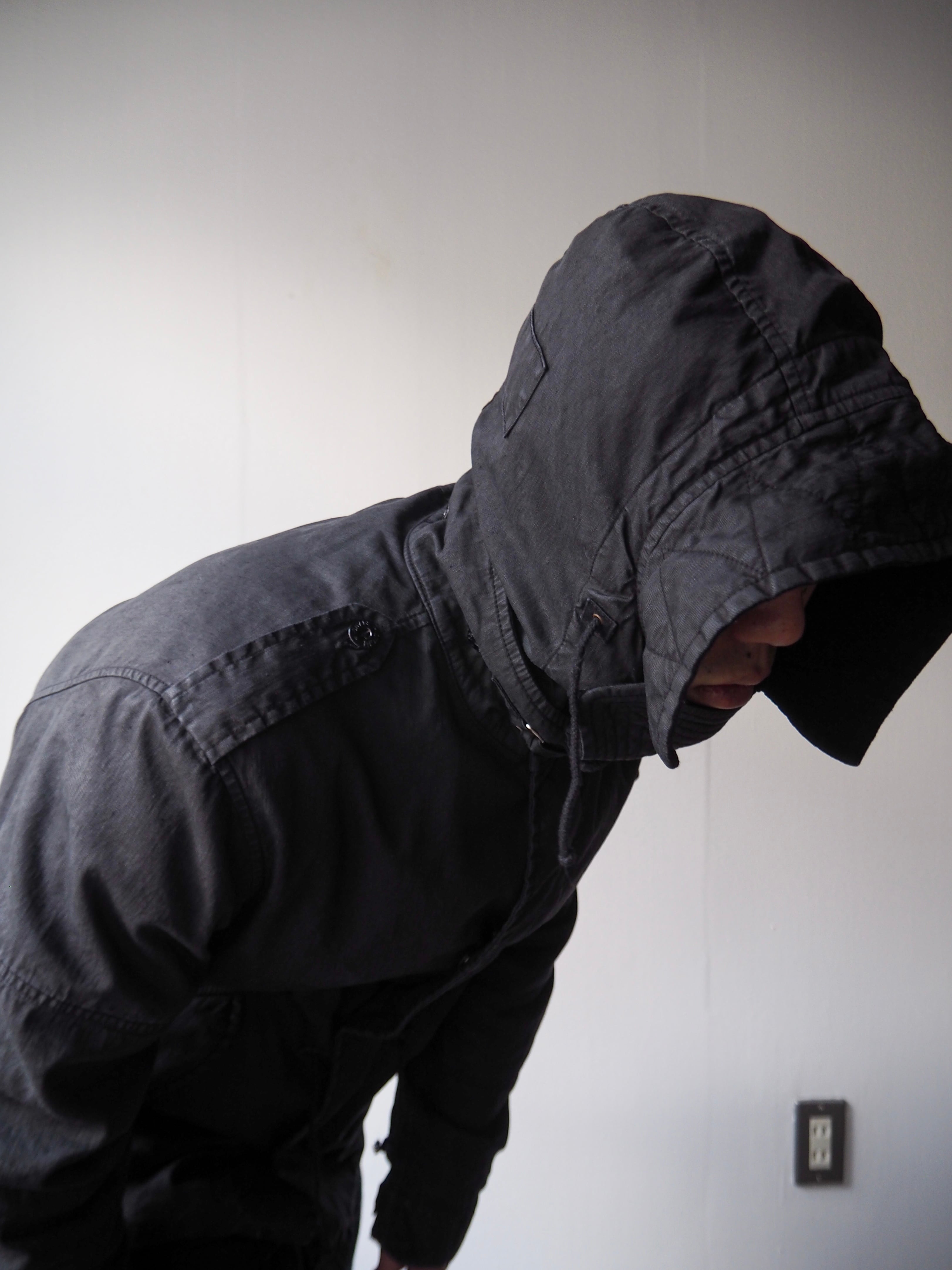 肩部分にはミリタリーのエッセンスを感じるエポレット。取り外しが可能なフードのデザインは1950sイギリス軍ミドルパーカ、襟元のチンストラップベルトはナチスドイツ空軍(Luftwaffe)の"Channel Jacket"から得ていると思います。