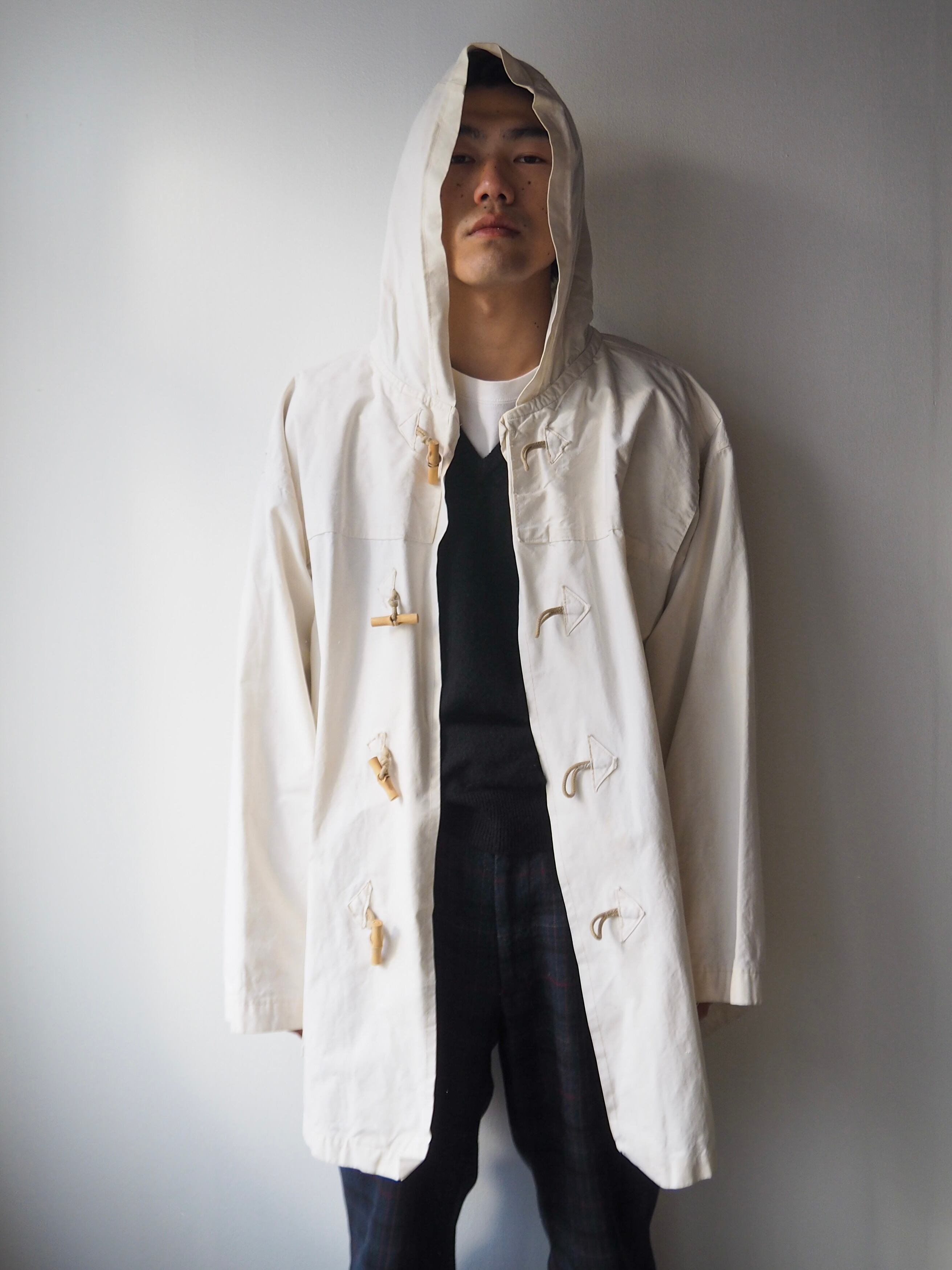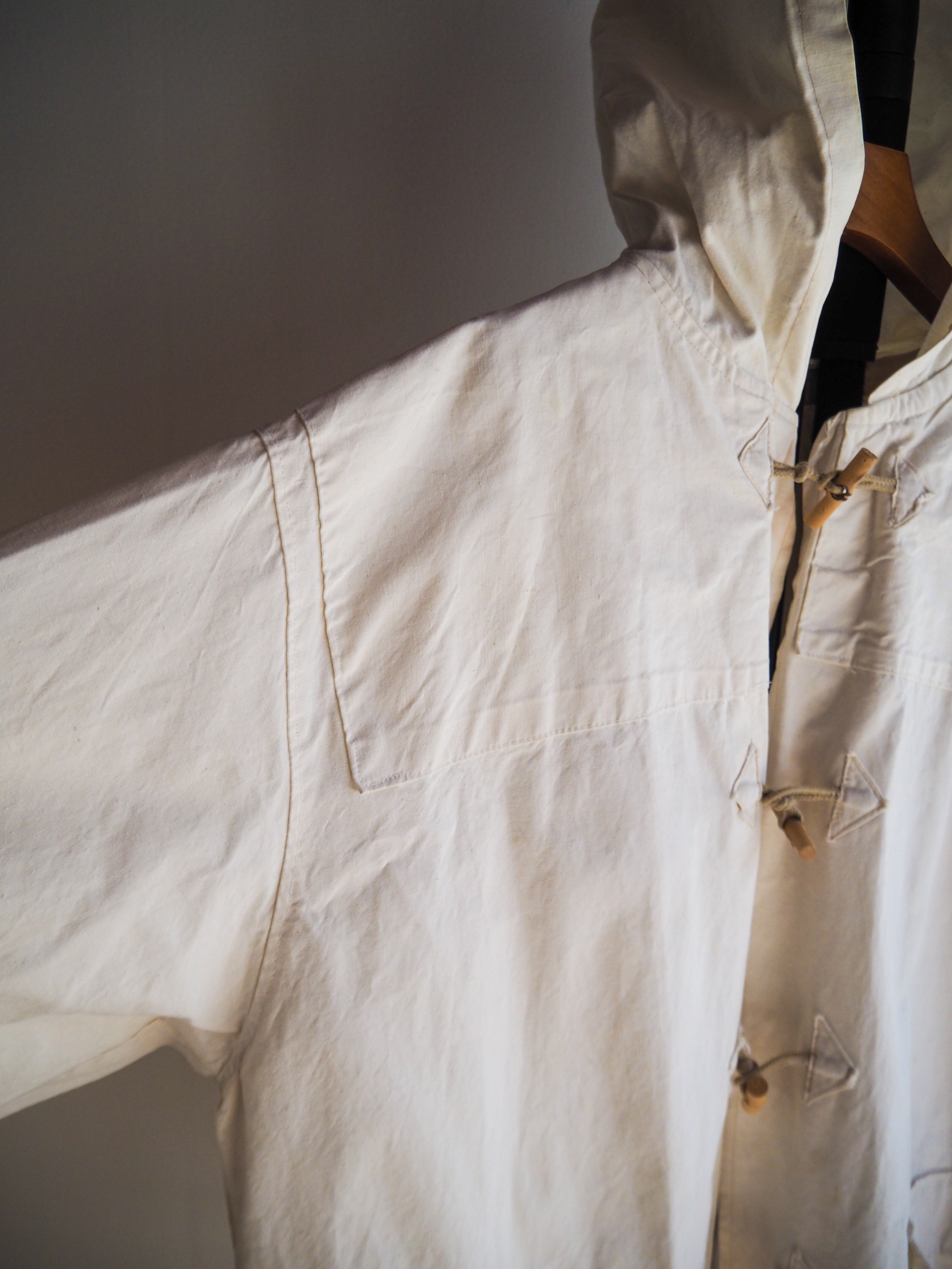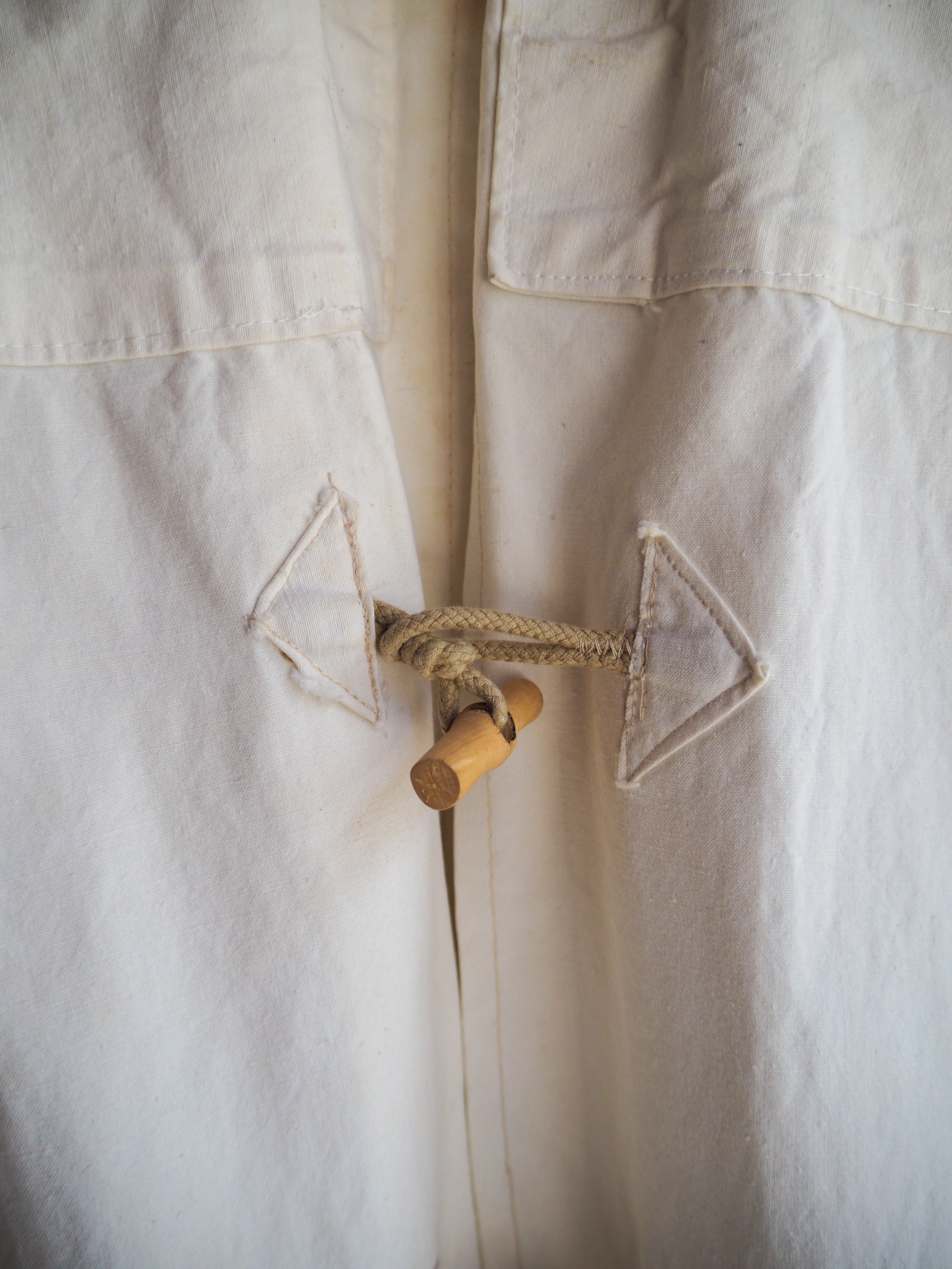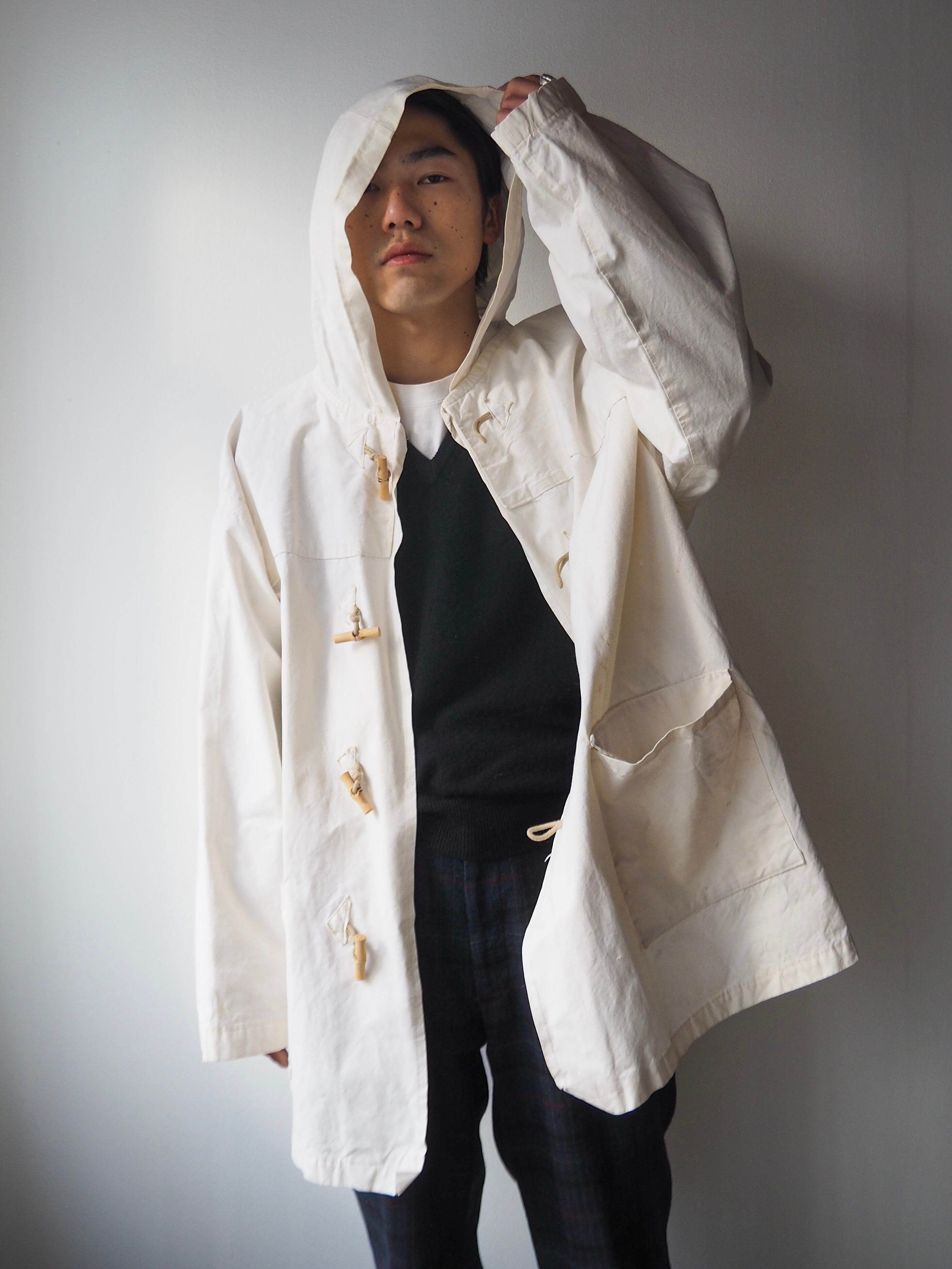 フロントは伝統的な木製トグルと麻紐による前合わせ。肩部分は補強のための生地が二重に充てられるダッフルコートに共通する仕様。