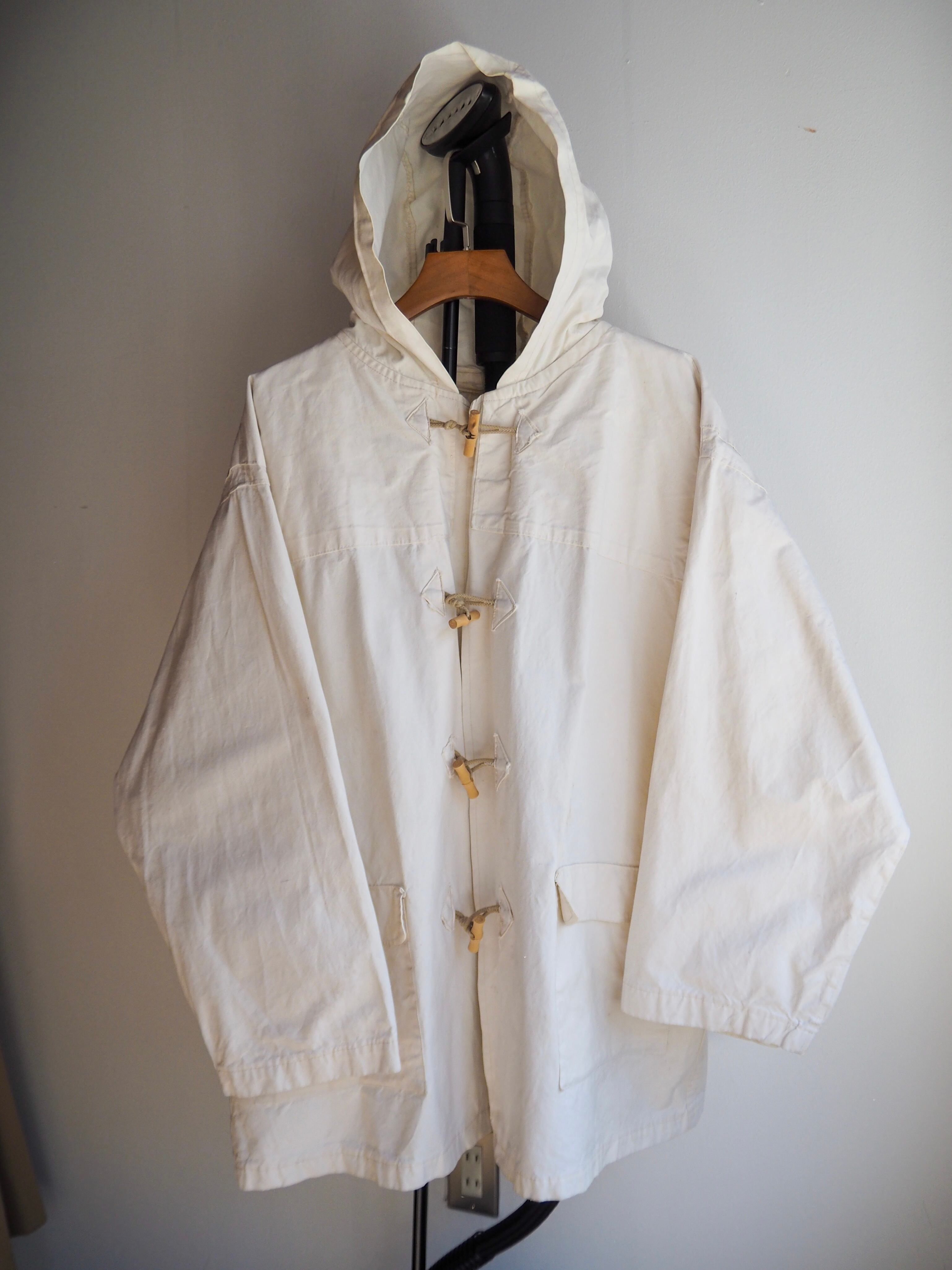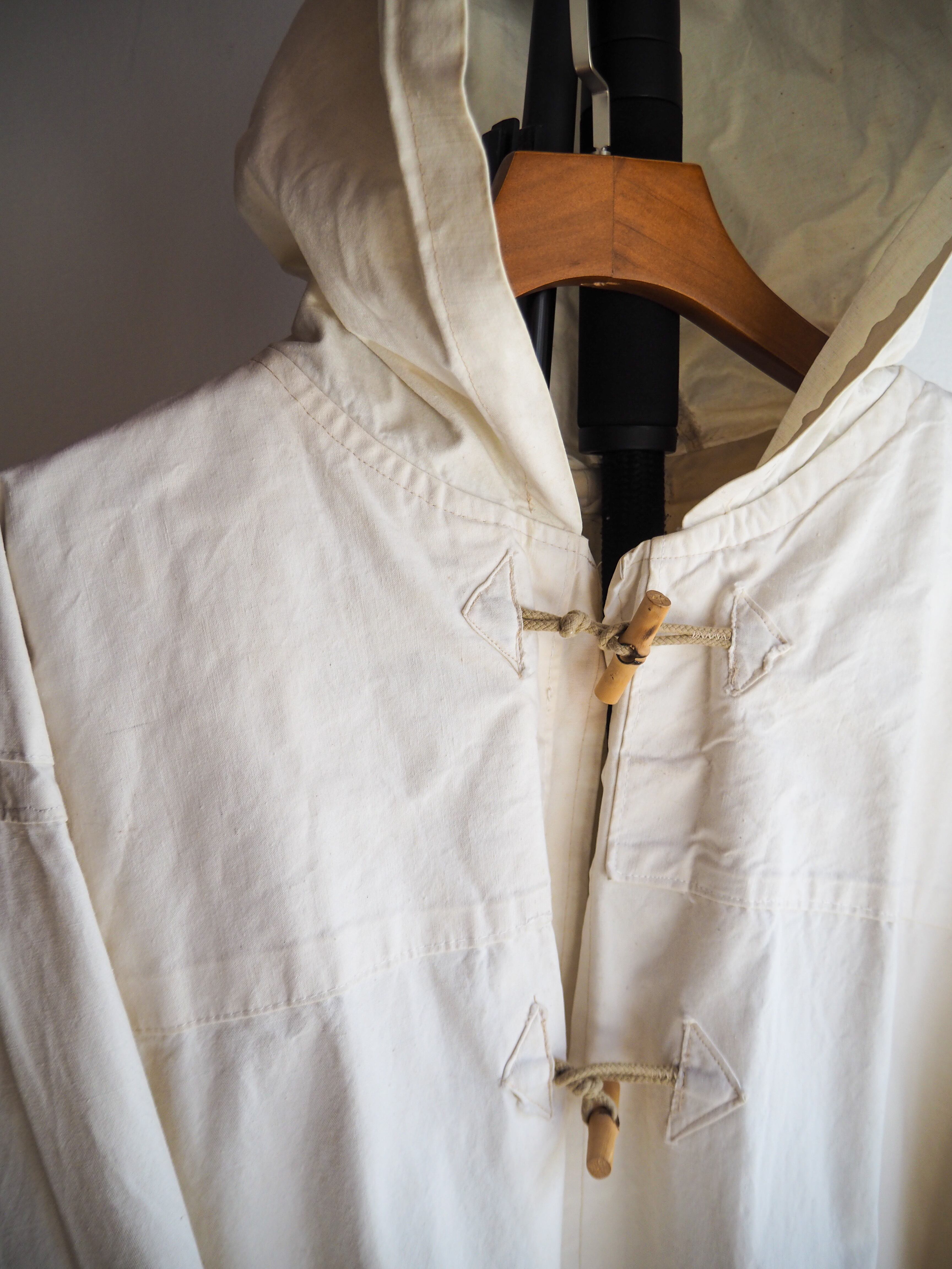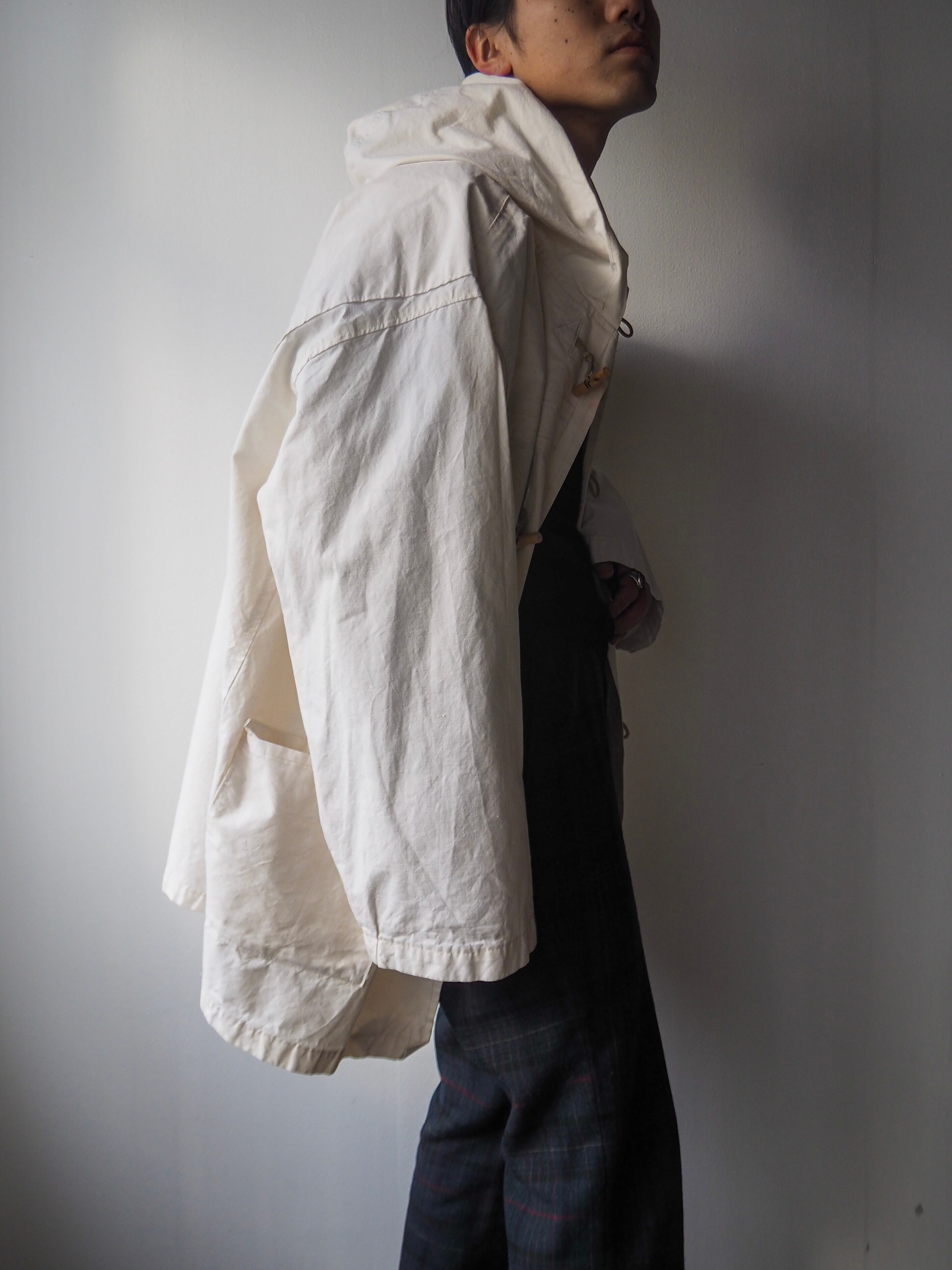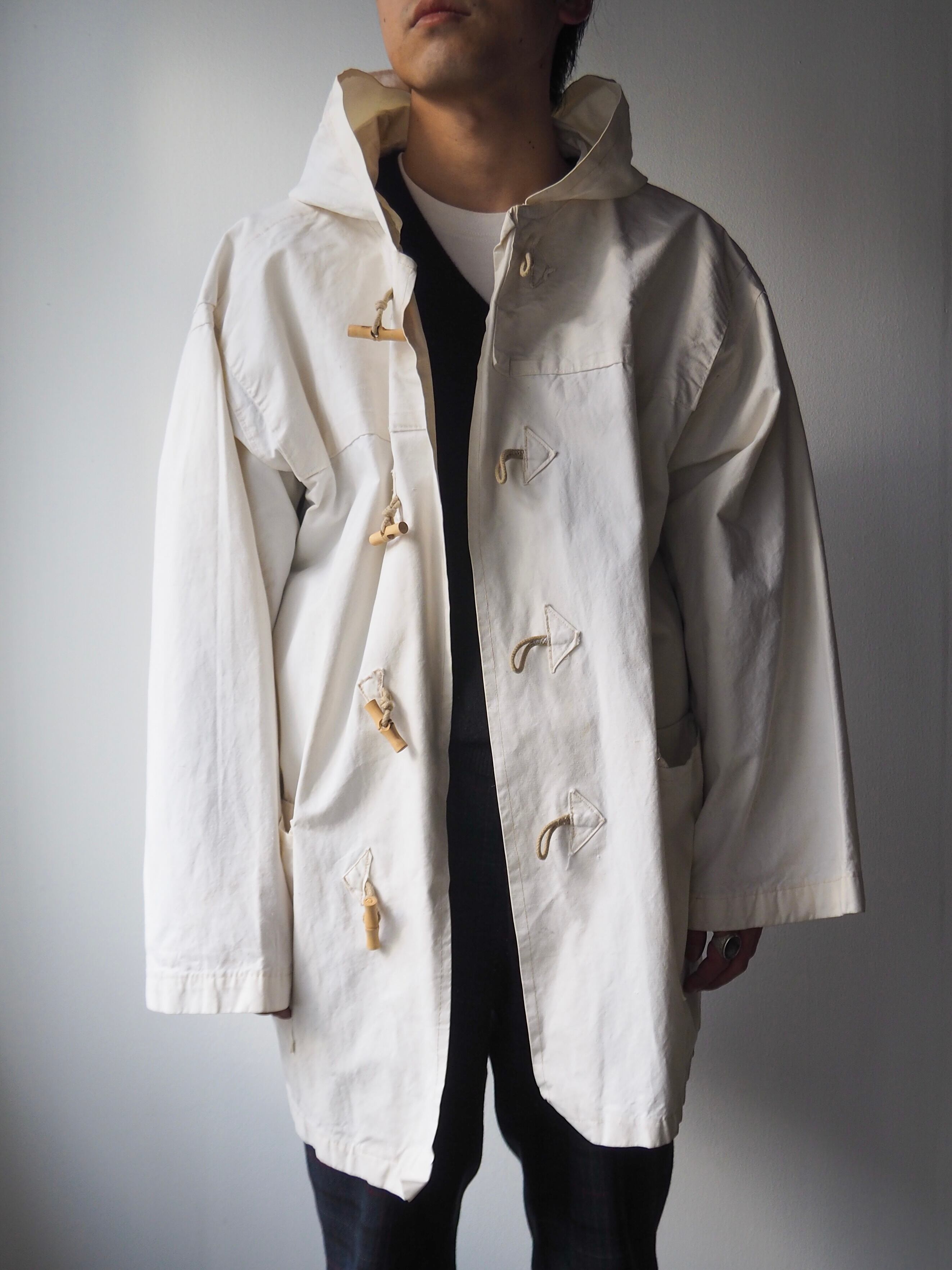 フロントは伝統的な木製トグルと麻紐による前合わせ。肩部分は補強のための生地が二重に充てられるダッフルコートに共通する仕様。