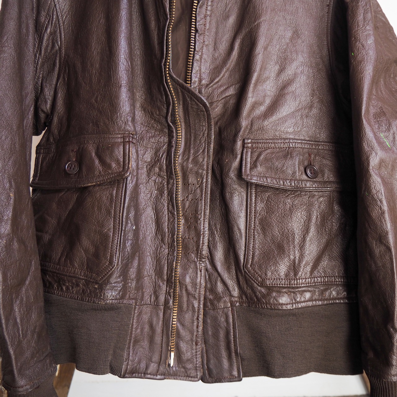 フロントに保管時の汚れ、左腕にペンキの付着が見られますがボディ自体に殆ど使用感は見られずリブの状態もすこぶる良好。これから着用していくに従って柔らかく体に馴染むゴートレザーの豊かな経年変化をお楽しみいただけるコンディションです。