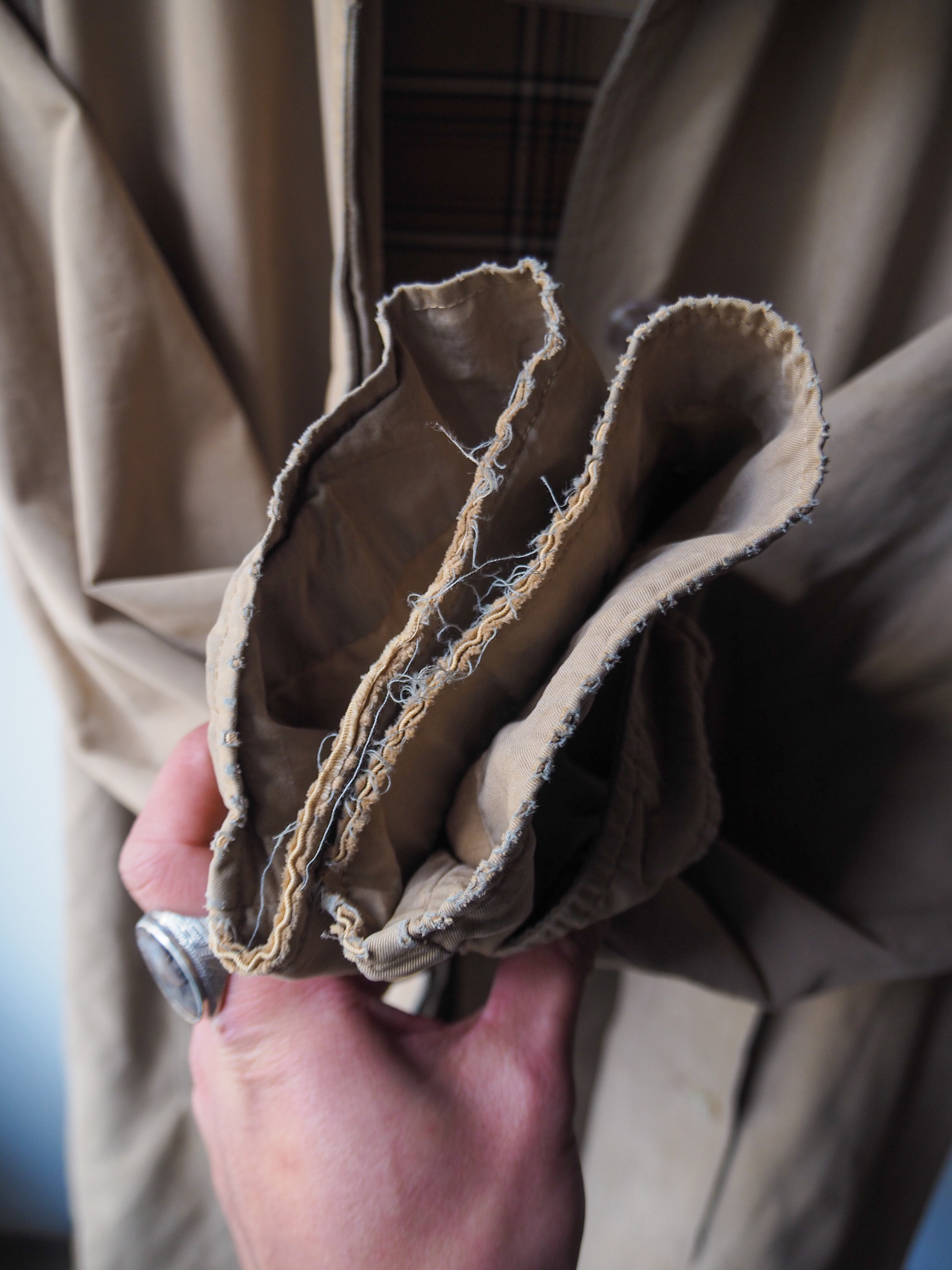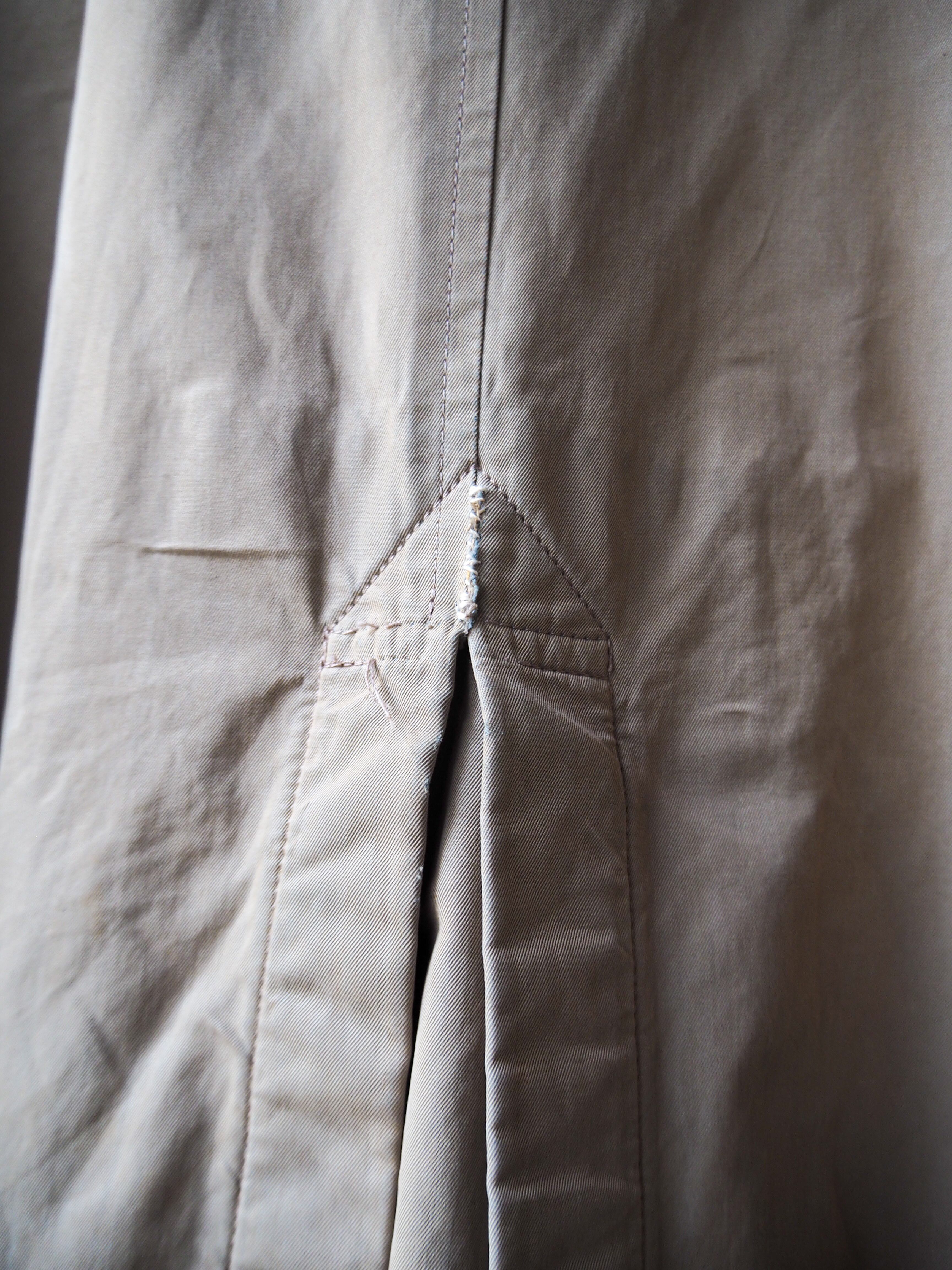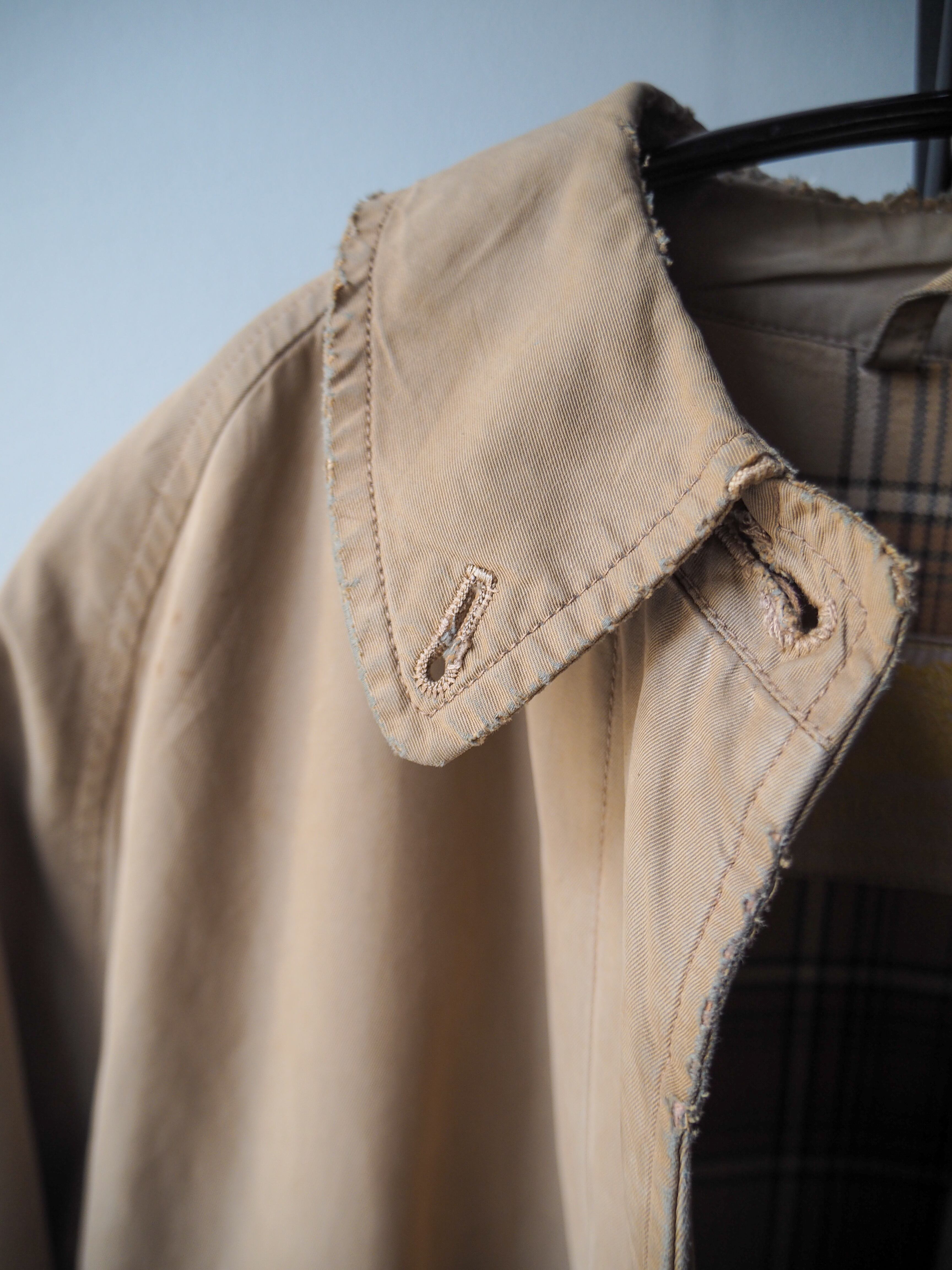 *首周りの破れはこれ以上拡がらないように針を入れています。その際経年をデザインとして際立たせるように縫い後を残しました。襟を寝かせれば縫い後が見えないよう幅を調節しておりますのでお好みでどうぞ。