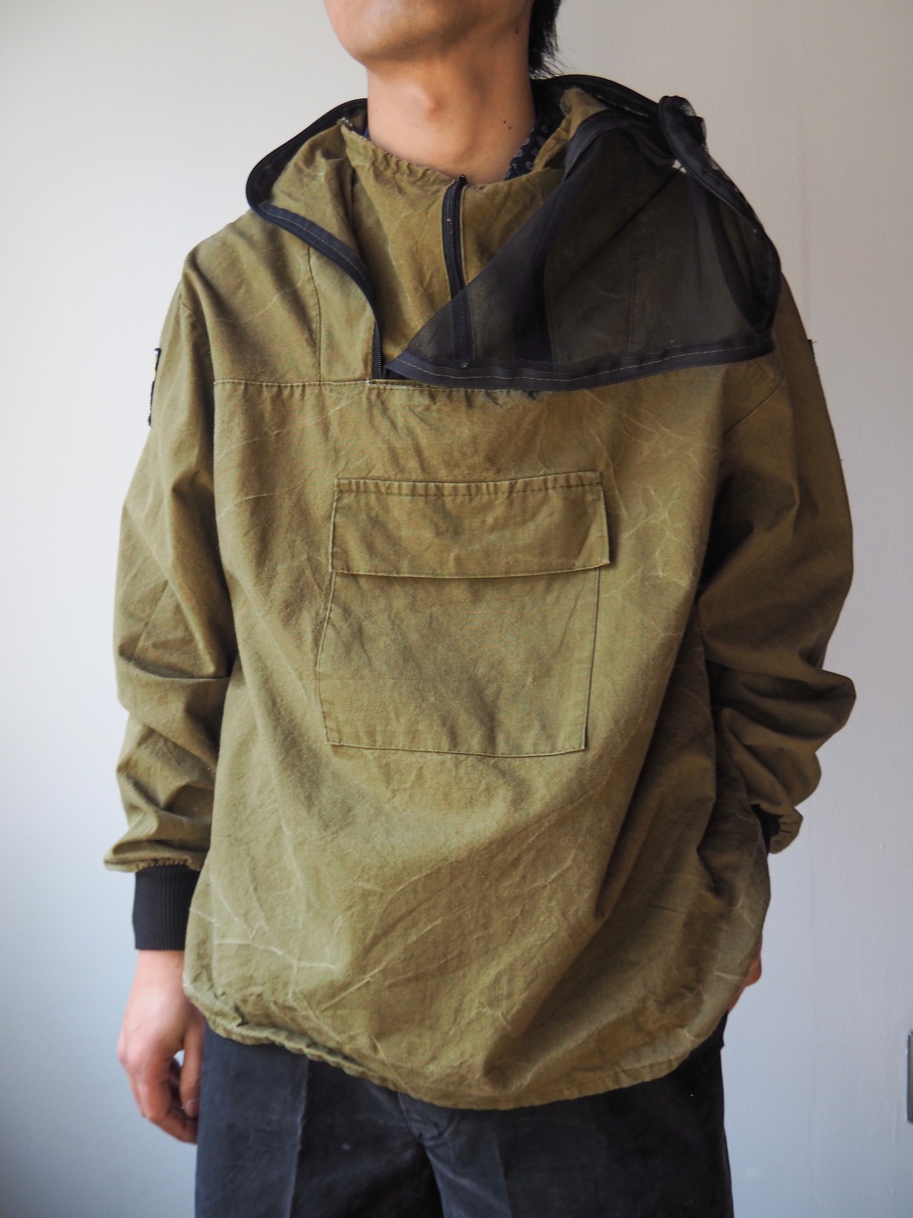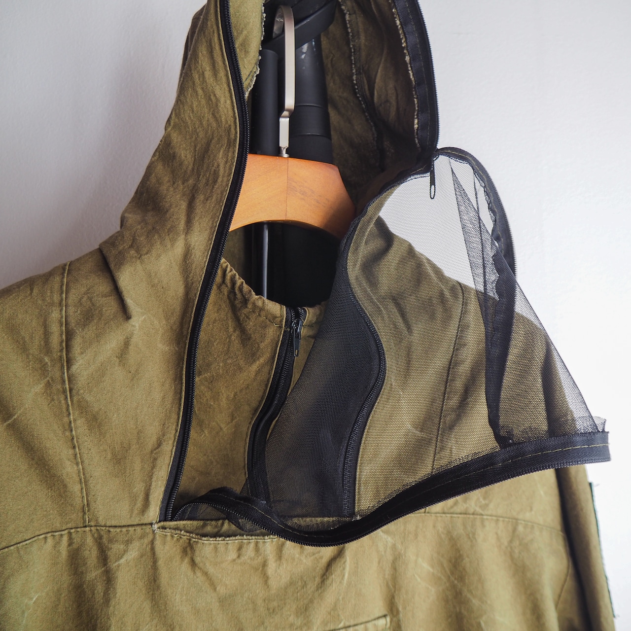 平織りのコットンボディに首から顔にかけてを覆い尽くすジッパー式のメッシュフラップ。下に付くポケットにメッシュを収納することが出来る仕様になっています。