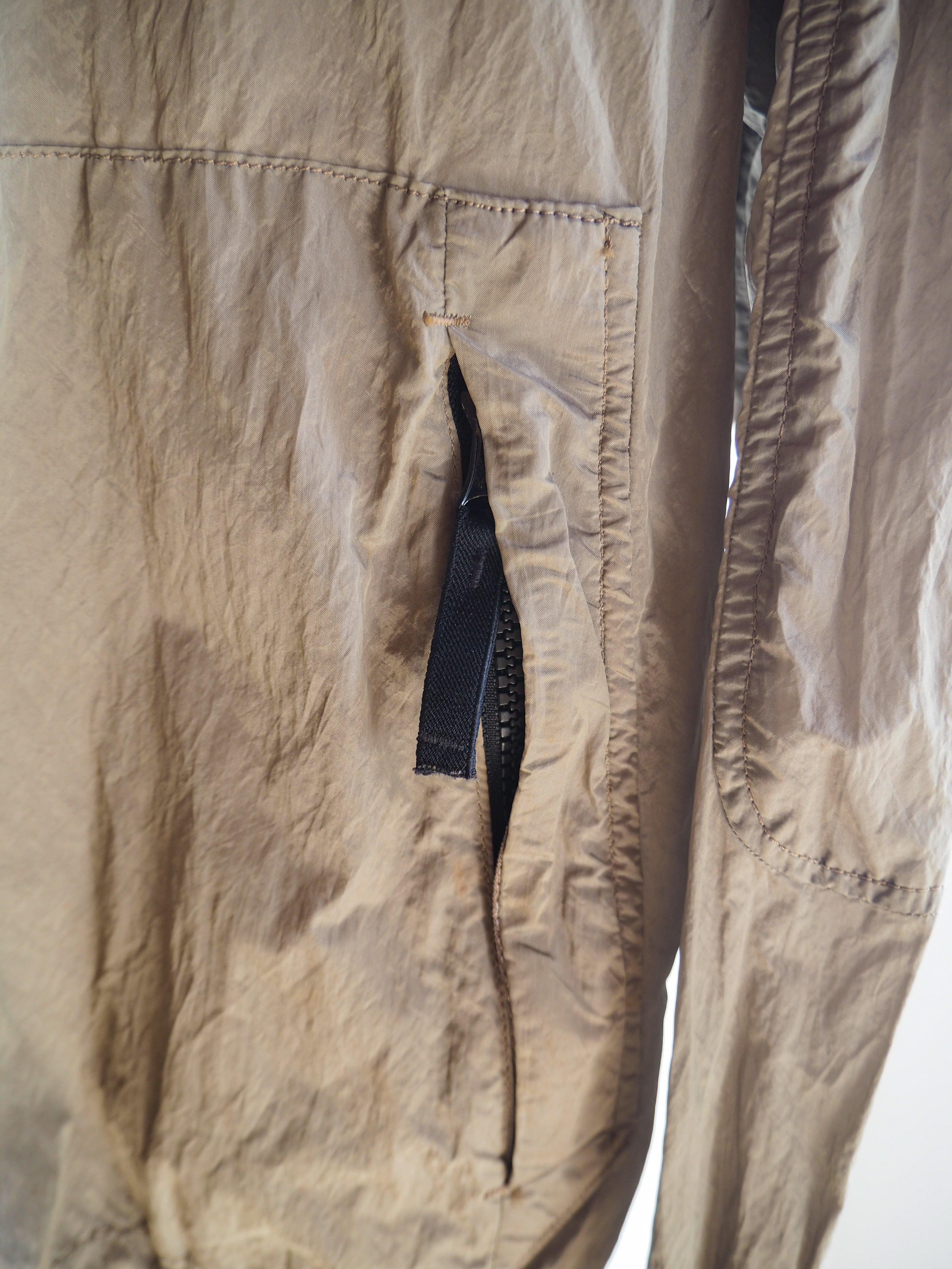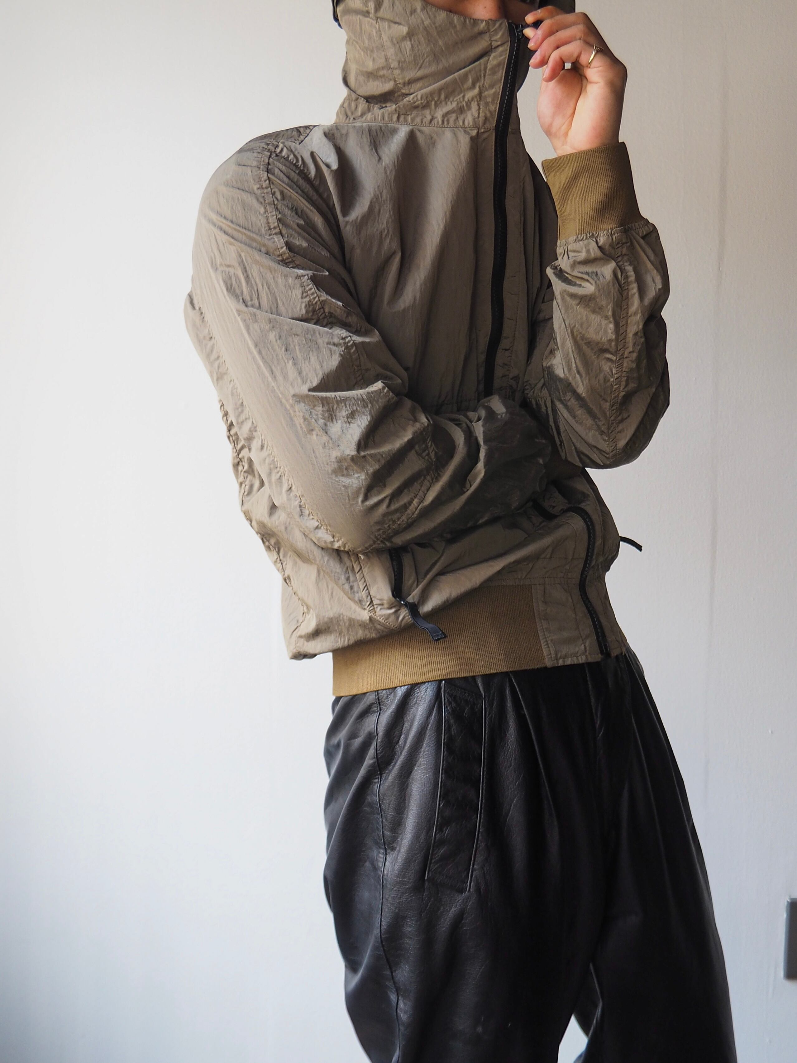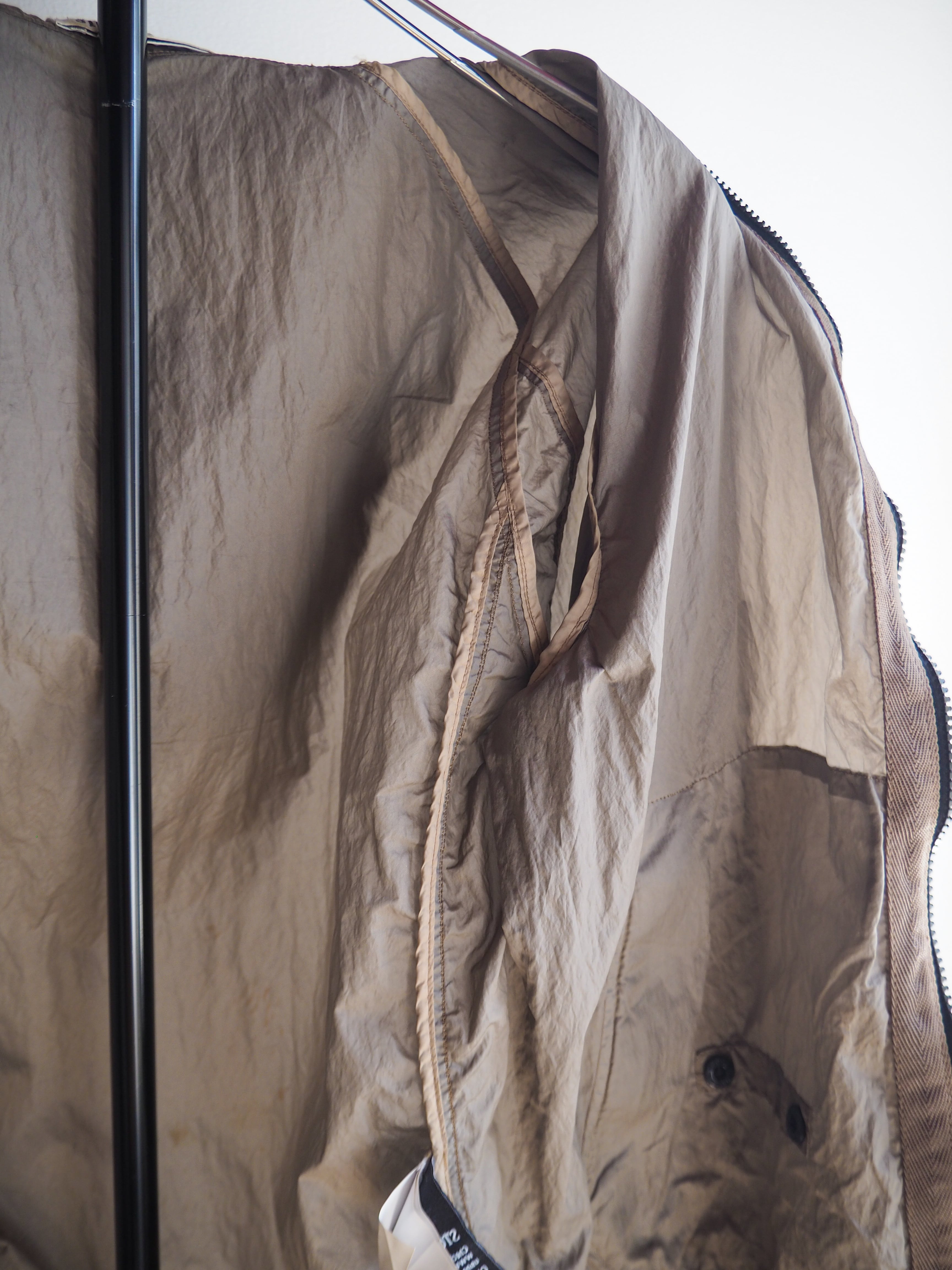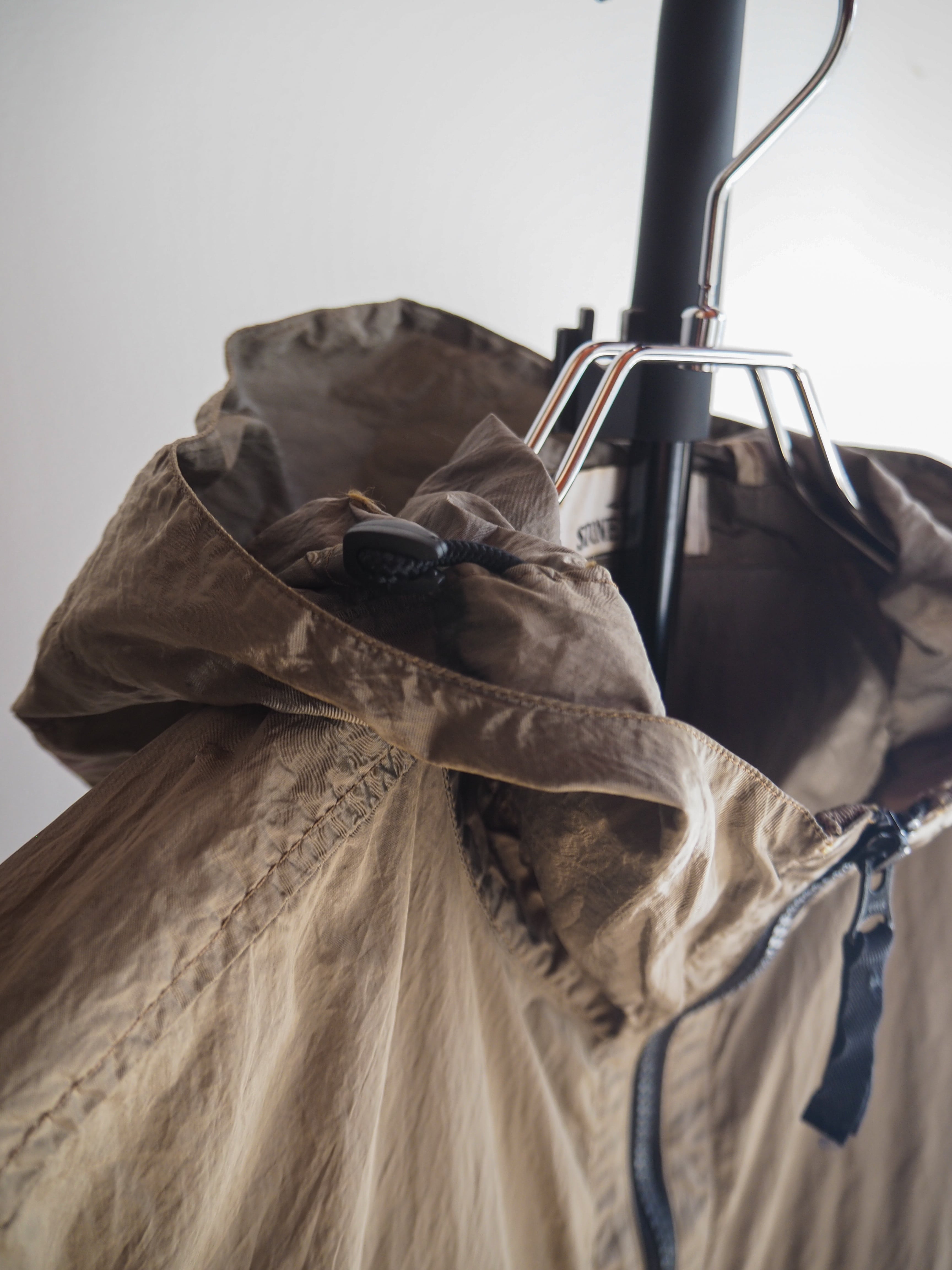 ポリアミド繊維を薄く、綿密に織り込んだ超軽量素材で構成されるボディに縫製後ガーメント・ダイを施すことで独特の光沢感と共に防水性、撥水性を獲得した1着。
