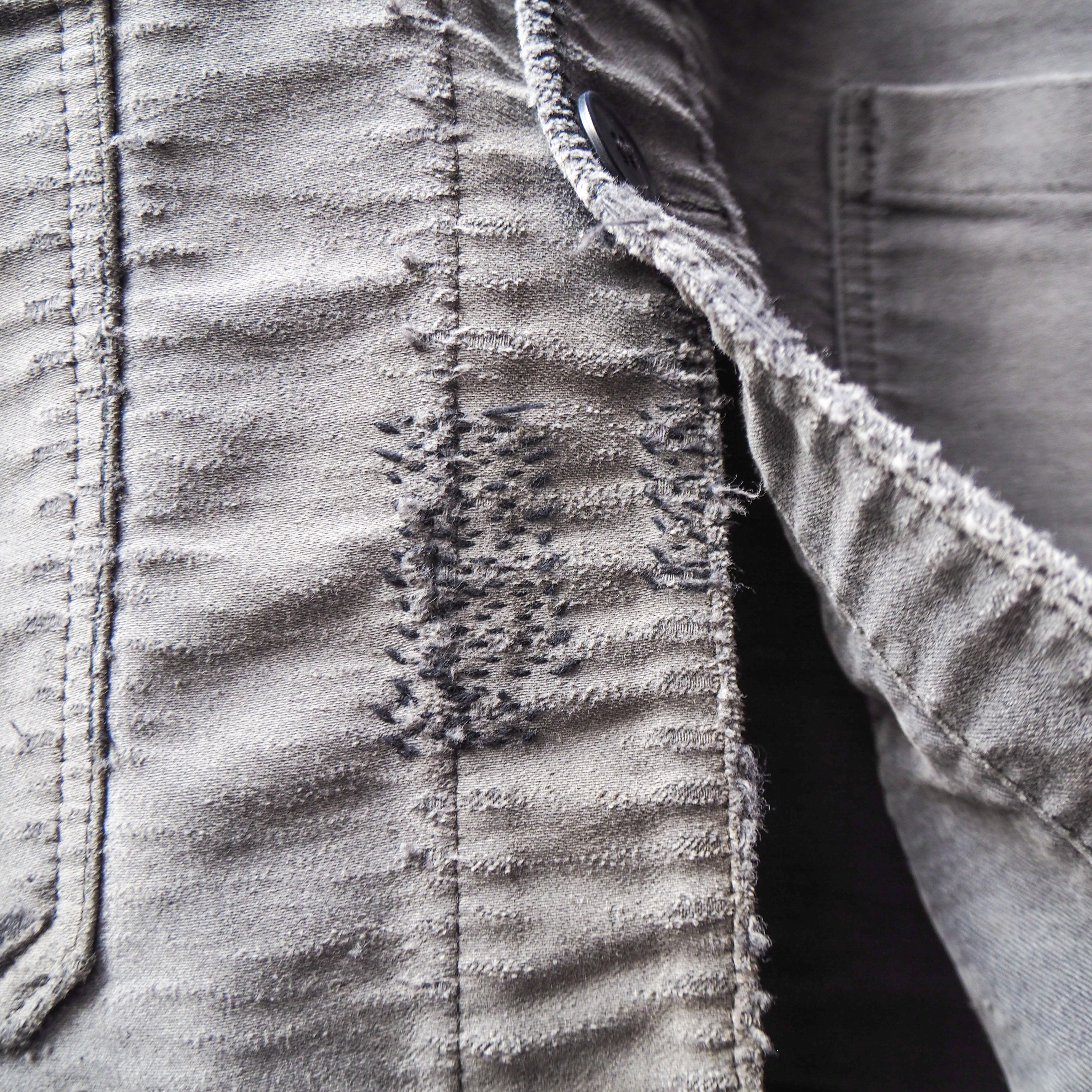 その柔らかく変化した優しい生地感もさながら、各所にあしらわれた手刺繍によるダーニングの味わい深い表情も見逃せません。