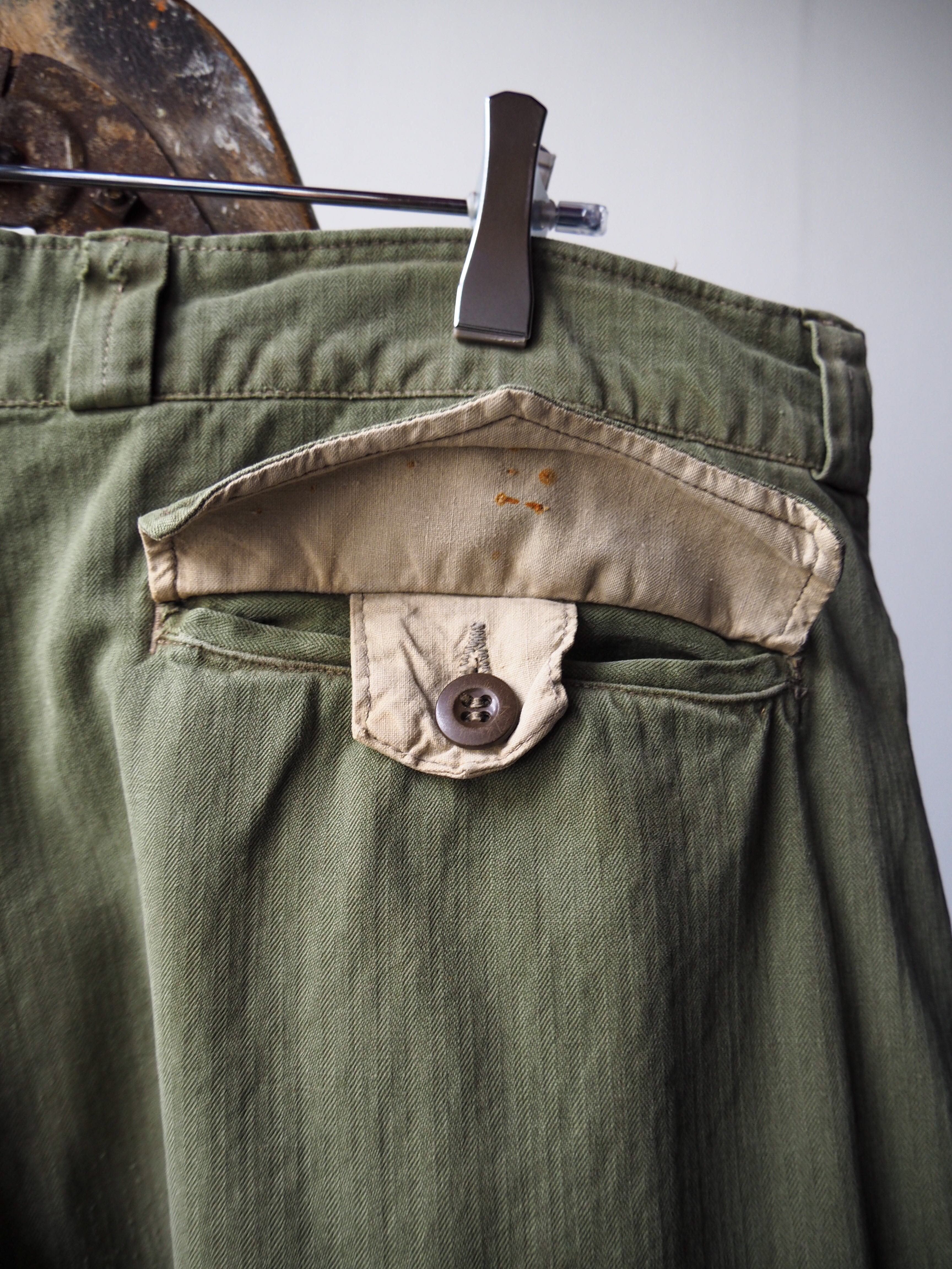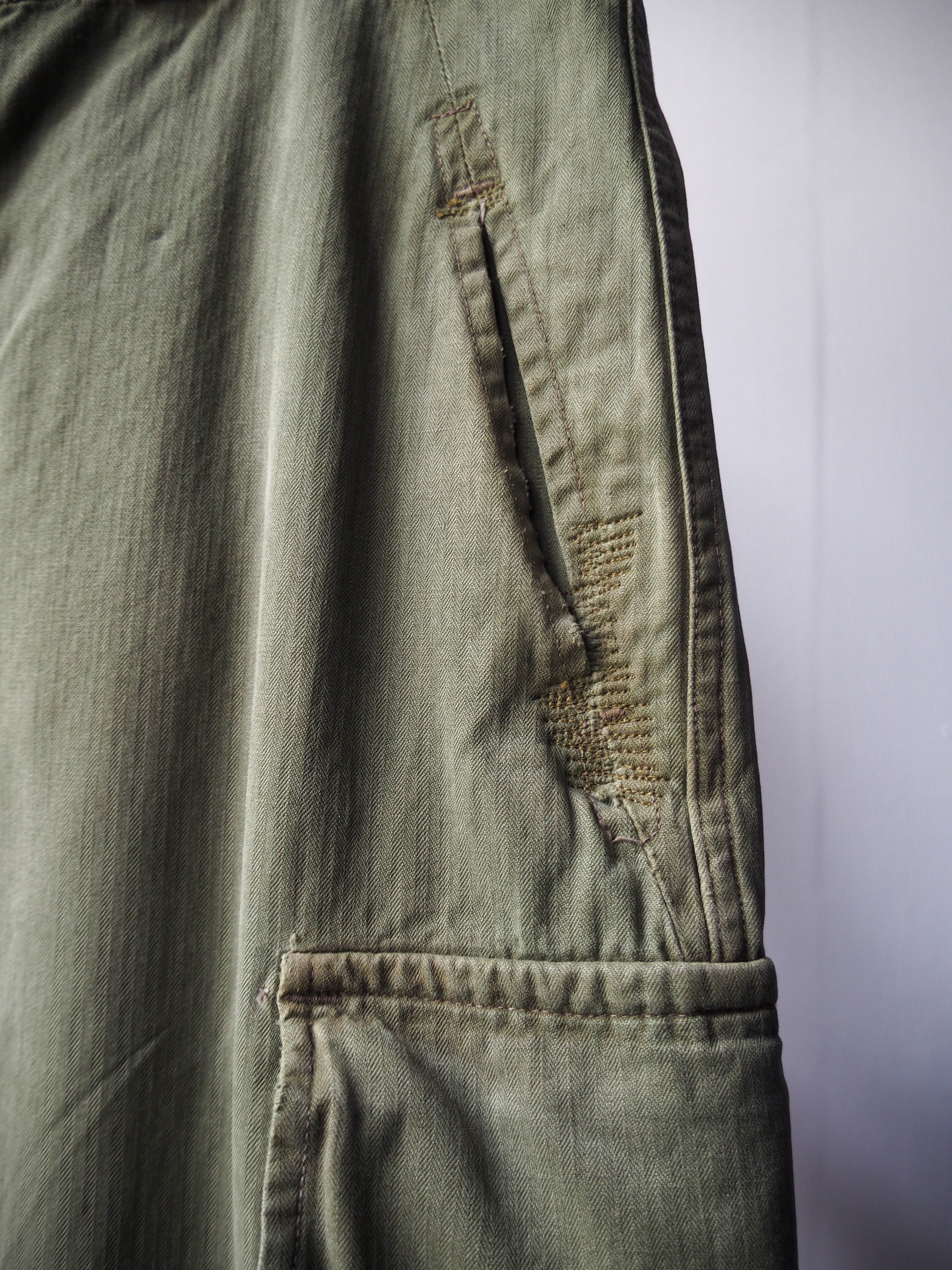 裾先にかけて綺麗に落ちるややテーパードの効いた美しいシルエットに程よく使い込まれたことにより表情を増したHBT生地の表情、各所に施された丁寧なタタキ跡が雰囲気抜群です。