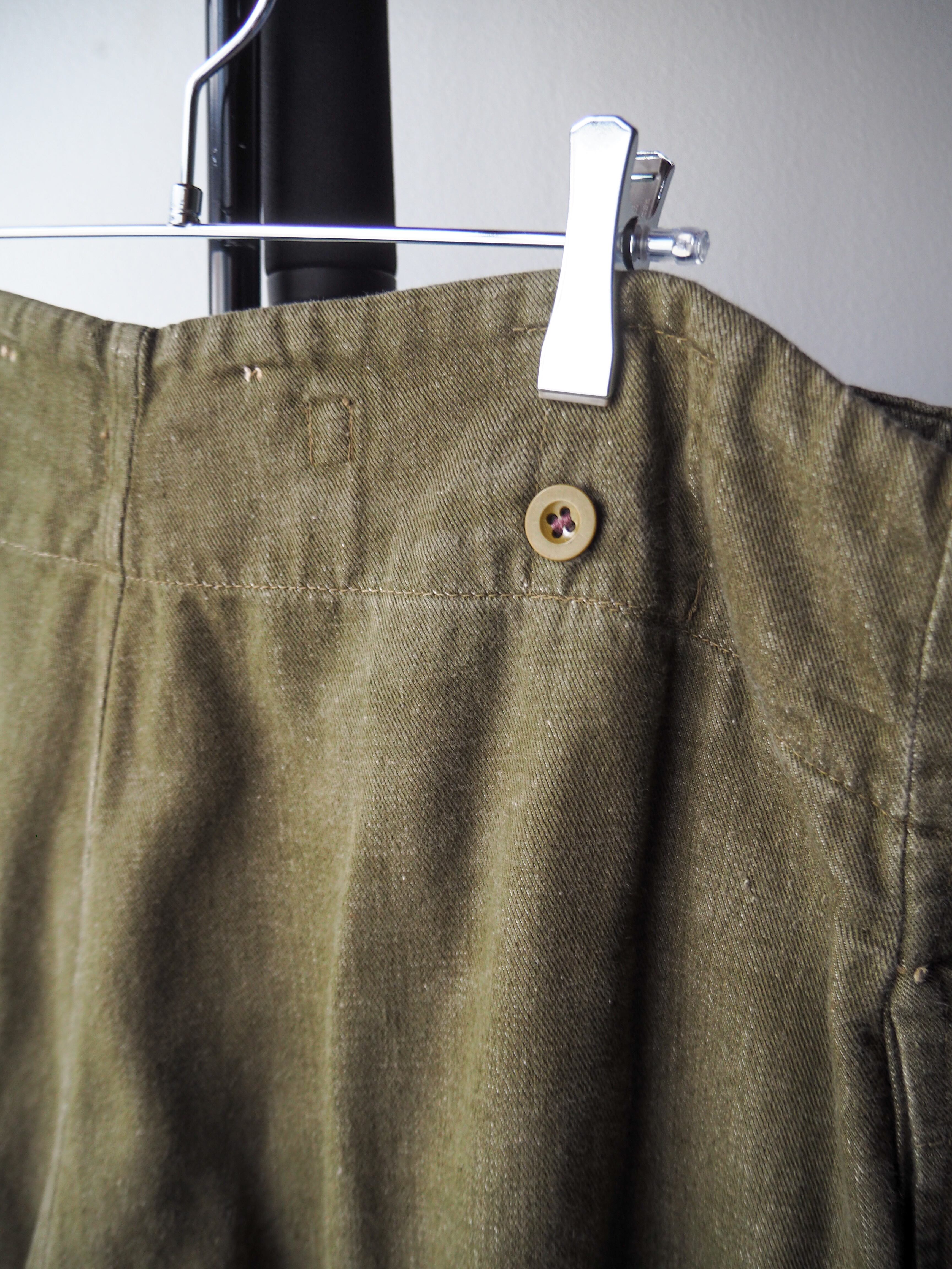 オーバーパンツとして設計されただけあって股上が深く、ズドンと太いボリューム感のあるシルエット。裾を太めにロールアップして、裏地のセルビッチを見せてあげると洒落が効いて格好良いかと思います。