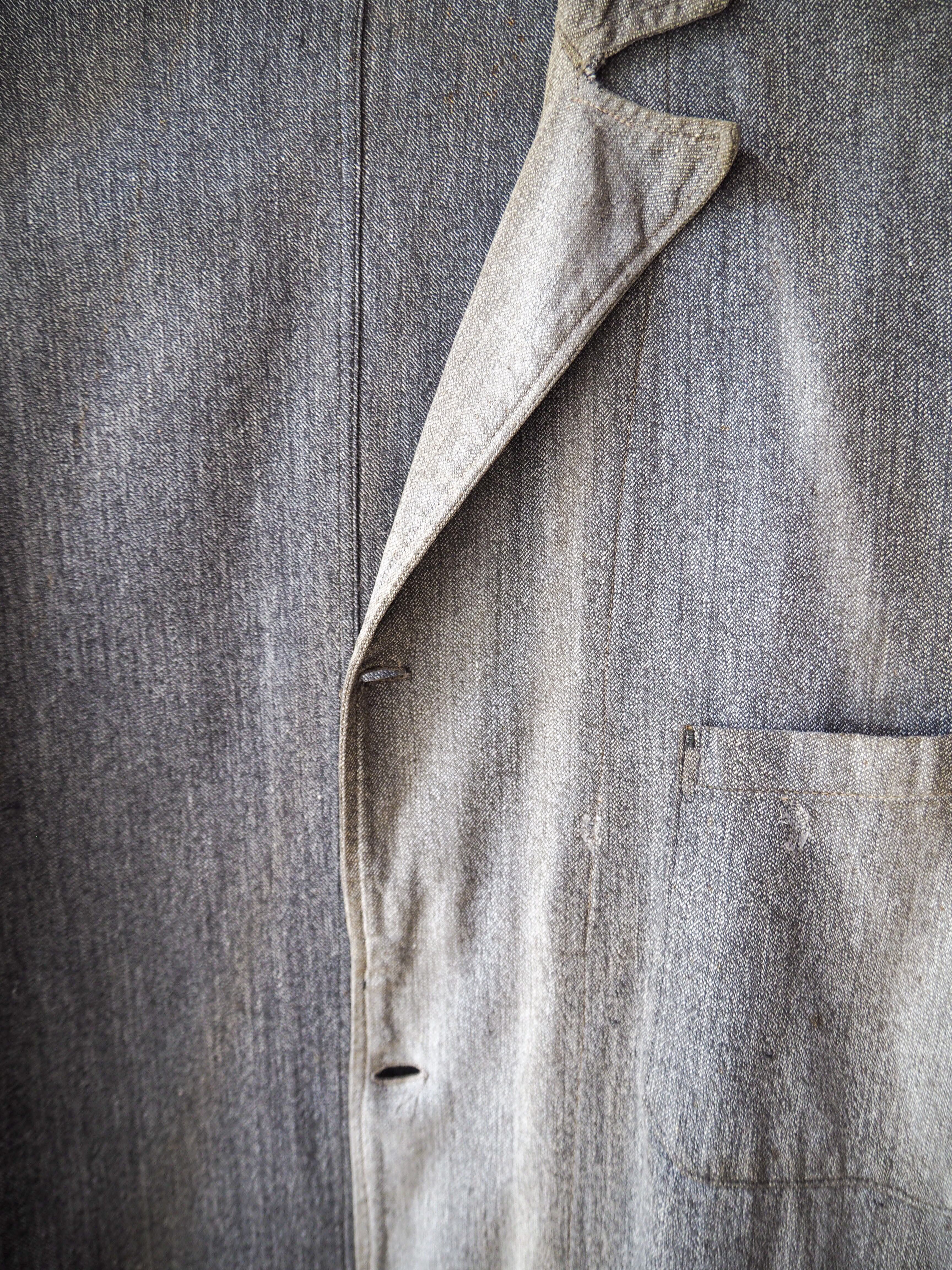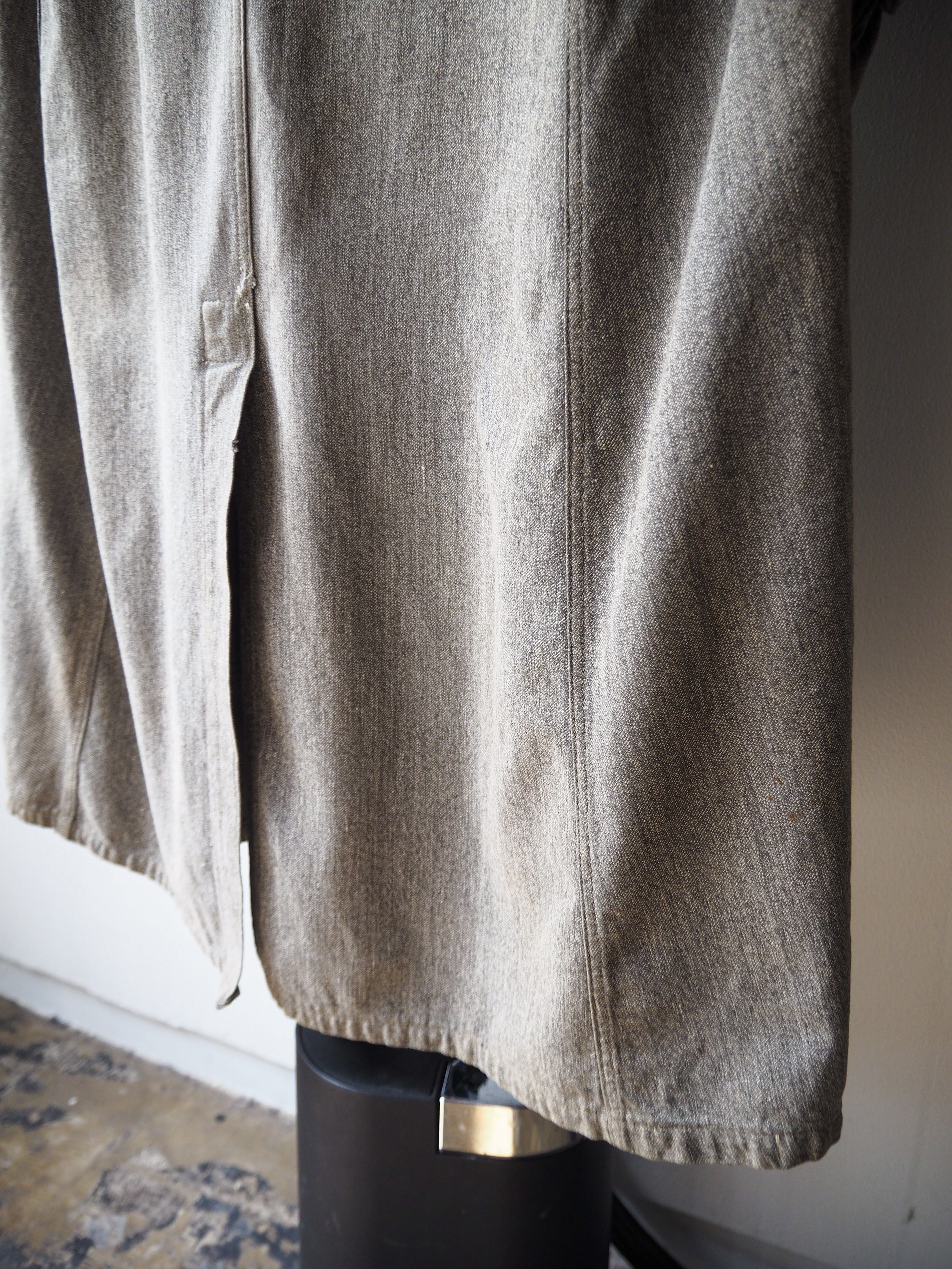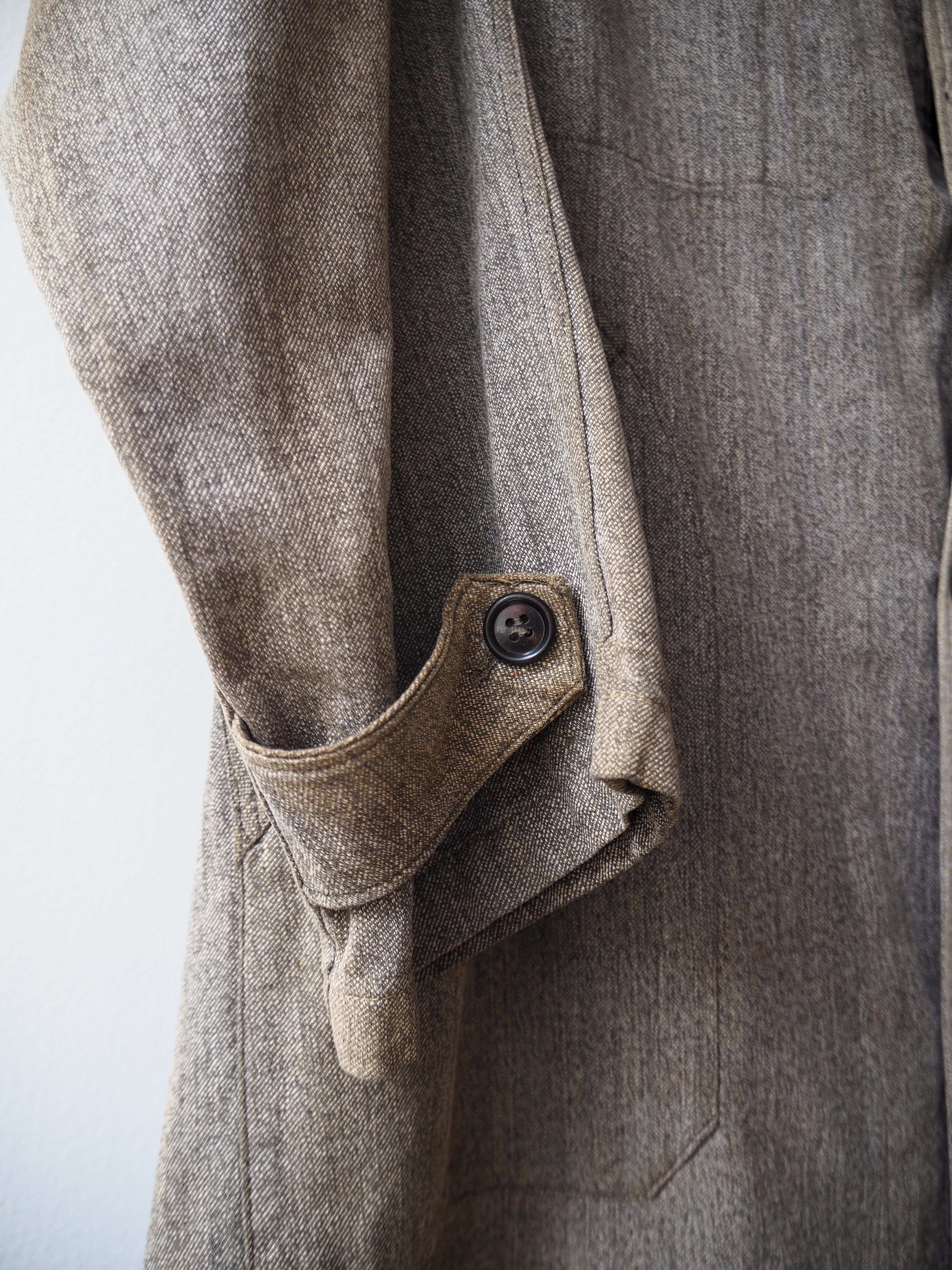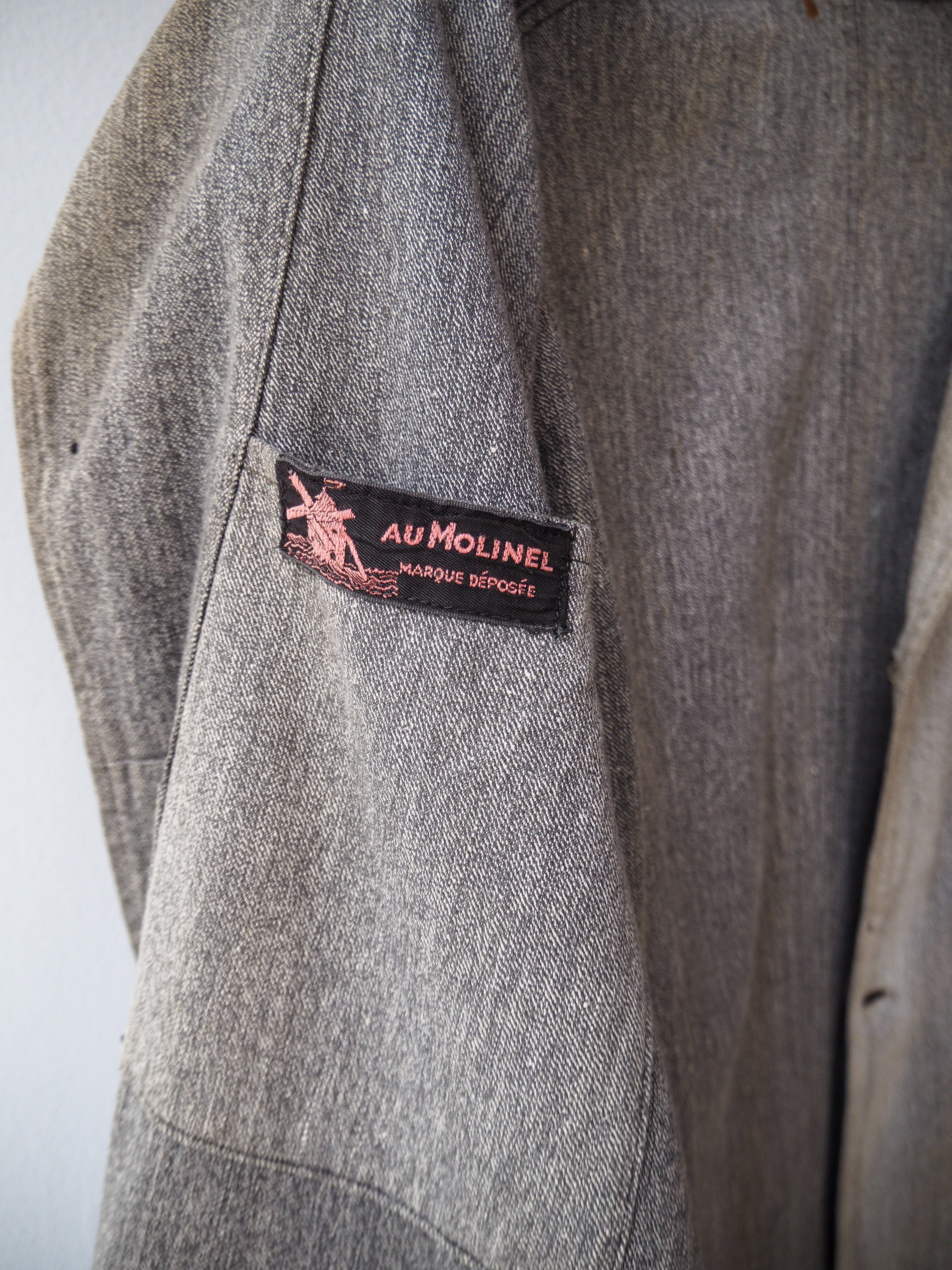 素材は「黒シャン」と呼ばれる、黒糸と白糸を掛け合わせて織られたブラックシャンブレー生地。凸凹感のあるザラッとした質感でこの生地感に惚れ込む方も多く、フレンチヴィンテージを代表する素材の1つです。