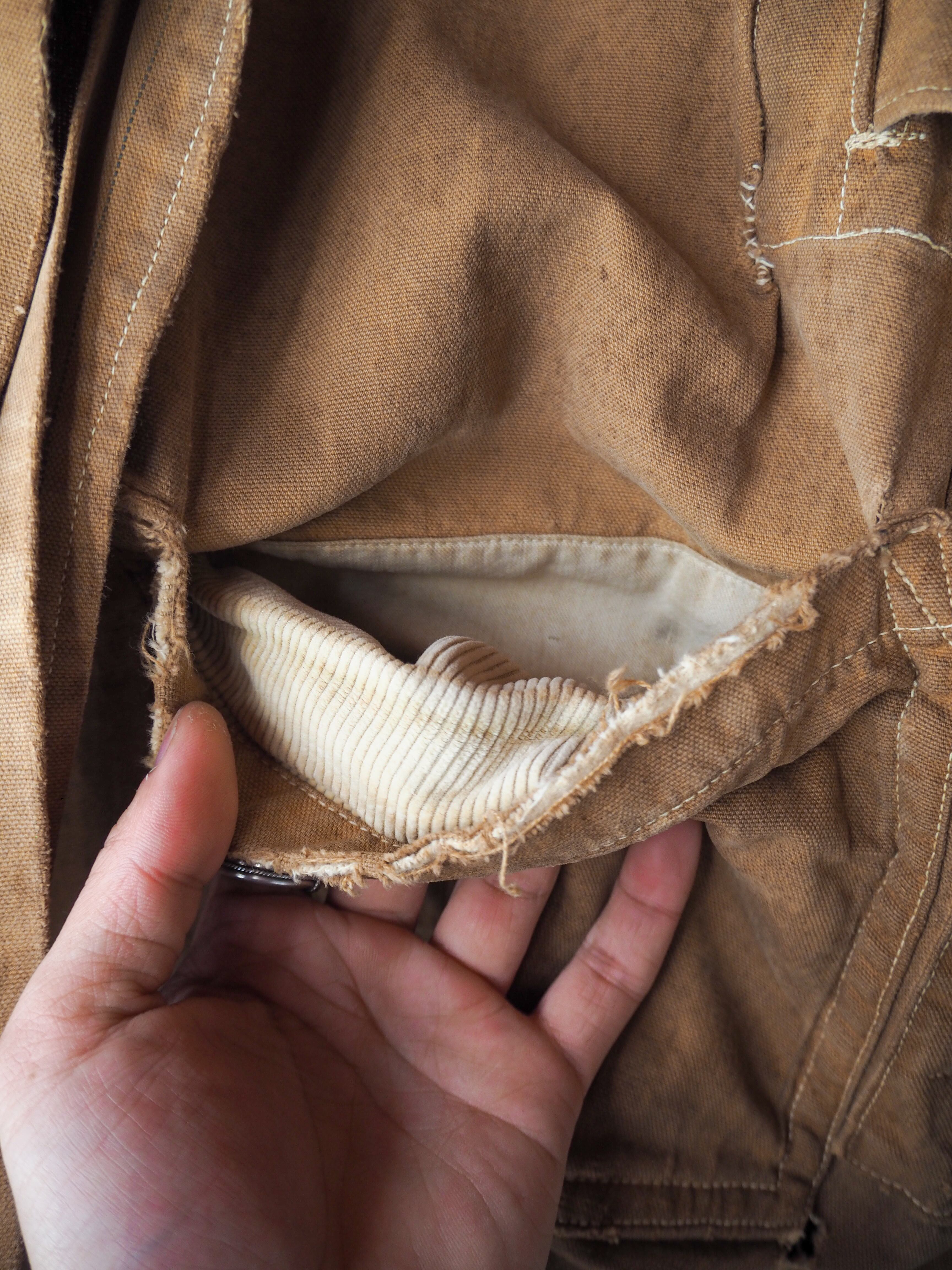胸ポケットが殊更大きくとられており生地感、特殊な前合わせ含めかなり珍しい1着です。ポケット内部は全て補強のためのコーデュロイ生地が充てられている点も意匠が込んでいます。