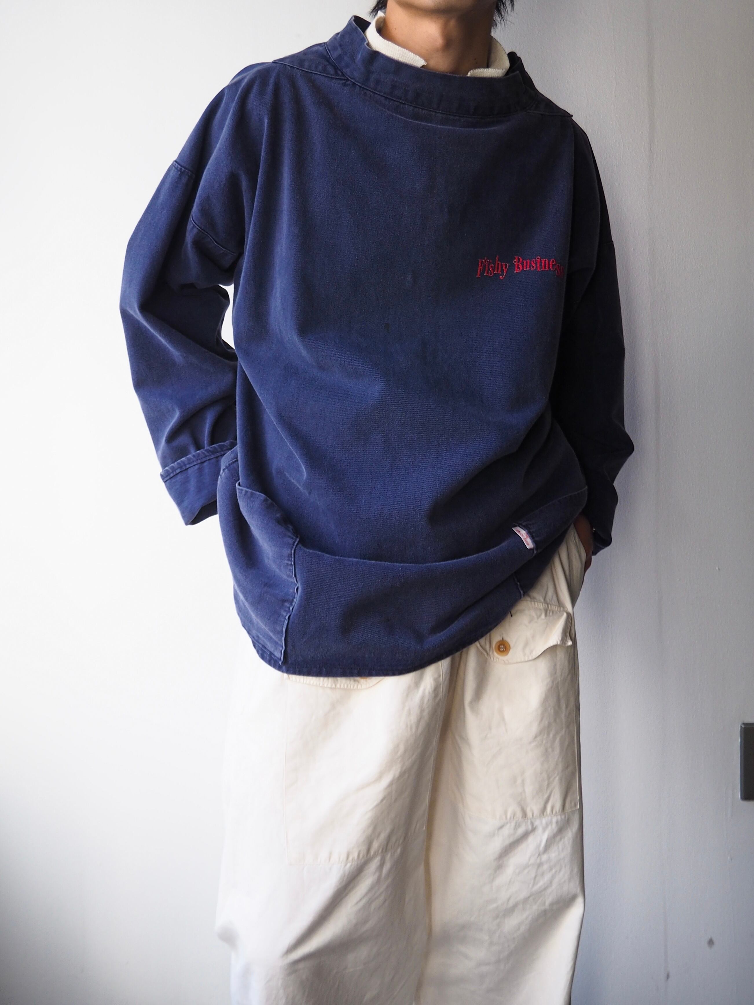 モックネック仕様の首周りに前見頃と後ろ見頃が均等に寸断、構築されるこちらのスモックは元々イギリス海軍に着用されていたスモックではございましたが、ウェールズなどの漁業が盛んな沿岸部では漁師、フィッシャーマンたちのワークウェアとして古くから親しまれてきた歴史を持ちます。
