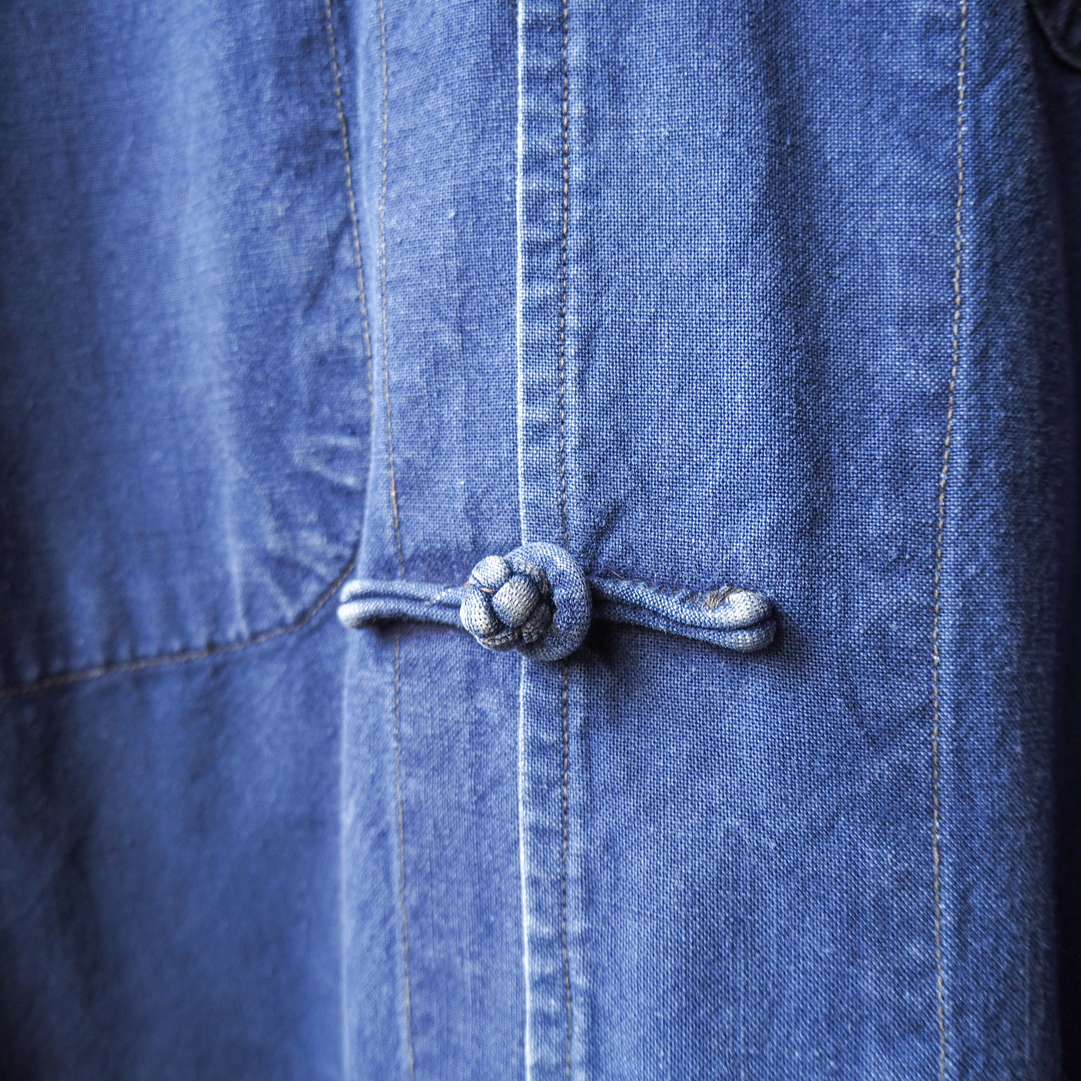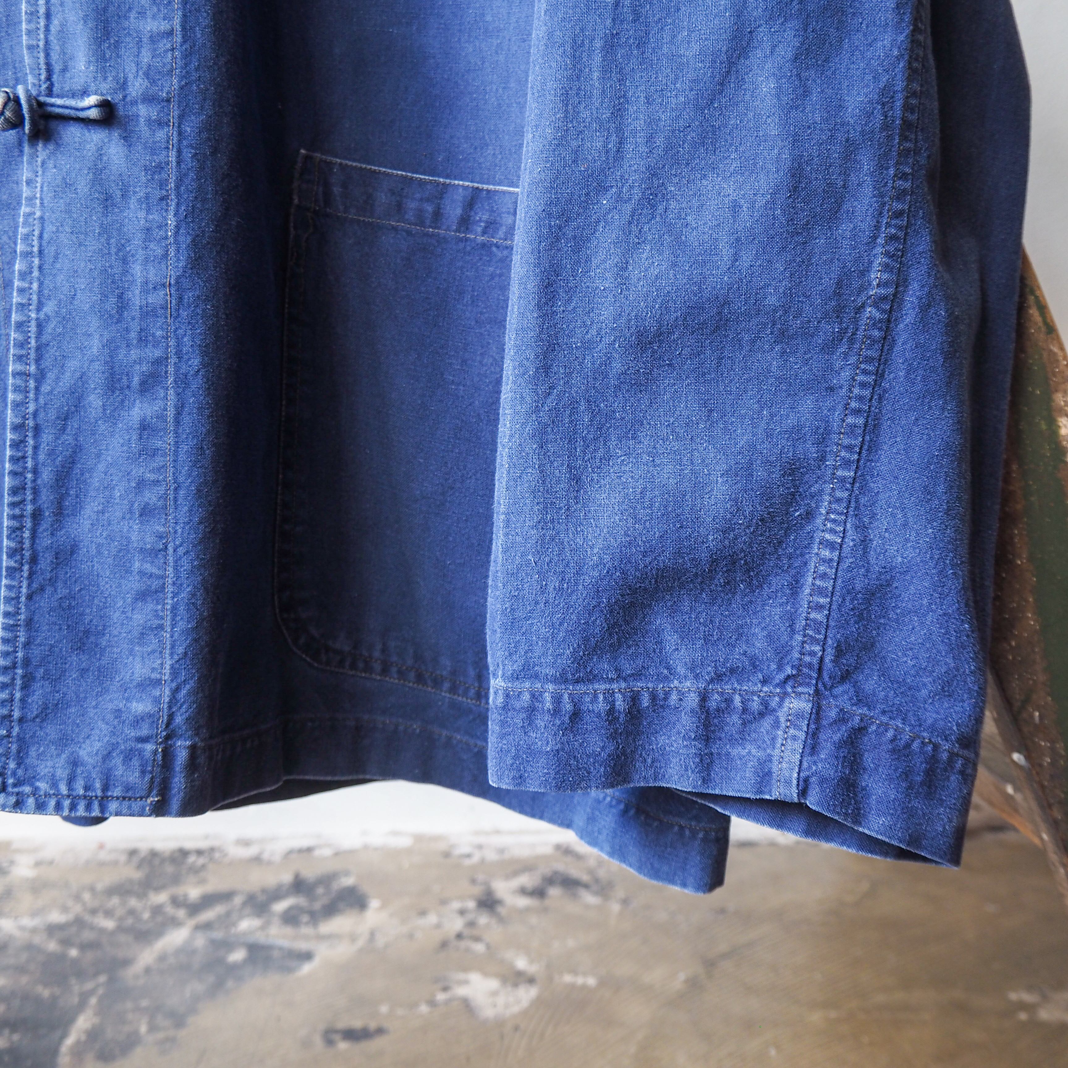 フロントにはフレンチワークらしい三つのポケットが付属していながら、前合わせは西洋の”洋服”に見られるボタン合わせではなく結び目を輪っかに通すチャイナシャツに特有の設計。