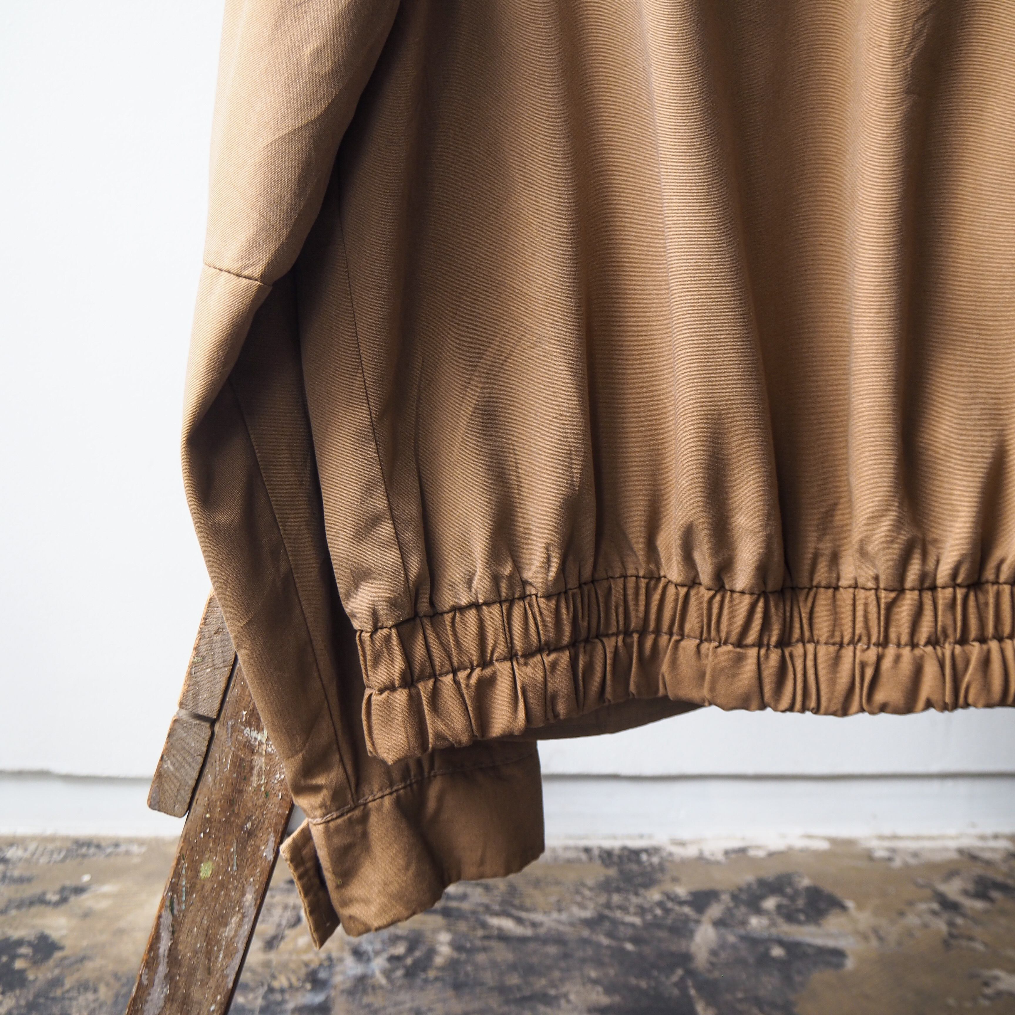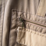 コットン×ポリエステルのやや光沢感のある混紡素材にフロントにジッパー、フラップ、スラッシュと計8個のポケットが付属するギミック満載の1着。