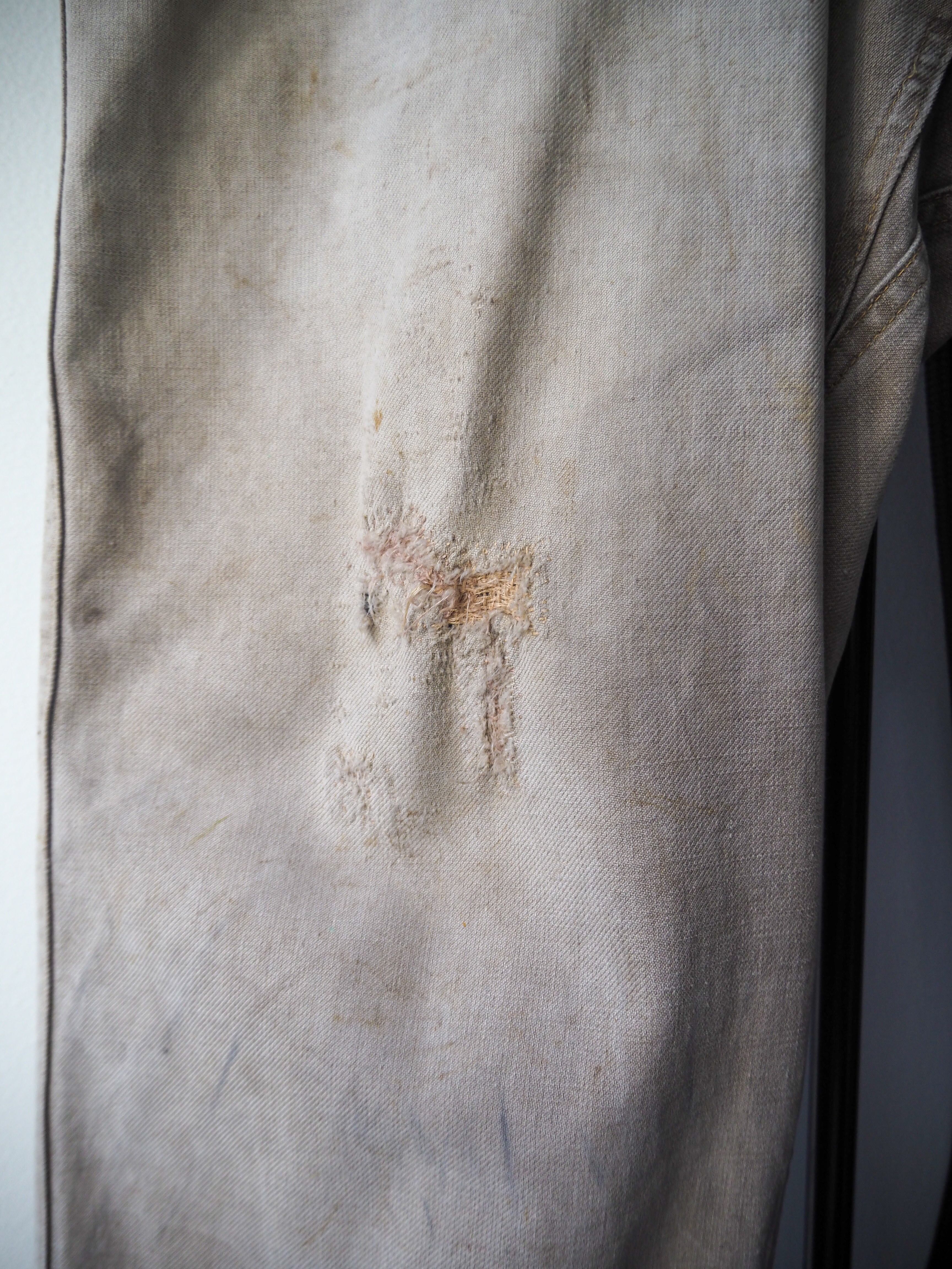 もともとのベージュカラーから繰り返し洗われたことによって褪色したコットン本来のオフホワイトの色味に各所にあしらわれた手刺繍によるリペア痕。たいへんにモードな表情でお召しいただけるかと思います。
