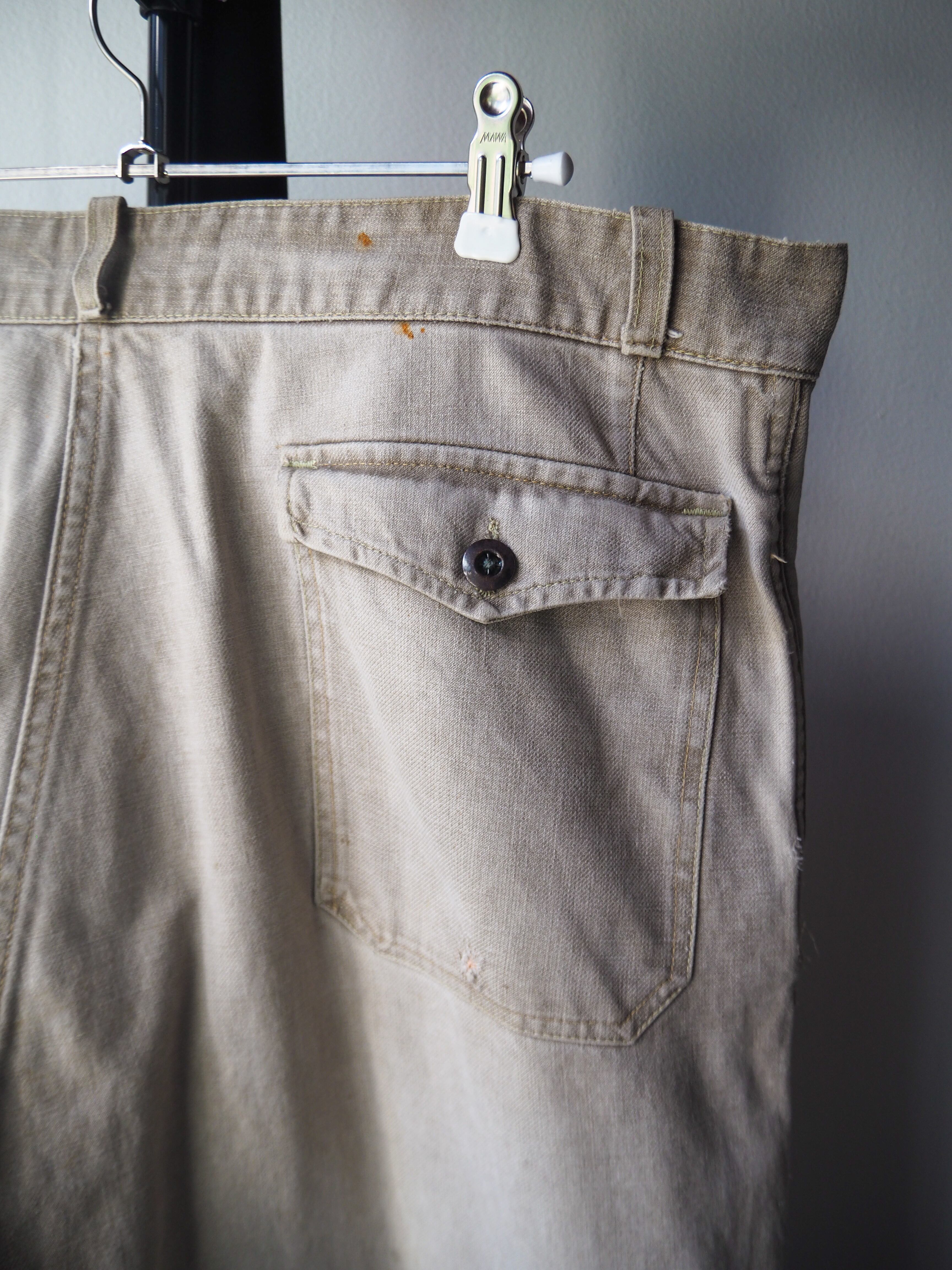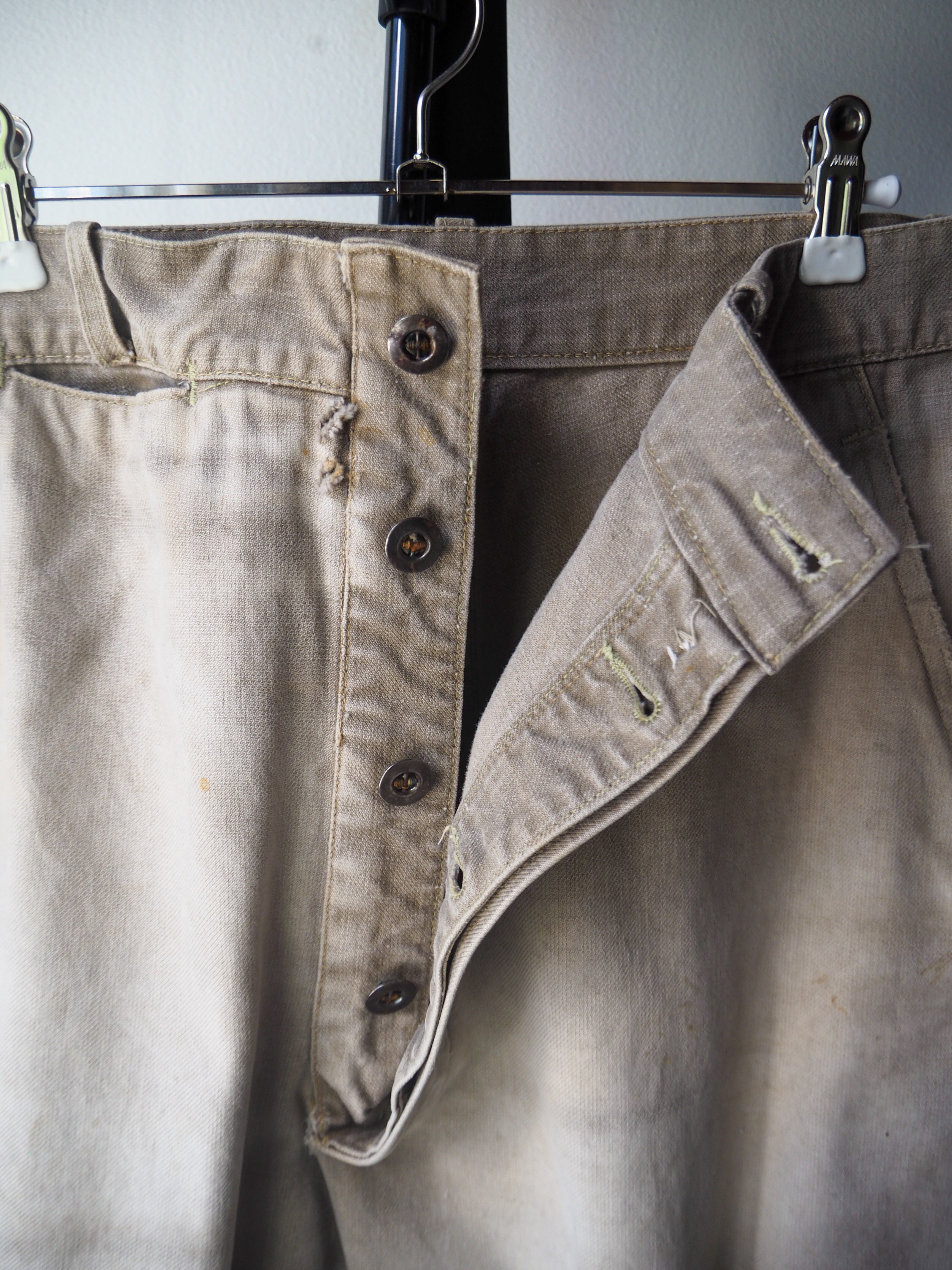 フロントはメタルボタンによるフライ仕様。フロントフックは欠損しております。