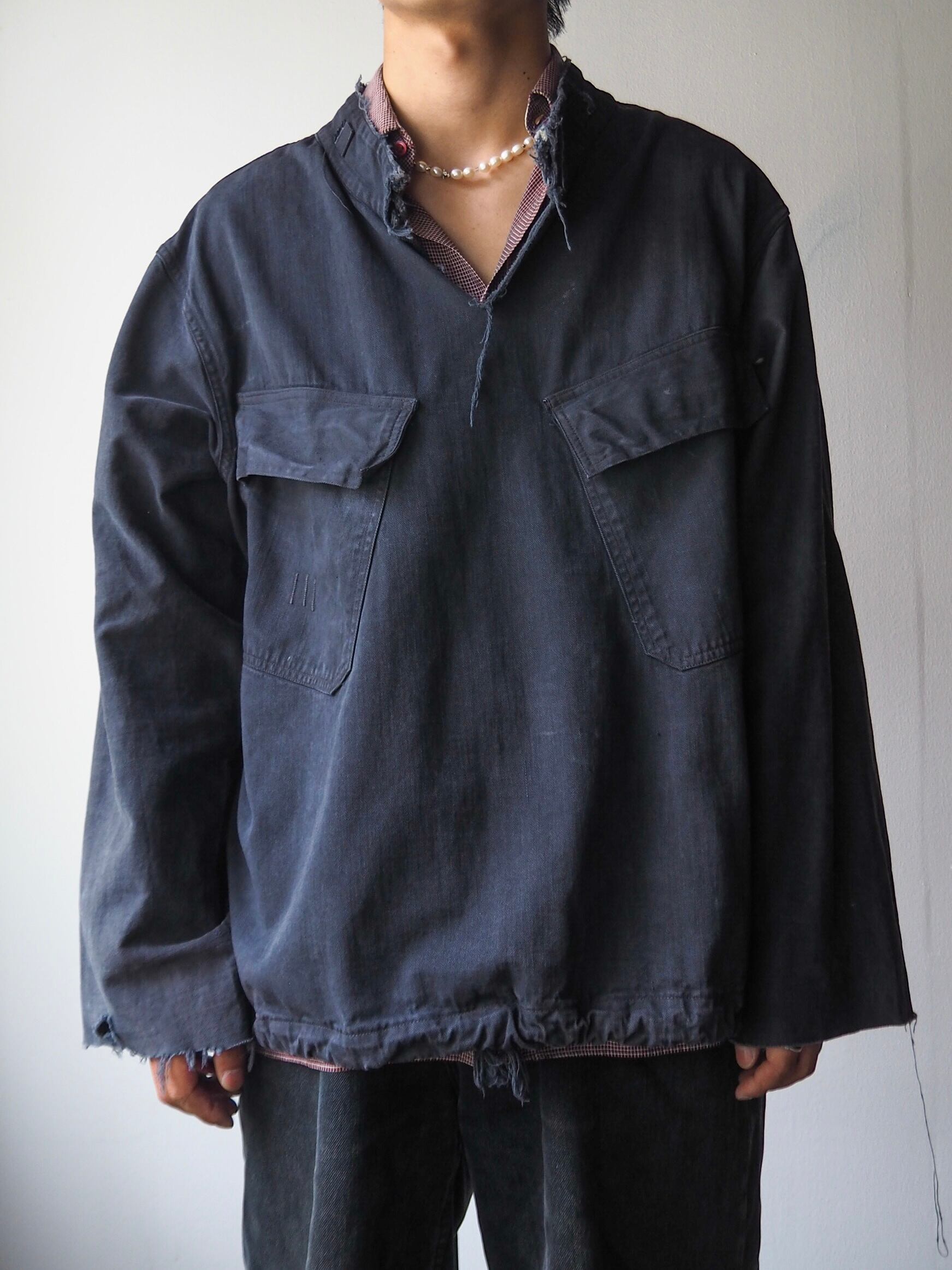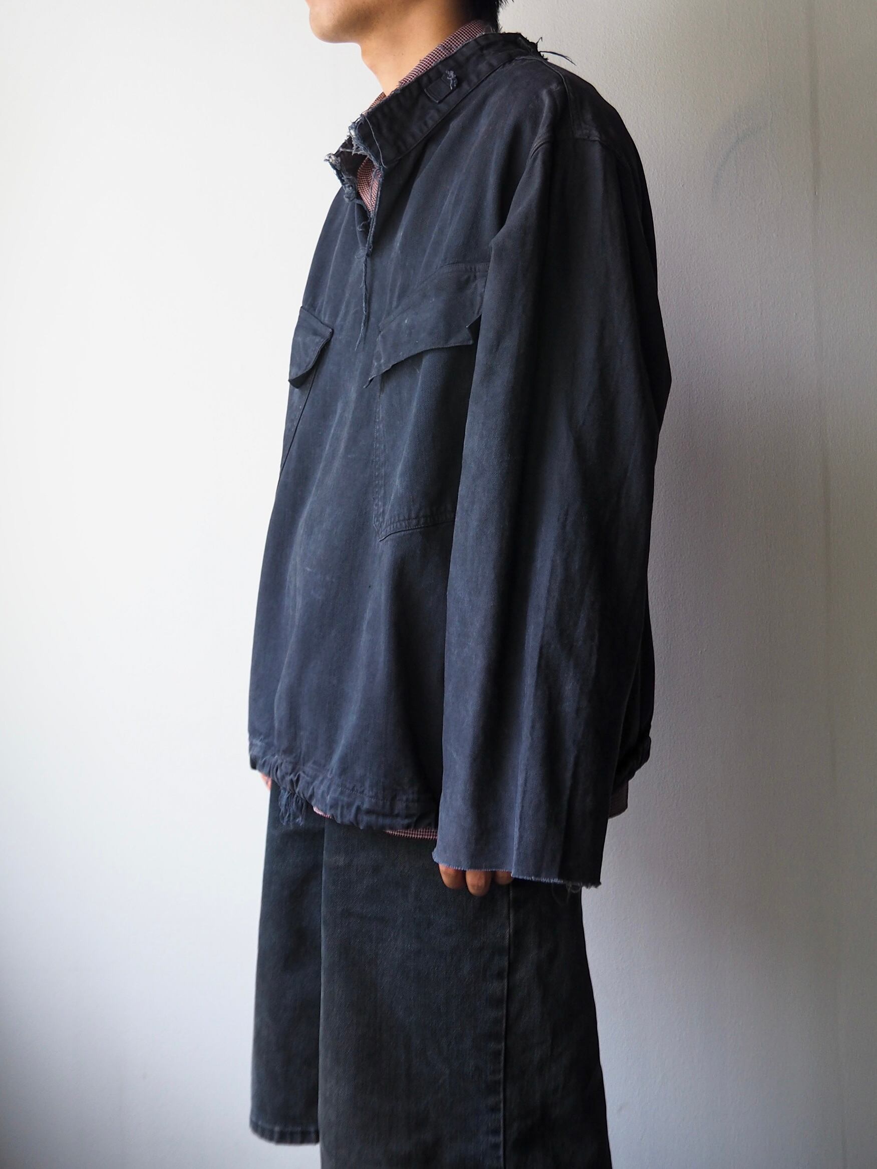 ツイル織のコットン素材にドローコード内蔵のフロントに長めの袖丈で構成されるイレギュラーなバランス。傾斜のついた二対のフラップポケット。オリジナルに限りなく近い形で製作されています。
