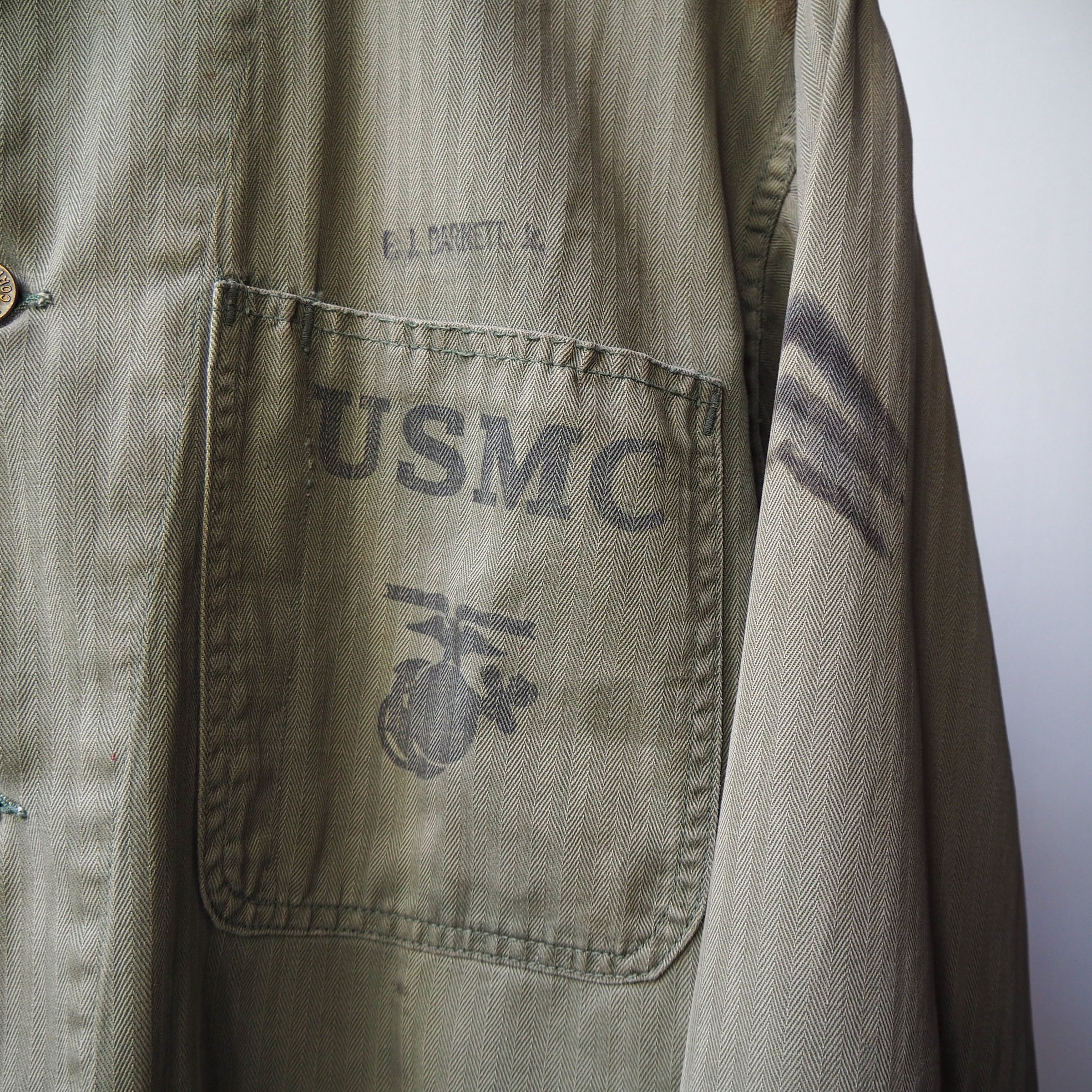 胸元には大鷲が鎮座する地球をイカリが貫いた<U.S.M.C>にアイコニックなステンシル、当時の着用者のネーム、左腕には三等軍曹のステンシルが入ります。