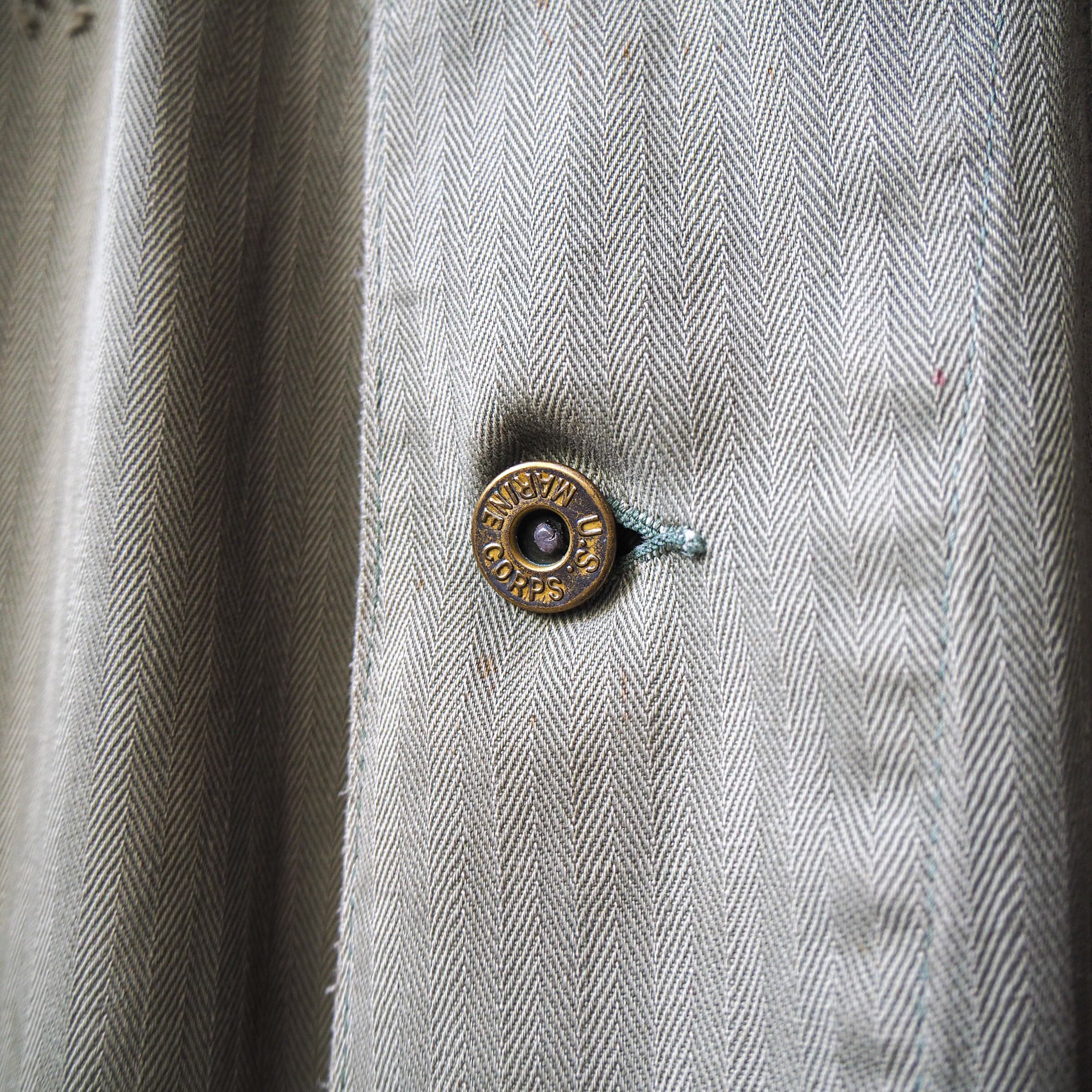 フロント、袖口には<U.S. Marine Corps>の刻印が入るドーナツボタン。鉄と錫の含有量が異なるのでしょう、ラッカーが剥げ落ちた後の色味が最下部のものだけシルバー色が強く、ワッペンでは無く簡易的なステンシルで表された階級章からも大戦中の厳しい物資統制の背景が窺えます。