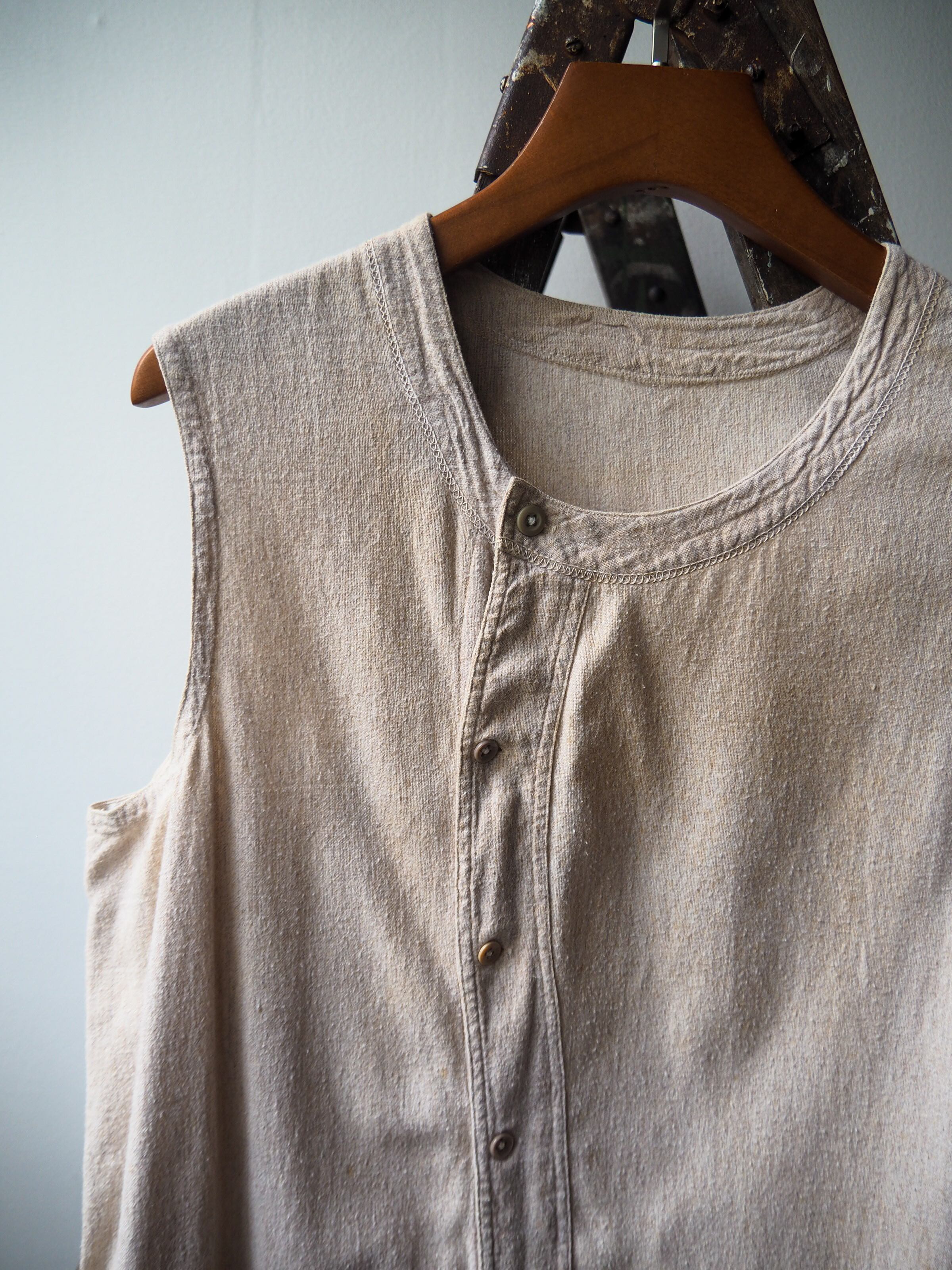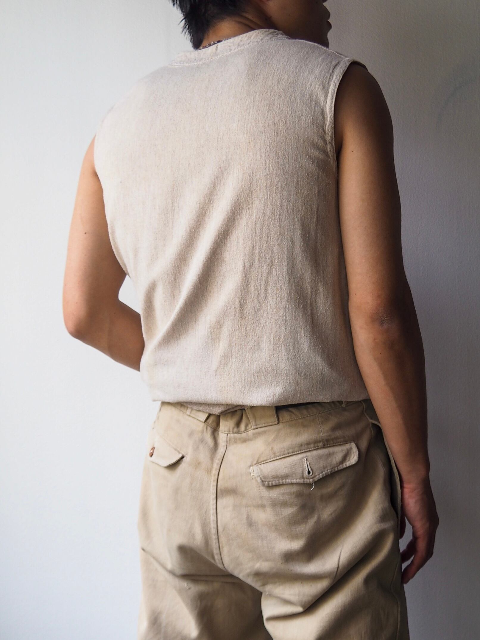 一般的なタンクトップと比べ肩幅、身幅共にしっかりと広めに取られているためだらしなく見えることもなく、秀逸なアシンメトリー設計に素朴なカラーリング、経年により味わいを増した風合いはモードでアルチザンな雰囲気に満ち溢れております。