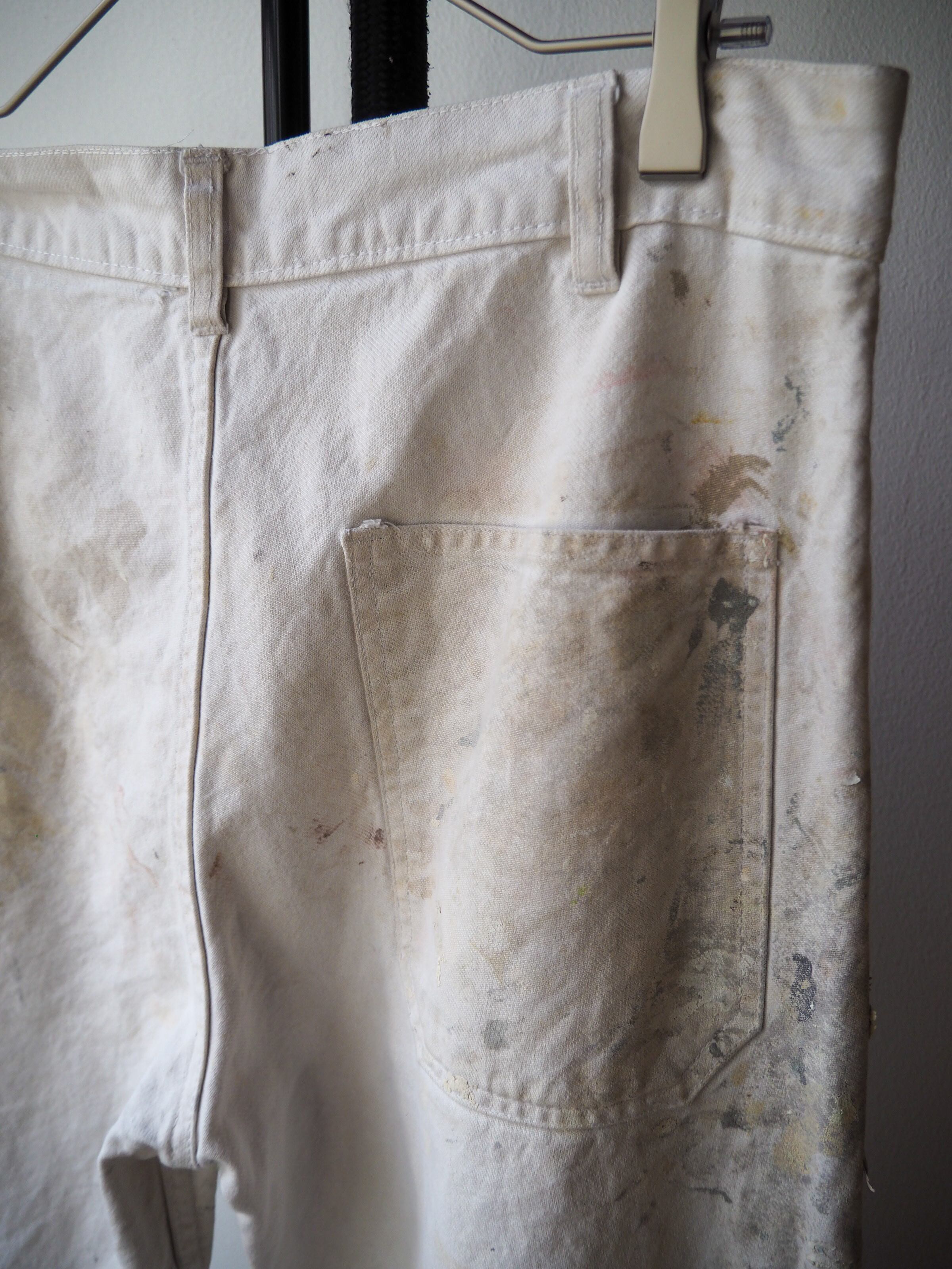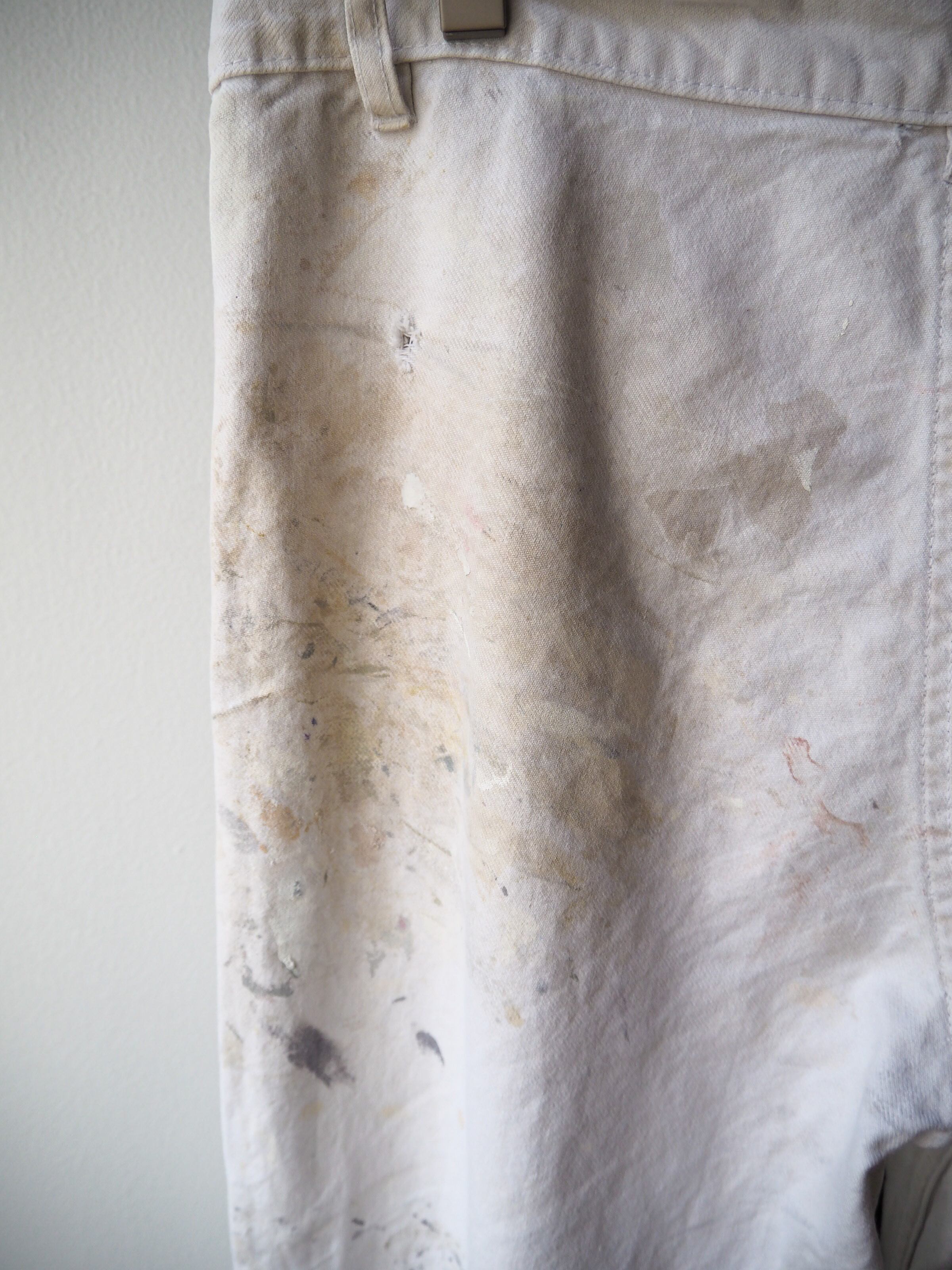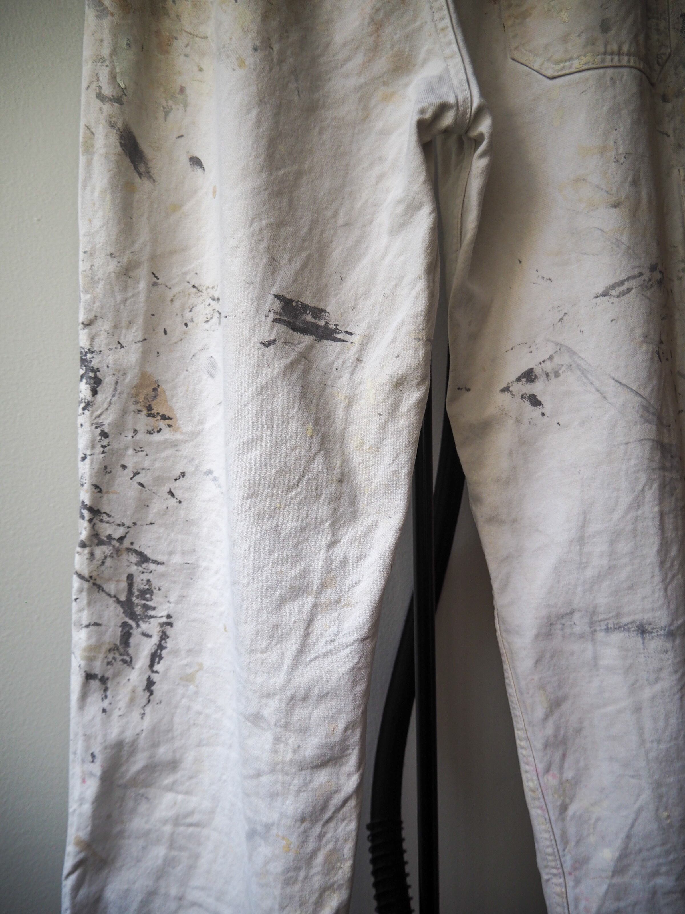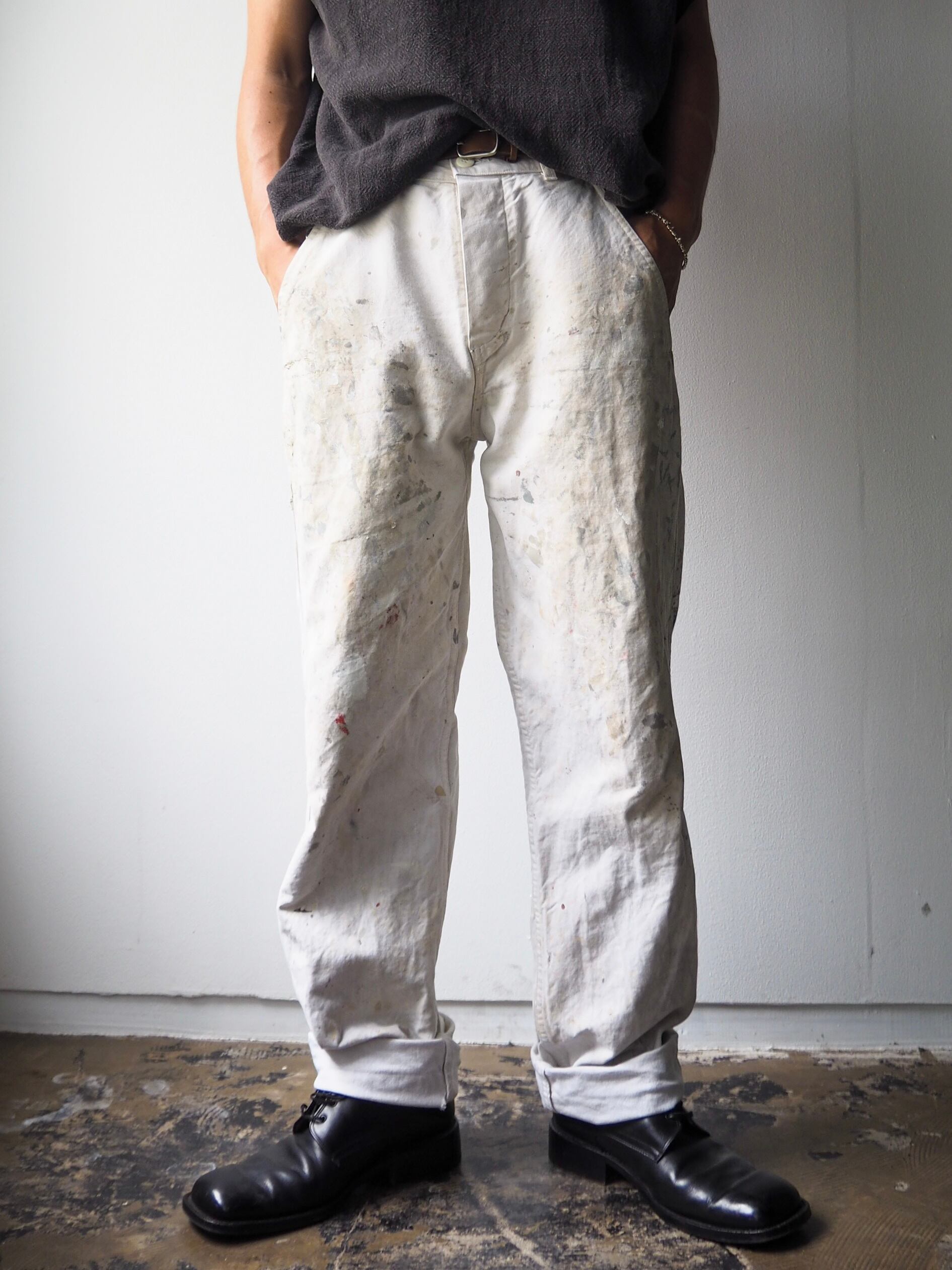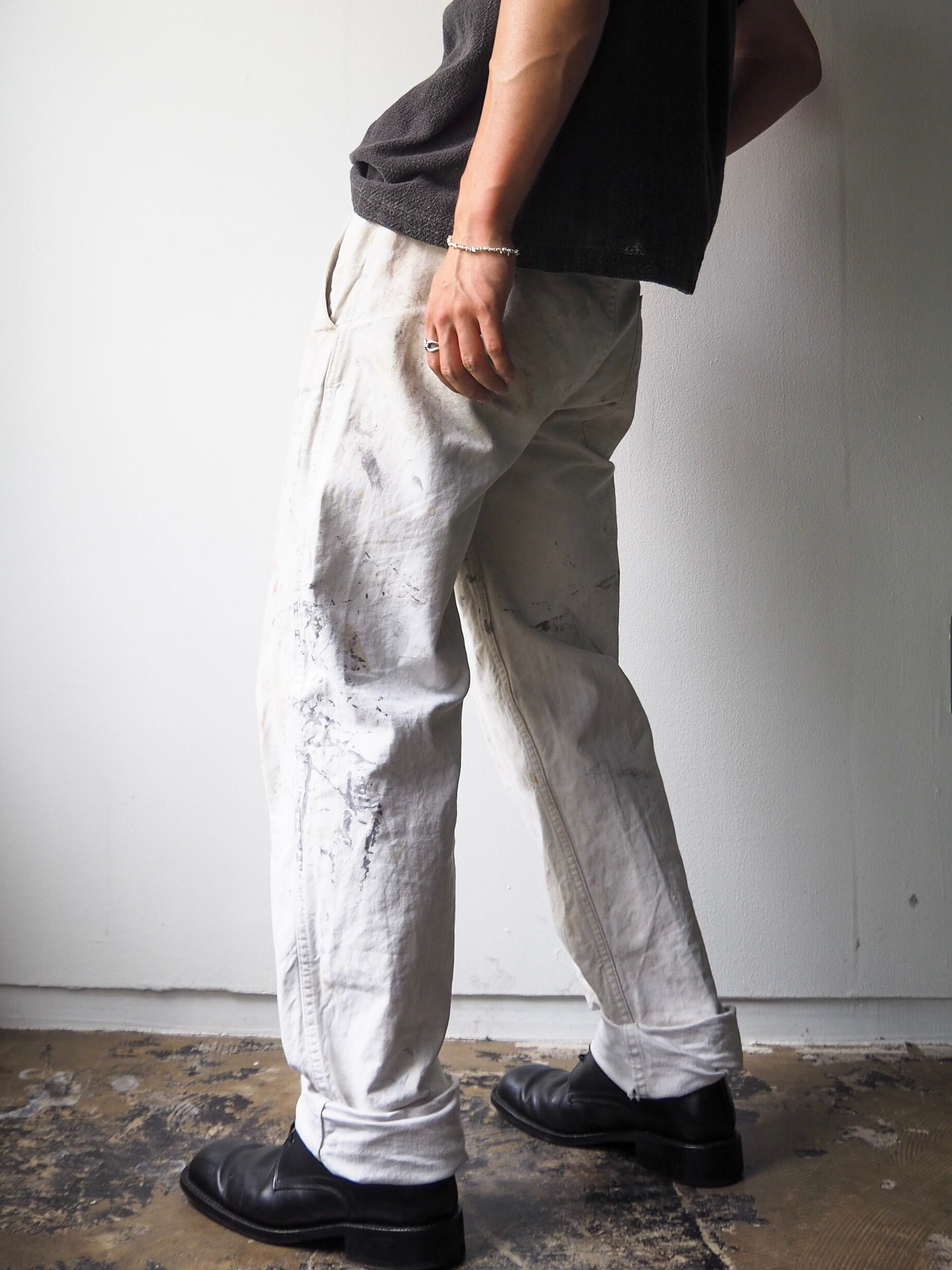 使い込まれ、柔らかさの加わったタフなコットンツイルに全面に厚く飛散したペンキ跡が目を惹く1本。