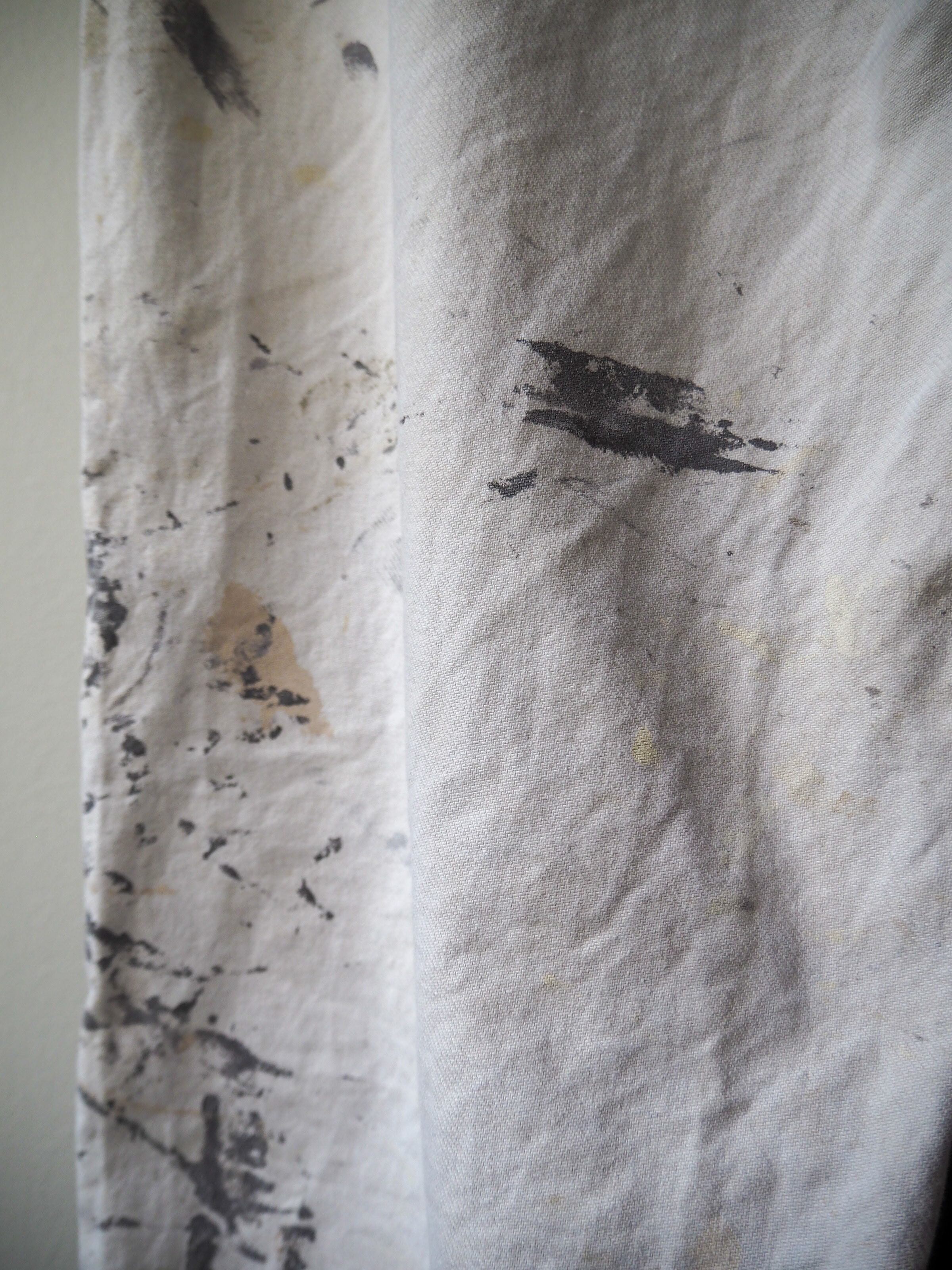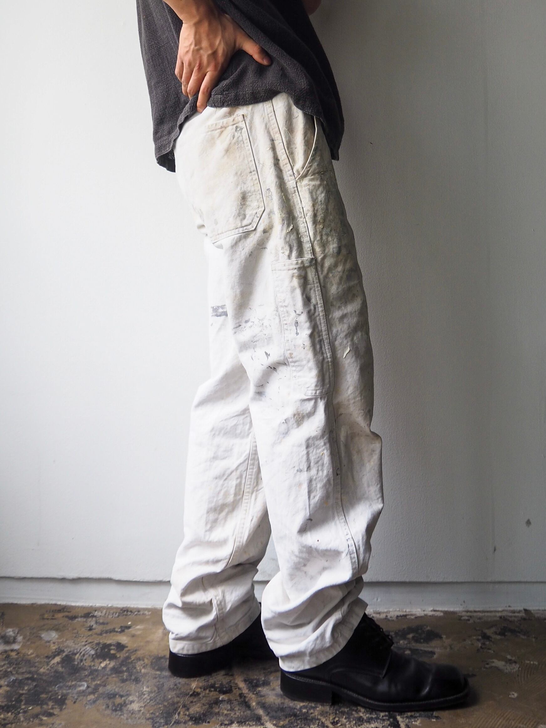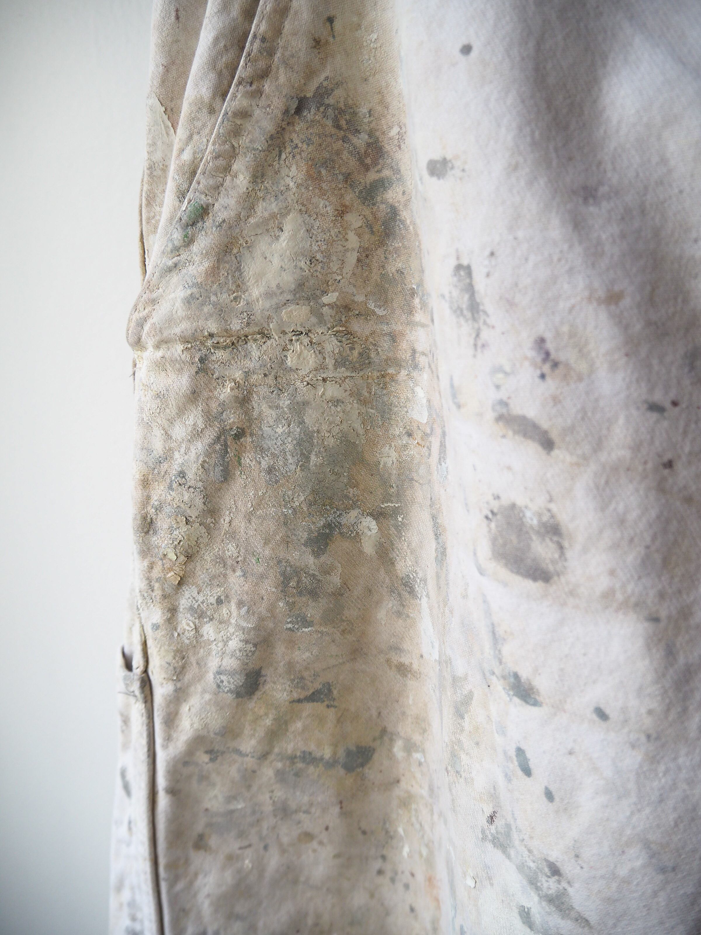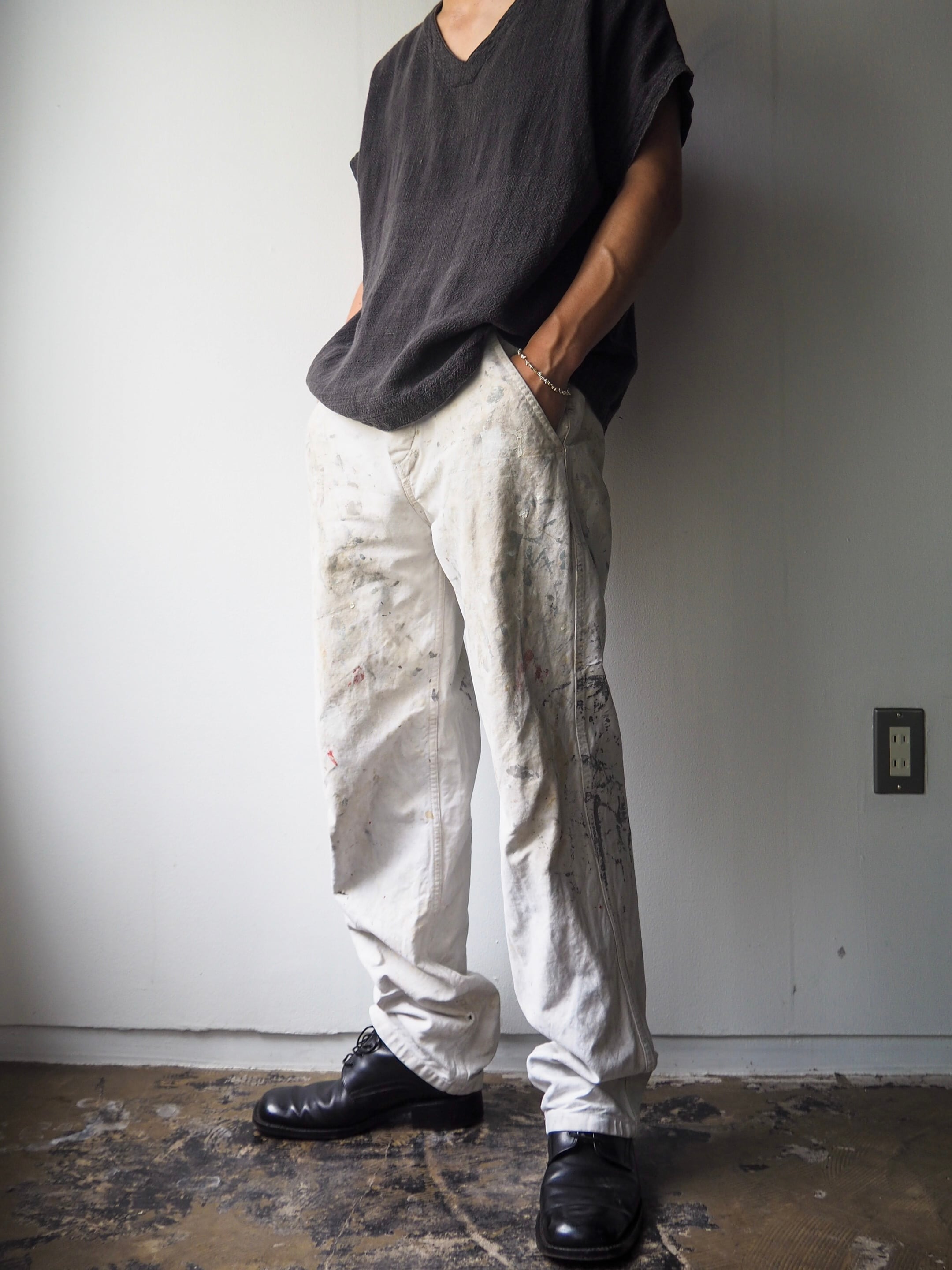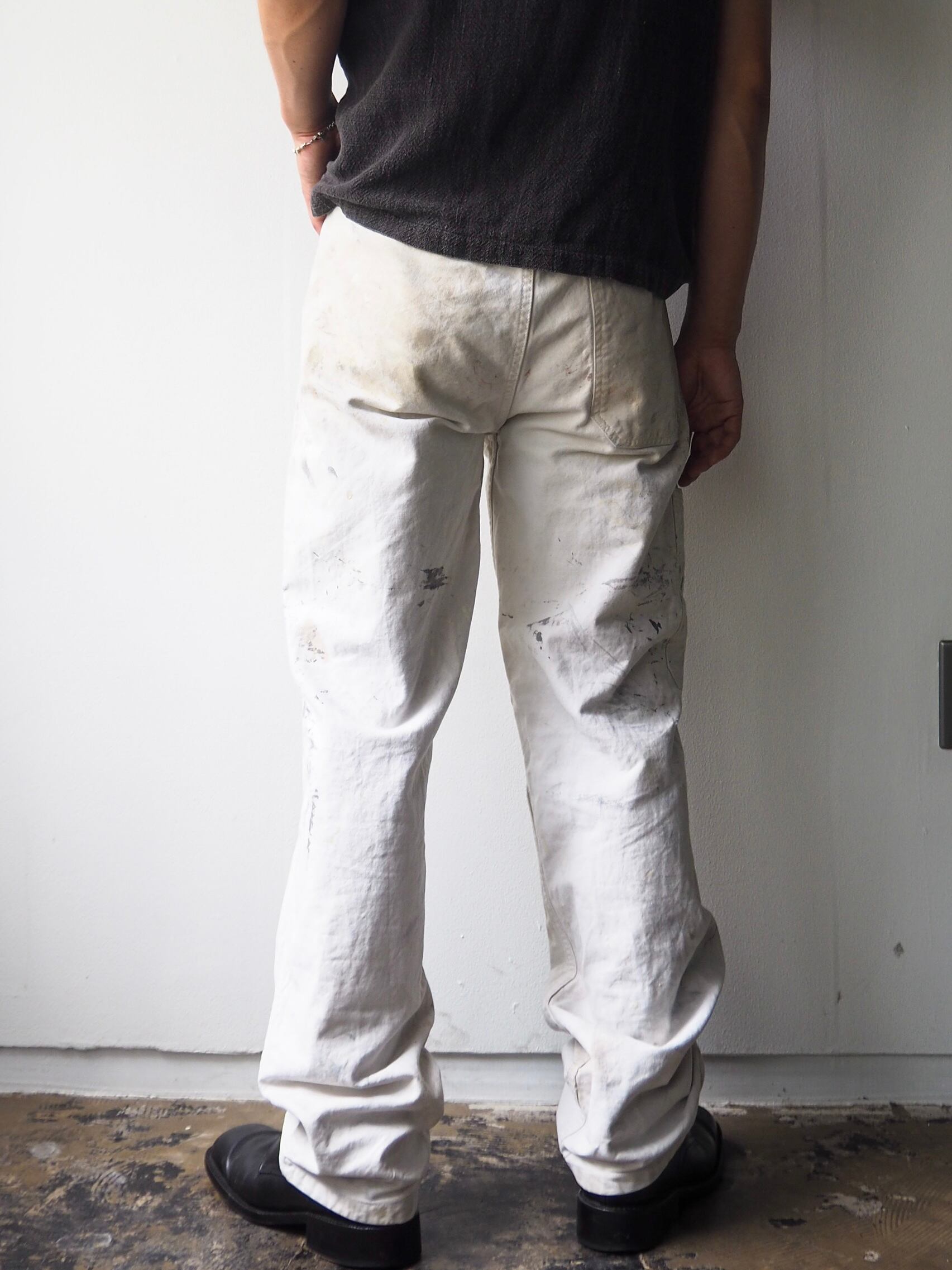 使い込まれ、柔らかさの加わったタフなコットンツイルに全面に厚く飛散したペンキ跡が目を惹く1本。