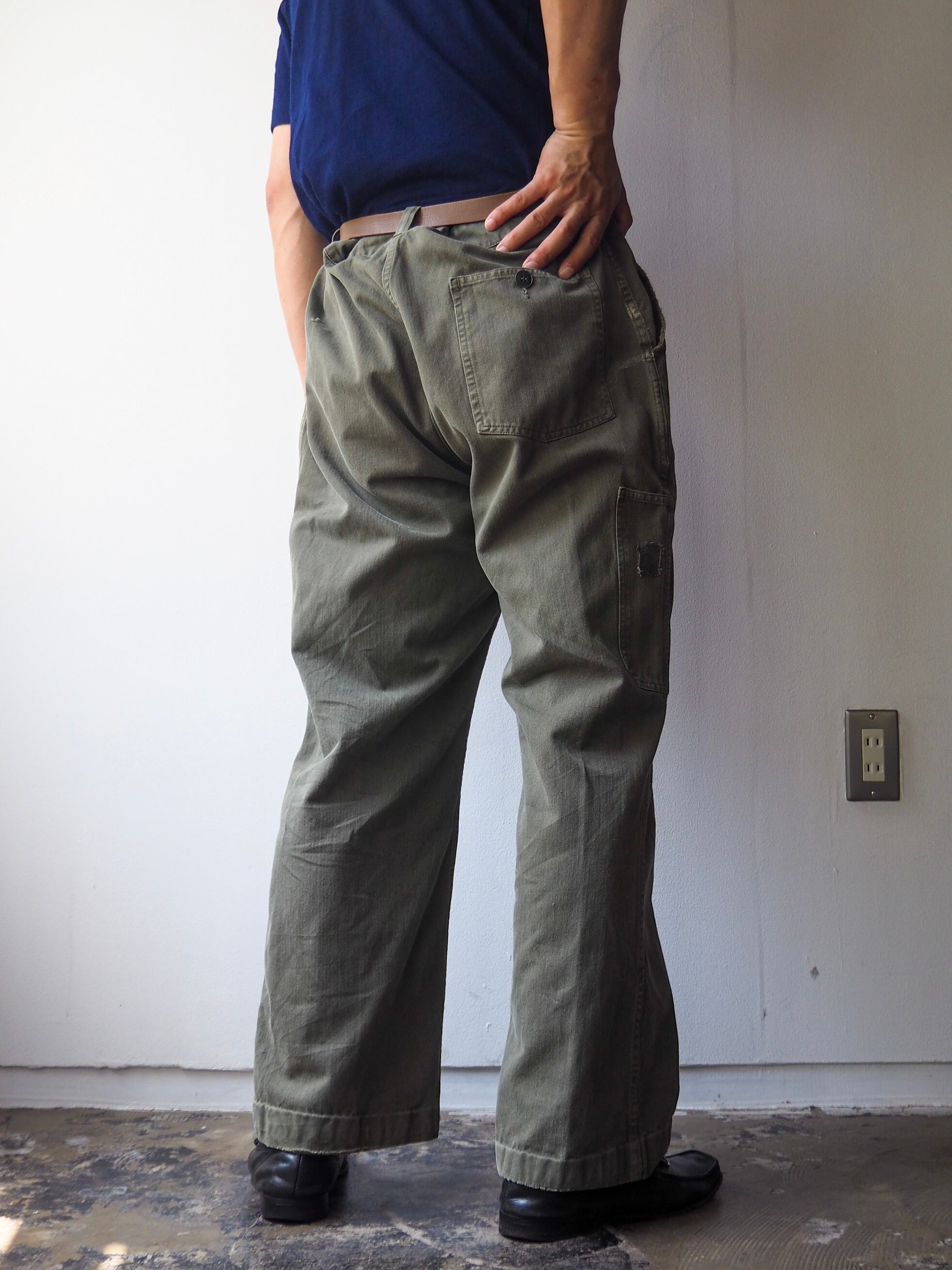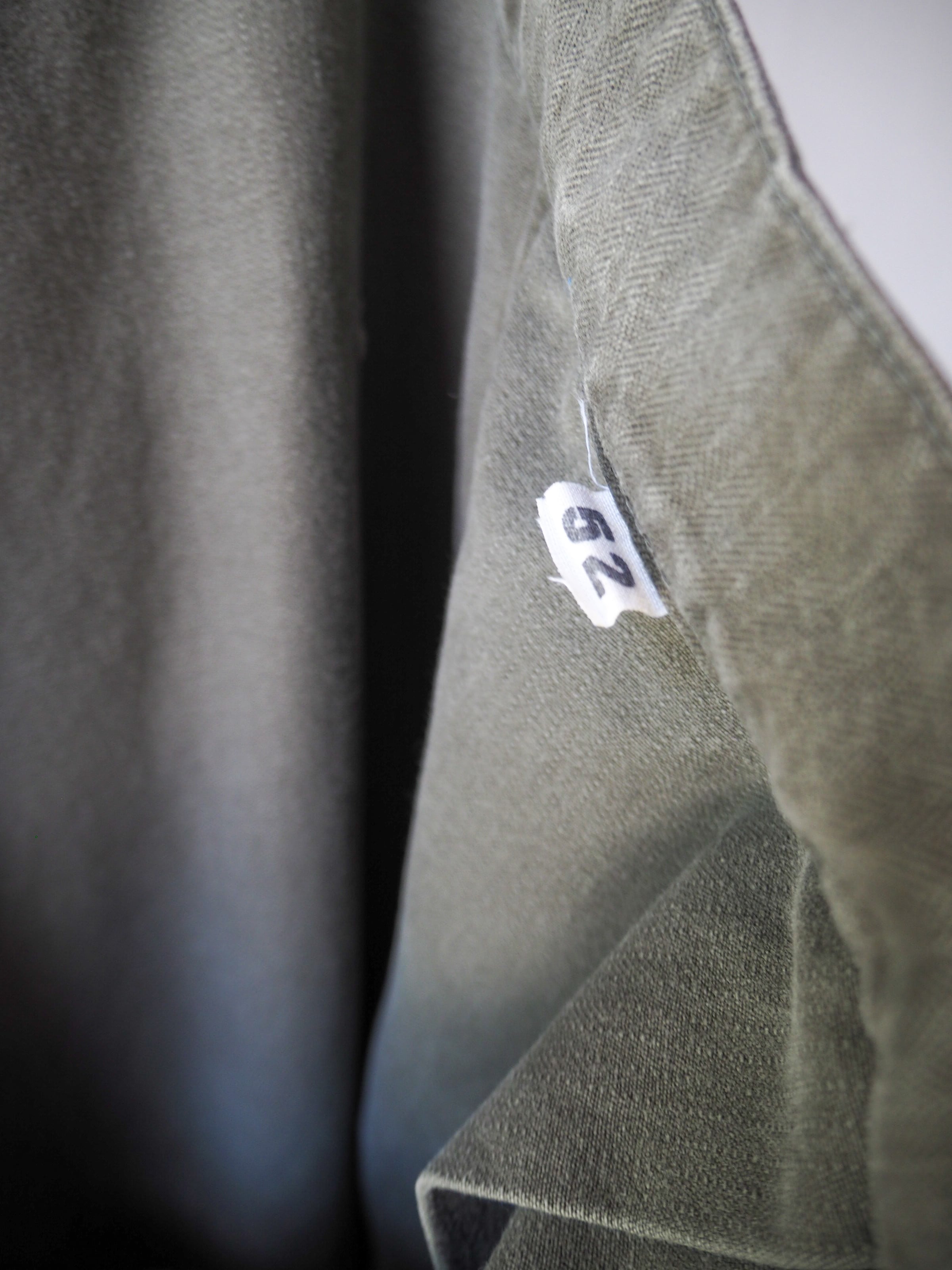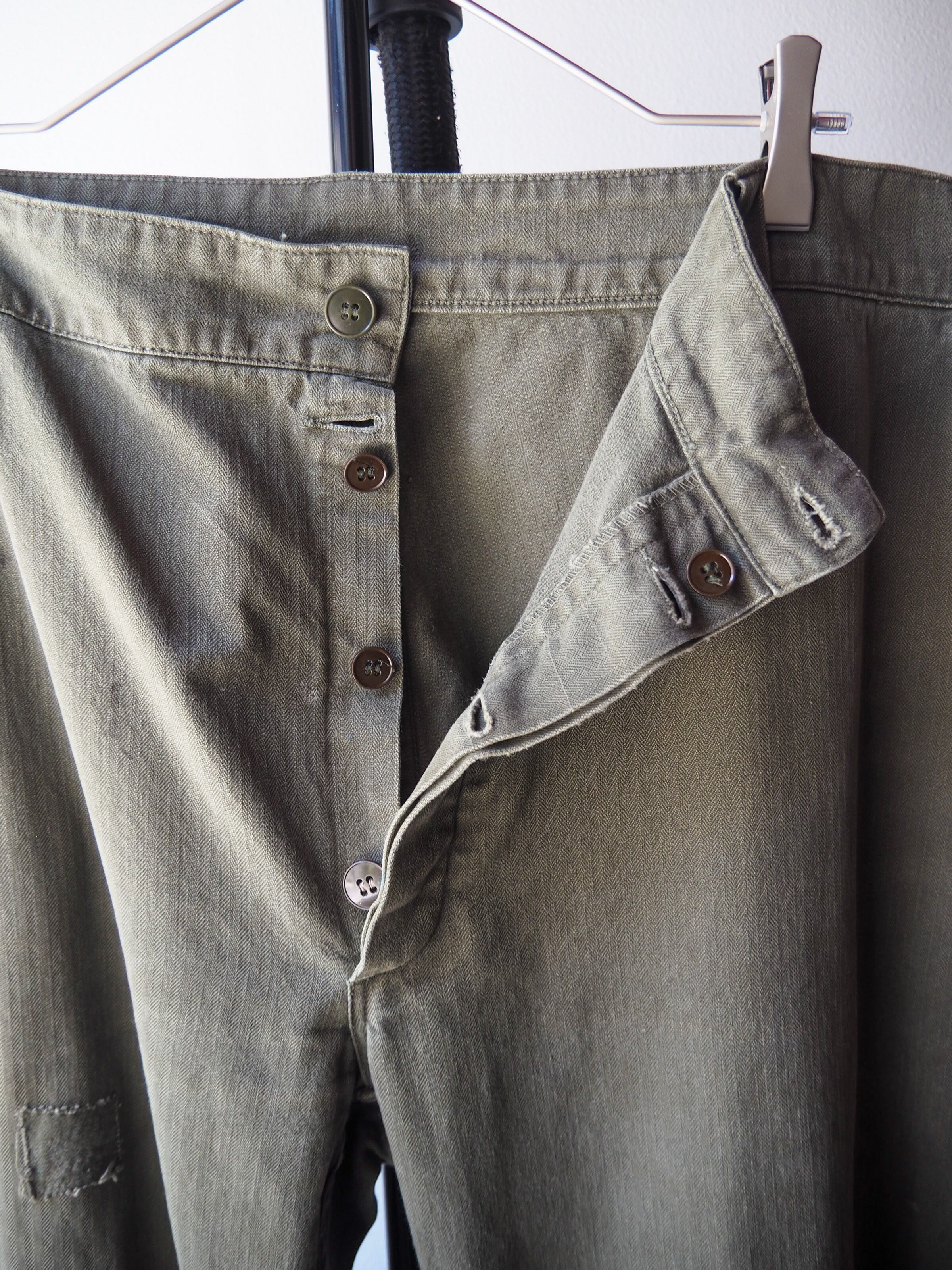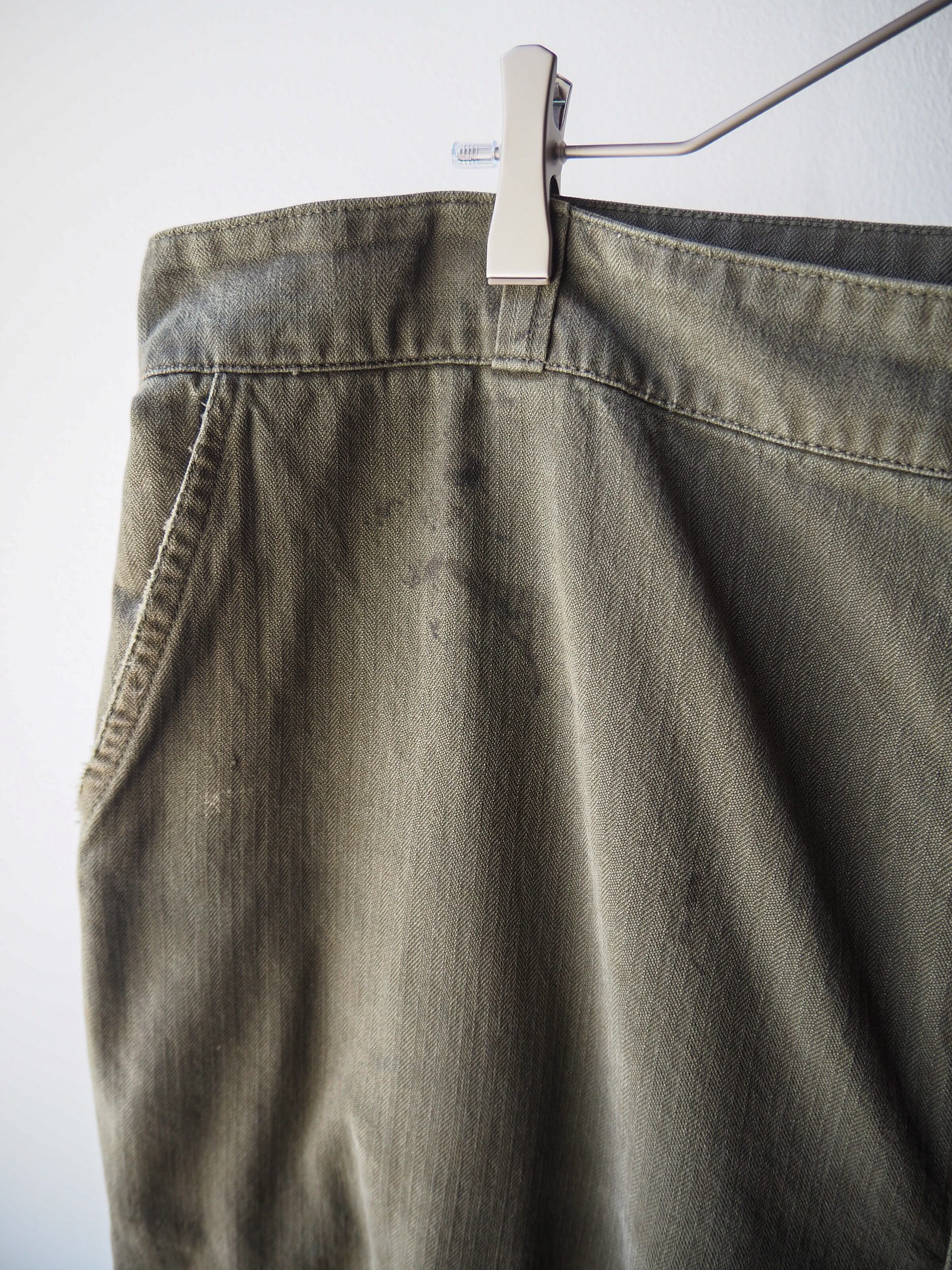 肌触りが良く、柔らかな素材感のヘリンボーンツイル生地。軍から払い下げられた余剰の生地を使用した民間品、もしくは軍内で個人用に仕立てられた一本でしょう。