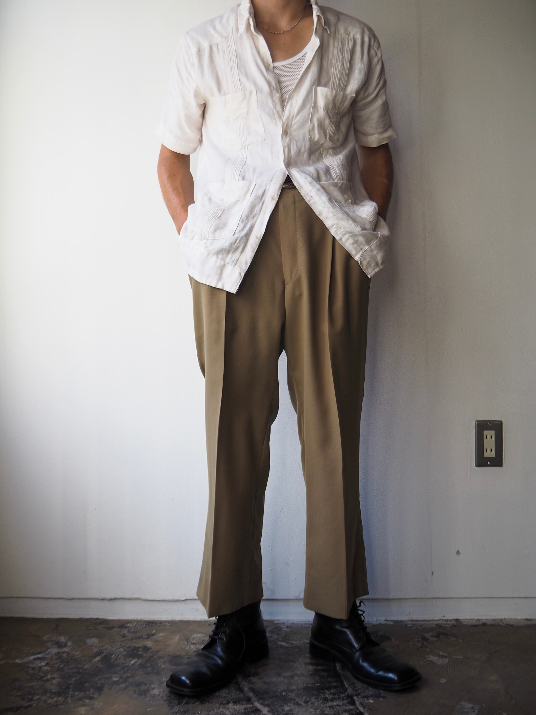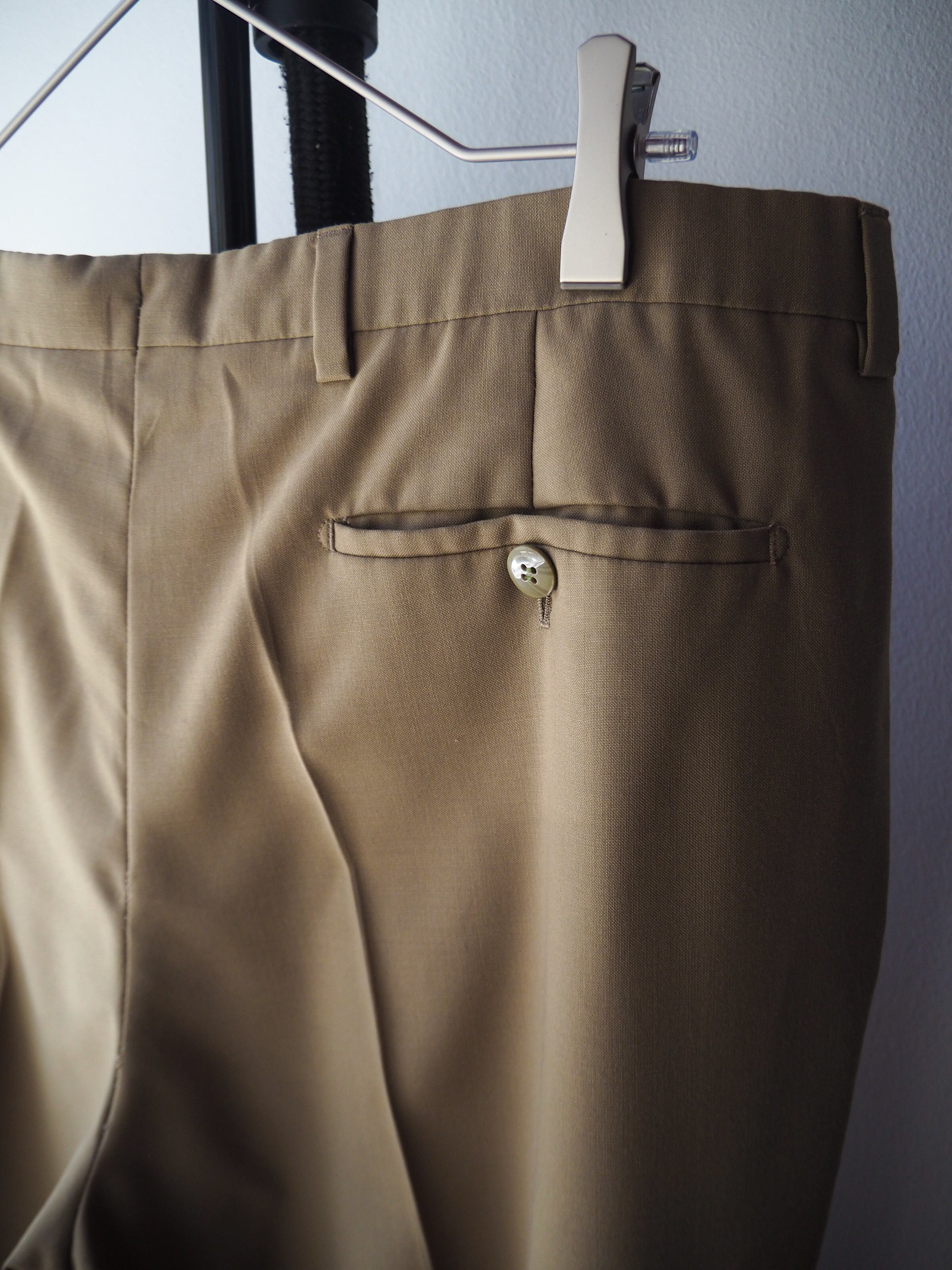広めに取られたヒップ周りから裾先にかけてゆるりとテーパードのかかる美しいシルエットライン。落ち着いたカラーリングにクセのないシルエットですので様々な着合わせでお楽しみ頂けるかと思います。