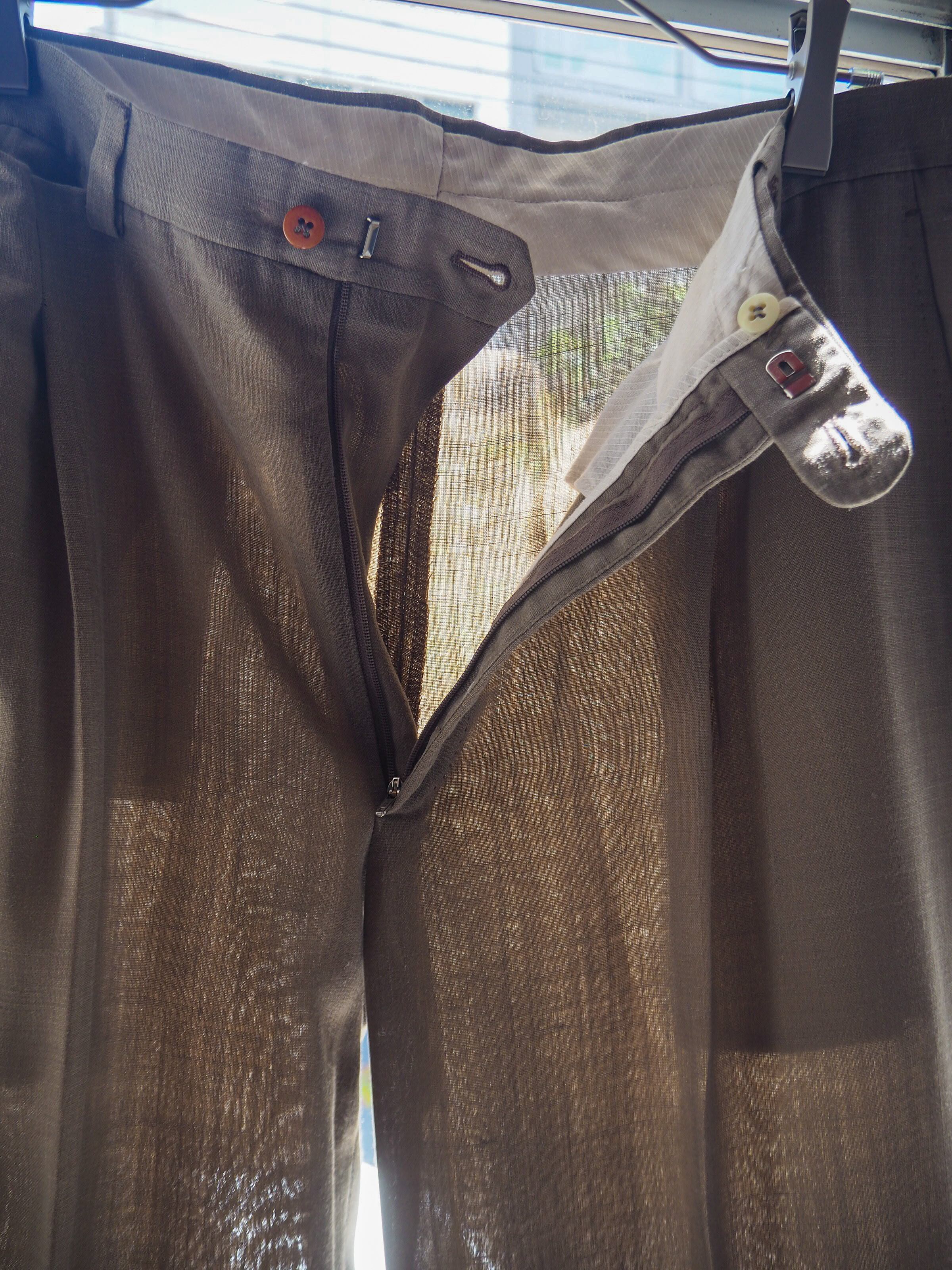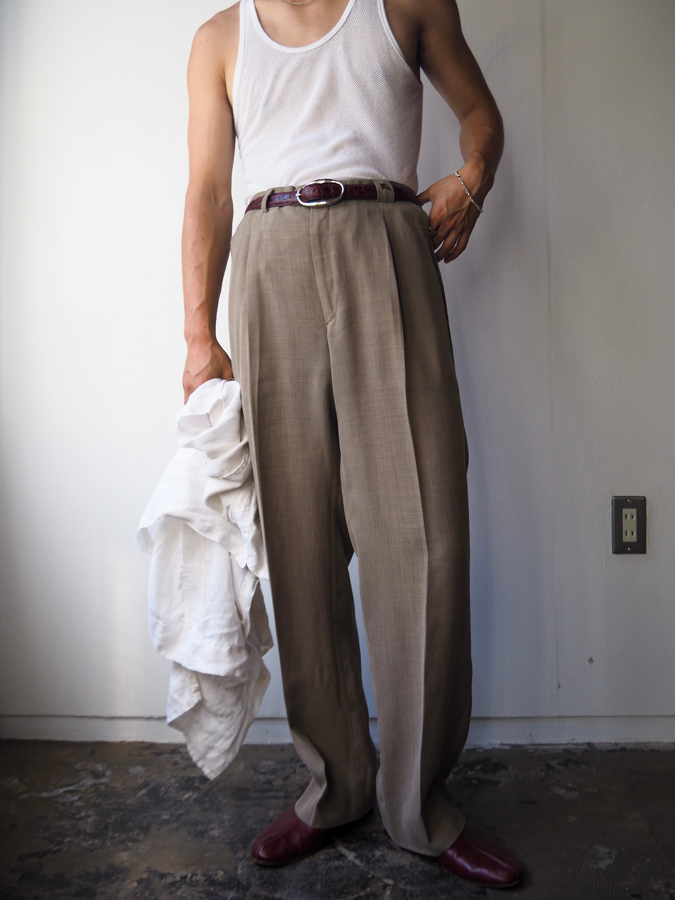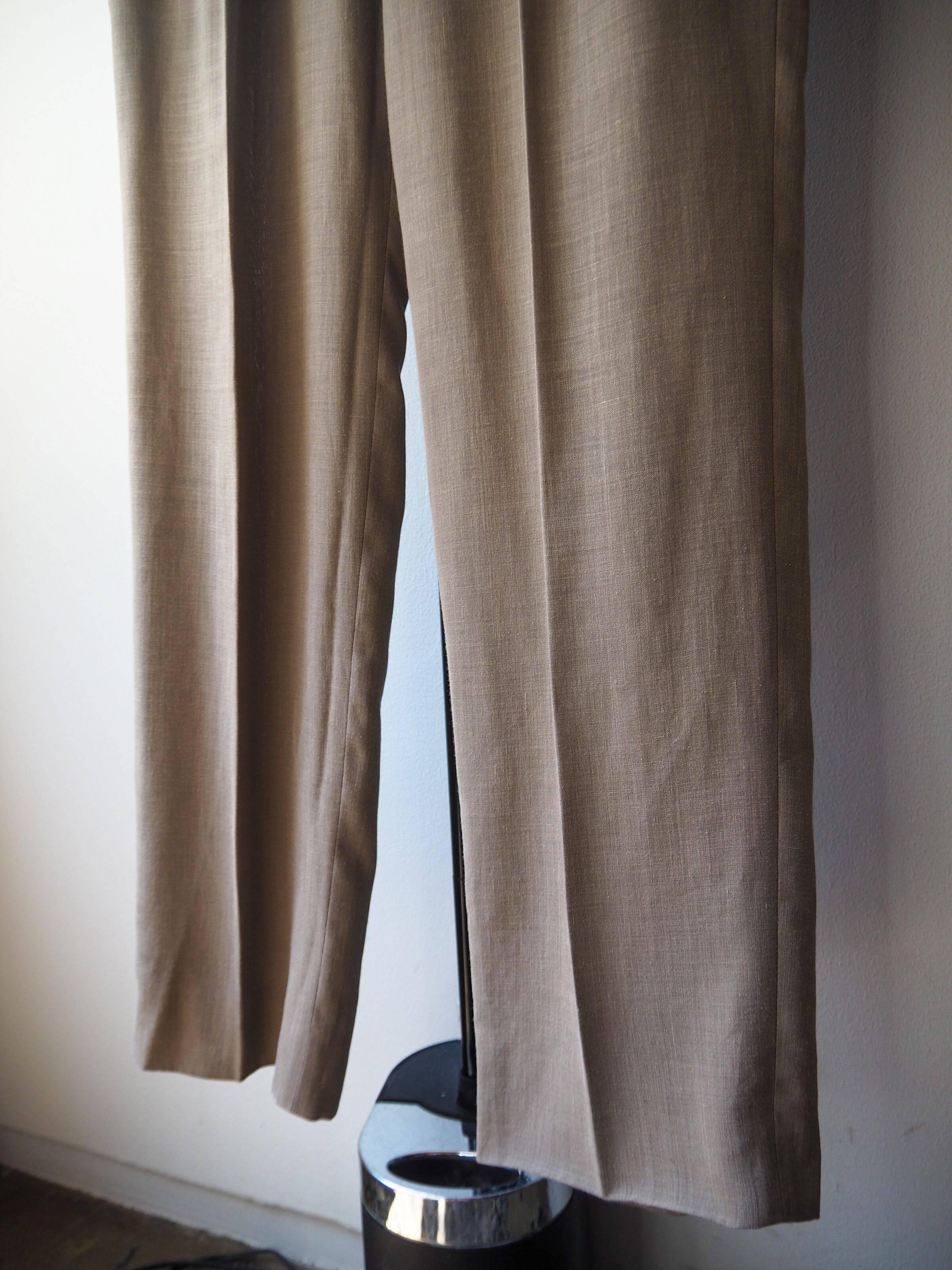 広めに取られたヒップ周りから裾先にかけてゆるりとテーパードのかかる美しいシルエットライン。落ち着いたカラーリングにクセのないシルエットですので様々な着合わせでお楽しみ頂けるかと思います。