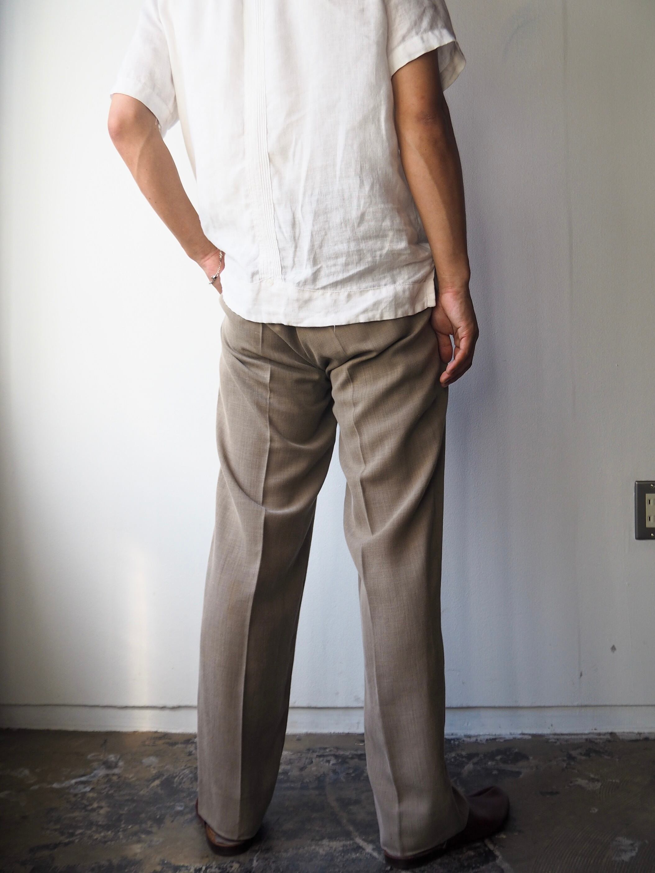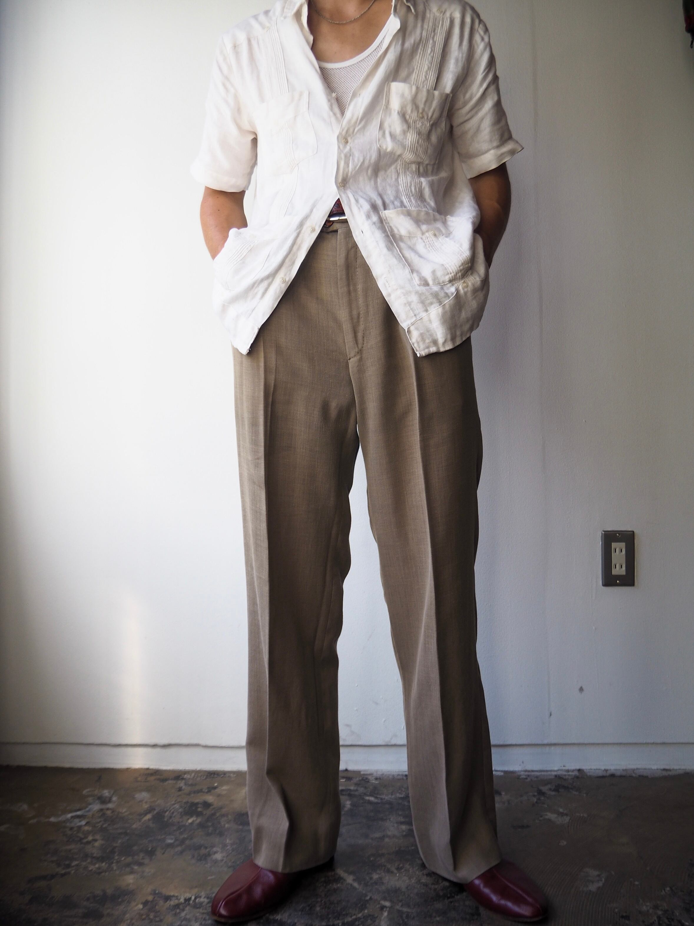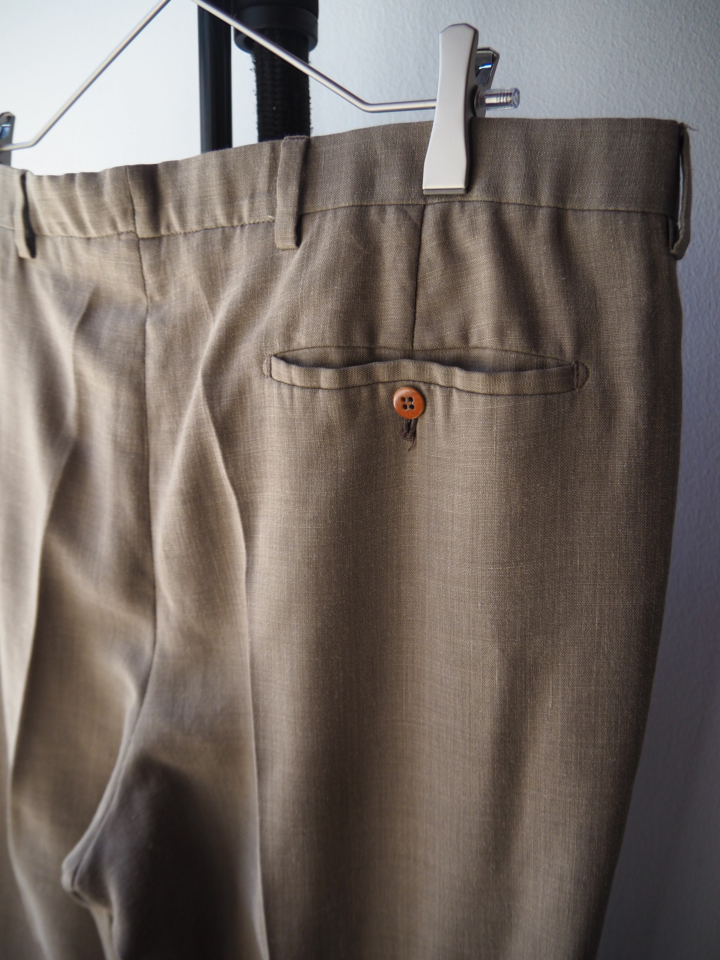 広めに取られたヒップ周りから裾先にかけてゆるりとテーパードのかかる美しいシルエットライン。落ち着いたカラーリングにクセのないシルエットですので様々な着合わせでお楽しみ頂けるかと思います。