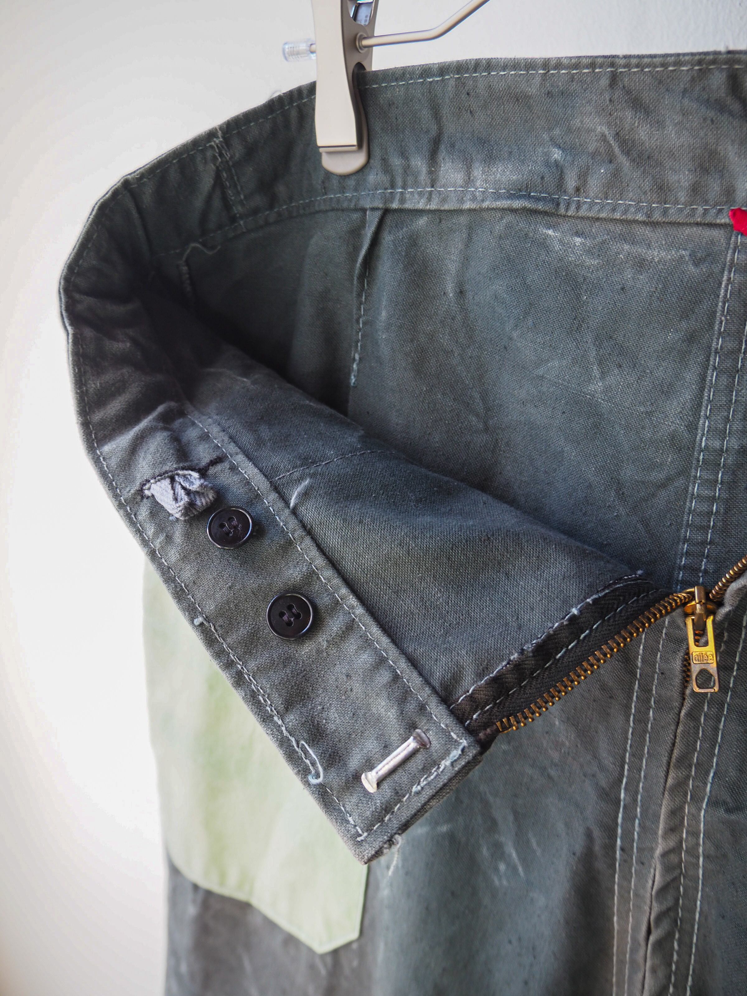フロントは真鍮の"ailee"ジッパーが付属するジップアップ式。ウエスト内部にアジャスターベルトが仕込まれているためベルトレスでお楽しみ頂けます。それでも余るようでしたら上からベルトでギュッと絞って履いてあげて下さい。