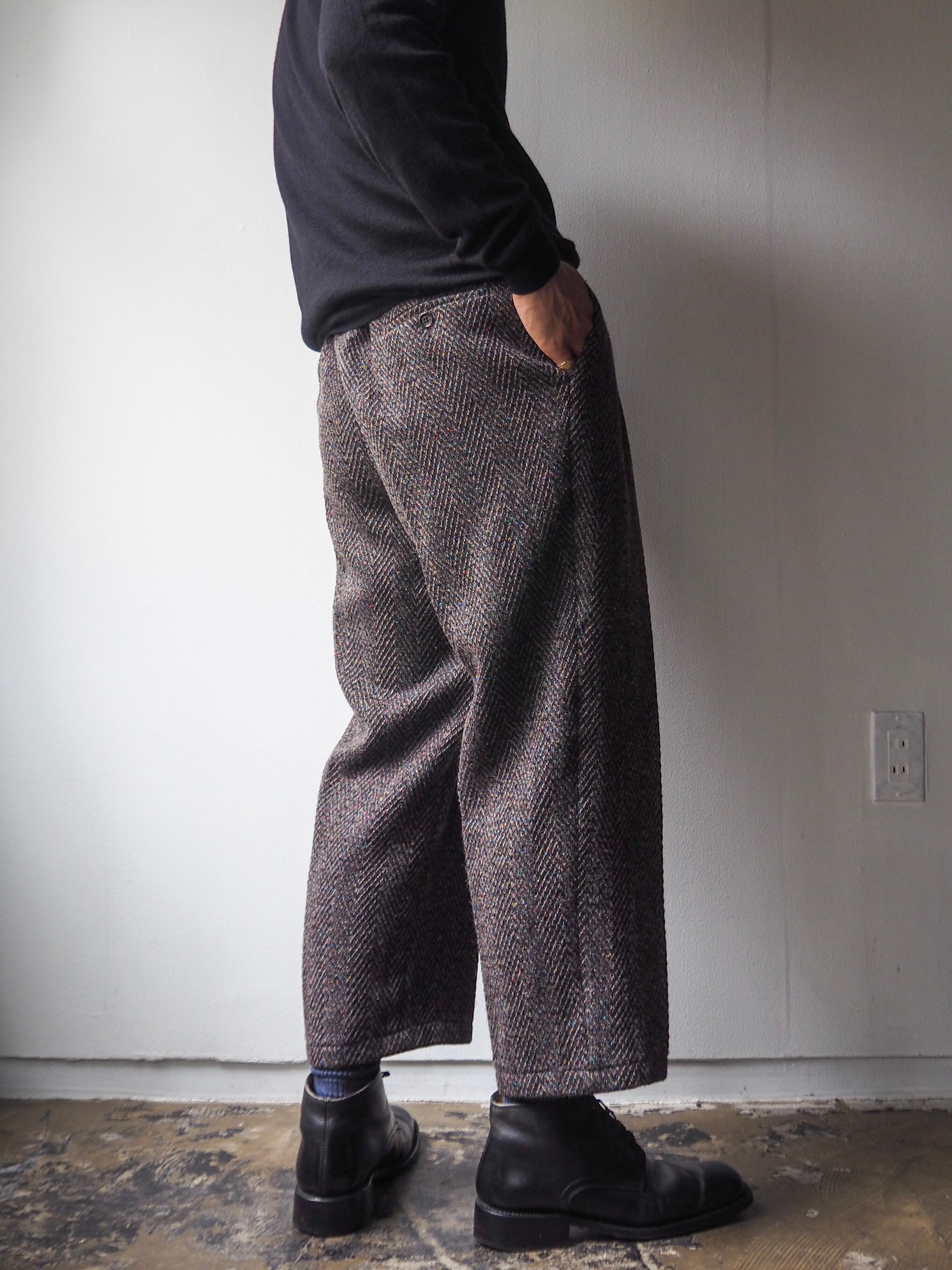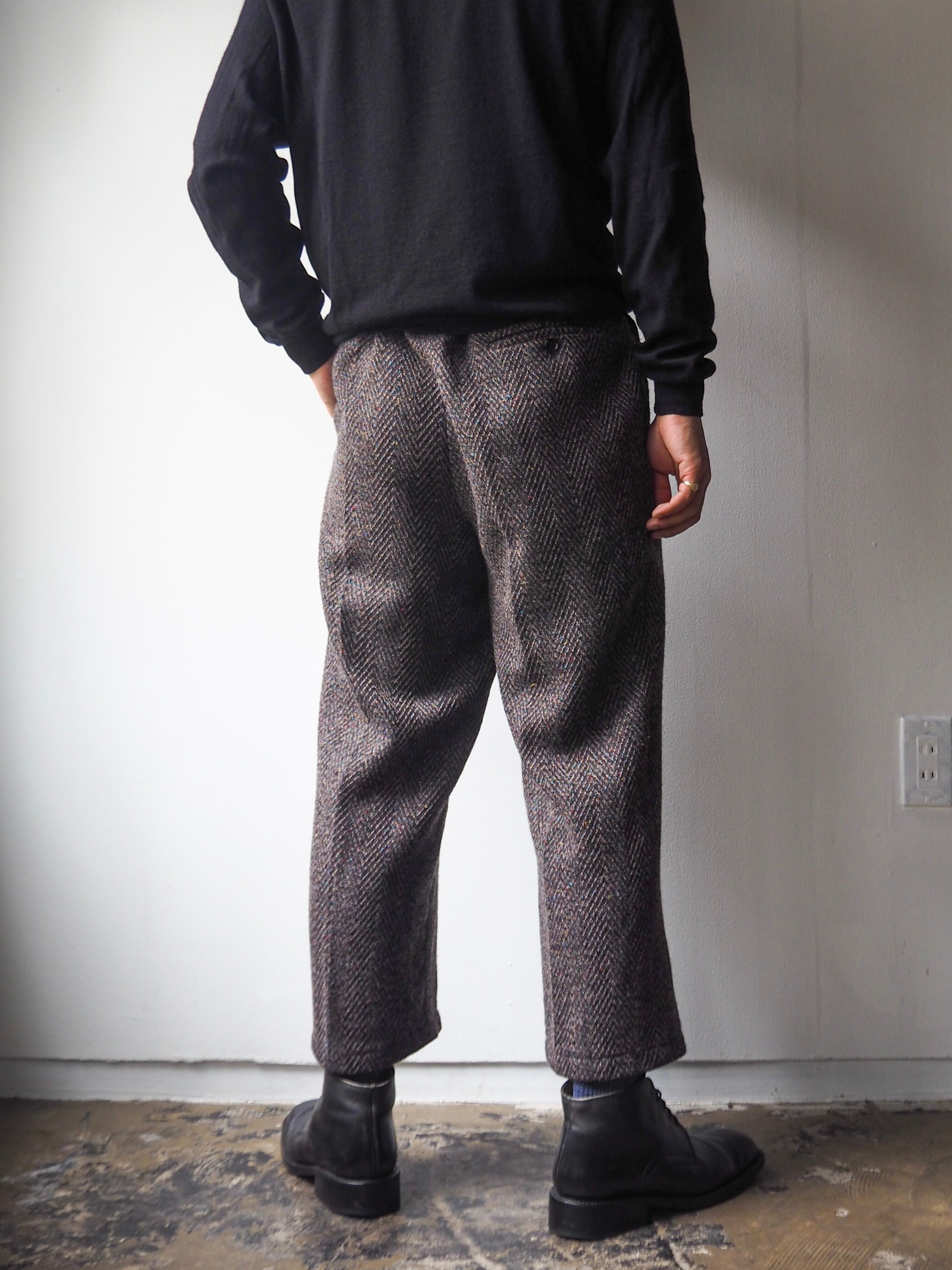 ワイド&テーパードシルエットにクロップされた裾丈。重厚な素材感ながらも着こなしのアクセントになるアンニュイなバランス感をお楽しみいただけます。