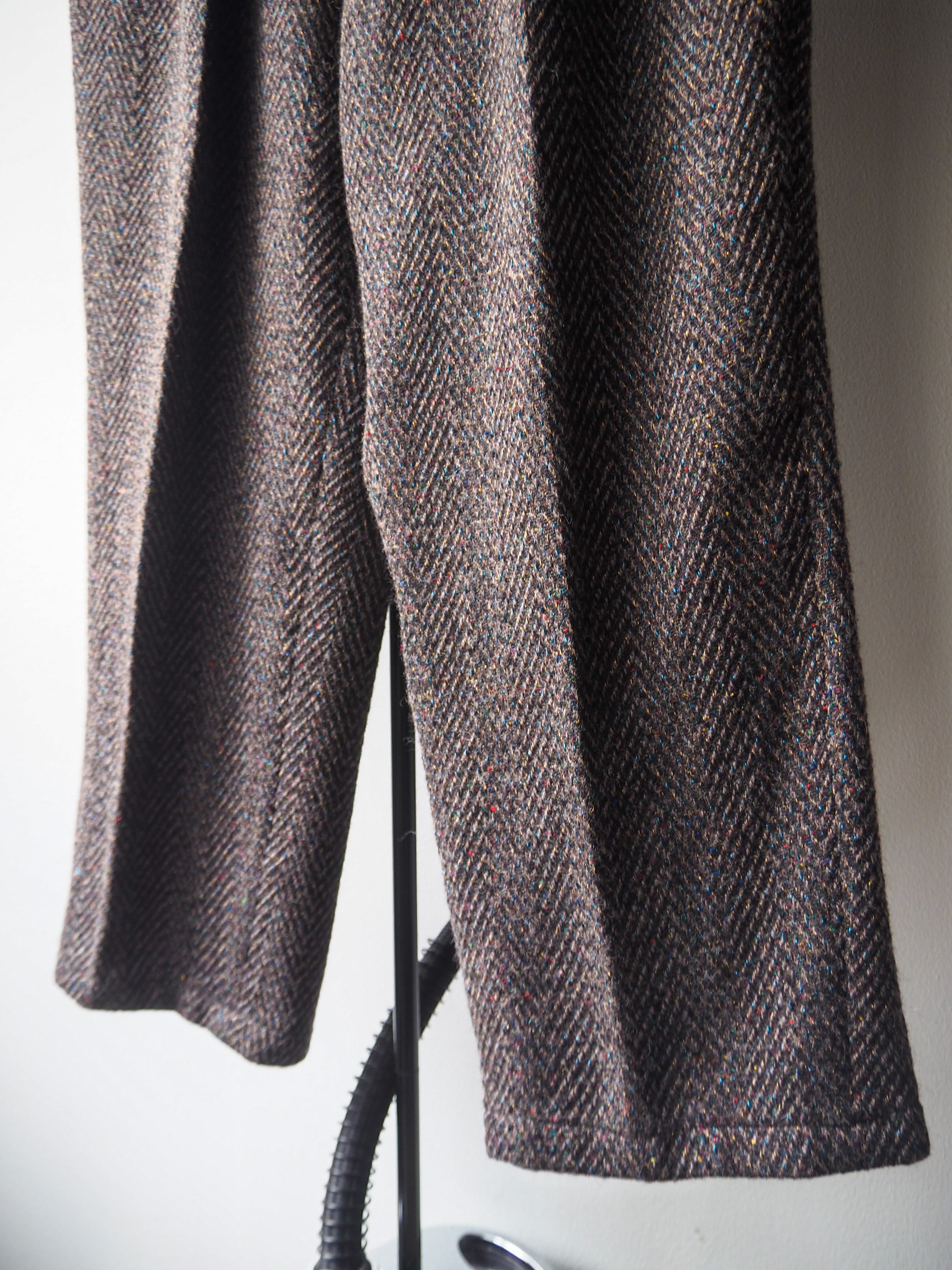 複雑で味わい深い色合いが魅力のメランジウールに独特のシルエットラインが楽しい一本。