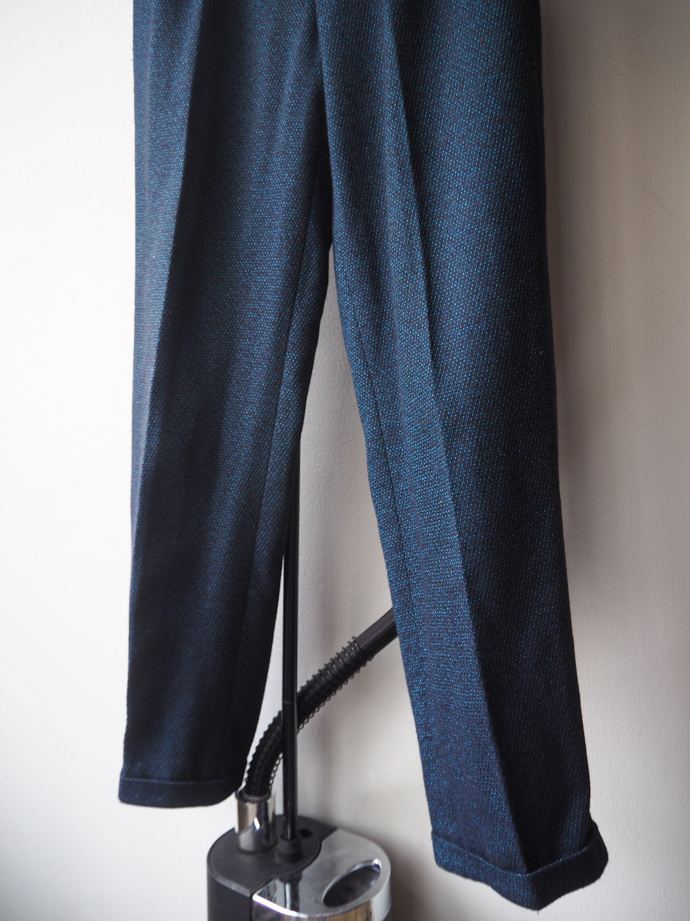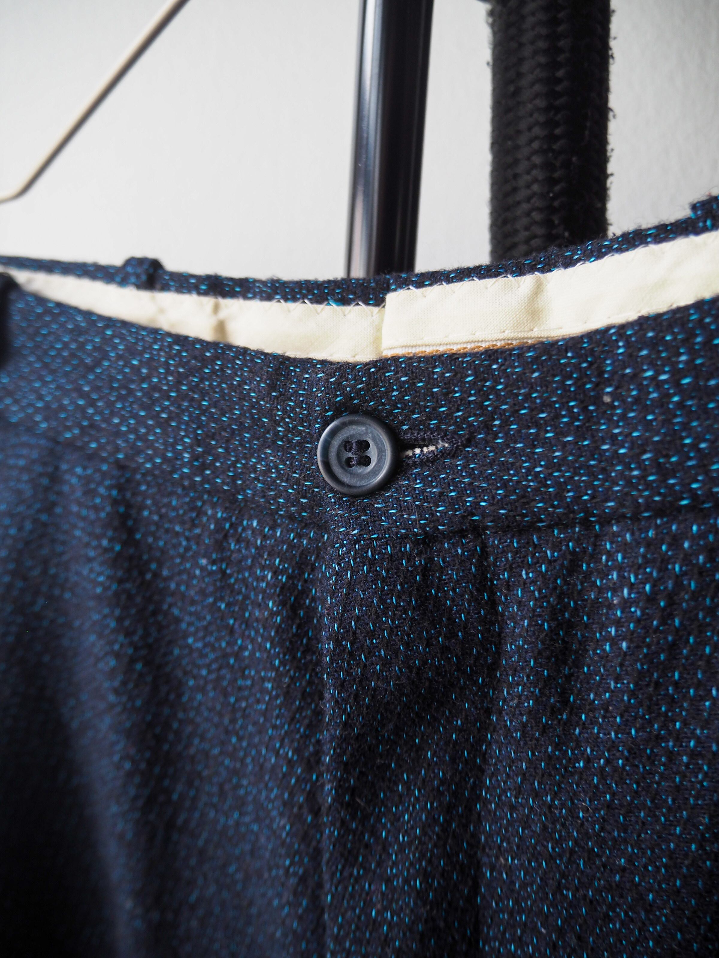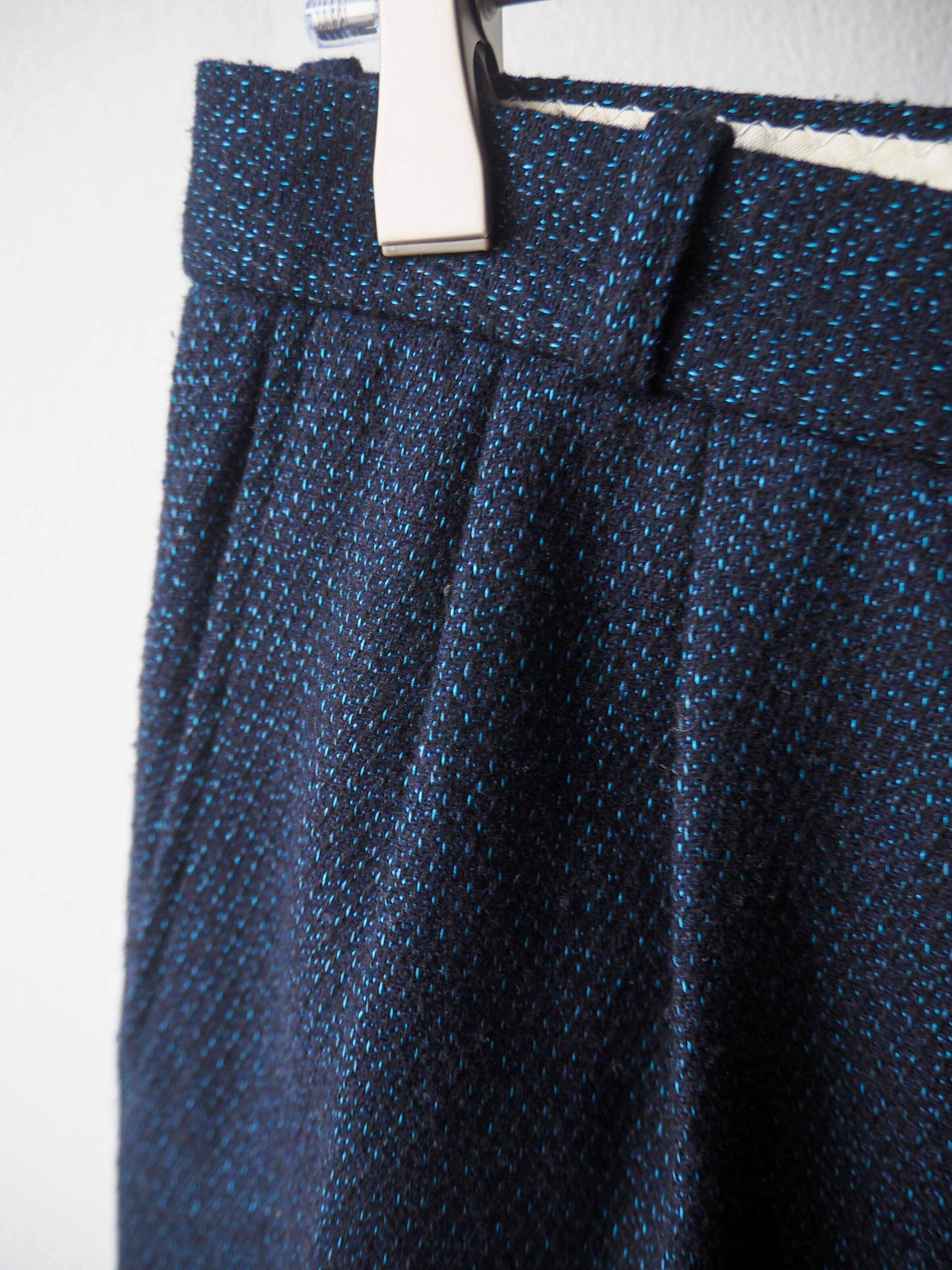 ダークネイビーのウール×ポリエステル生地に明るいブルーのアクリル糸が混ぜ込まれたソフトな生地感。